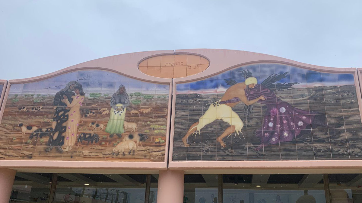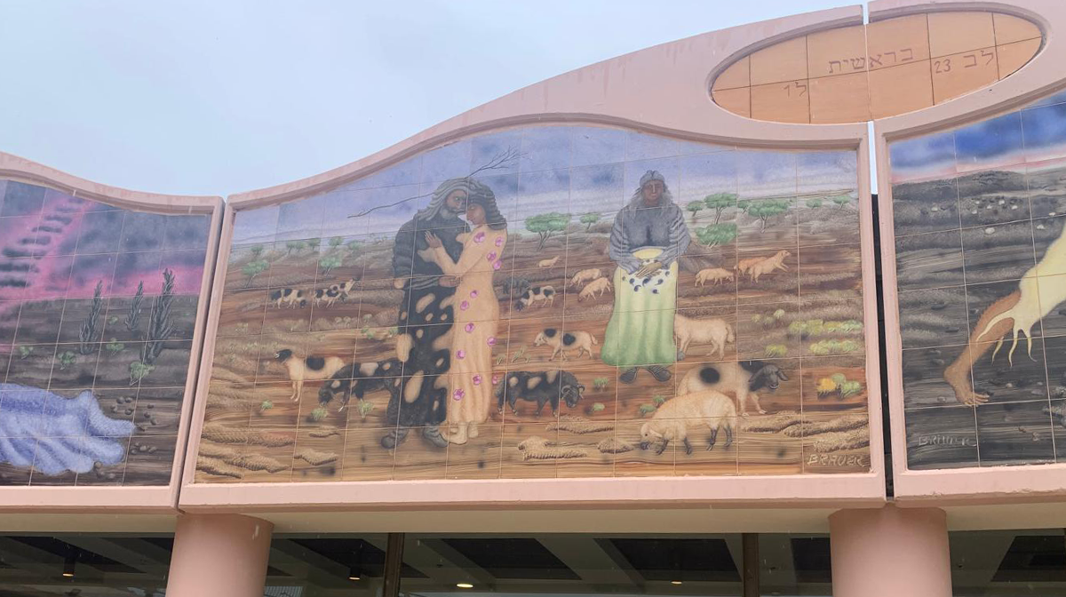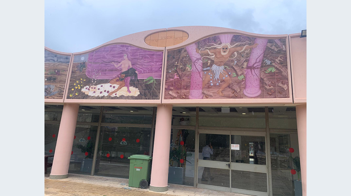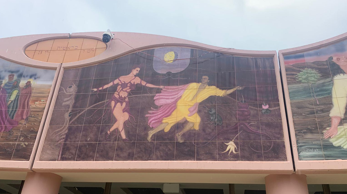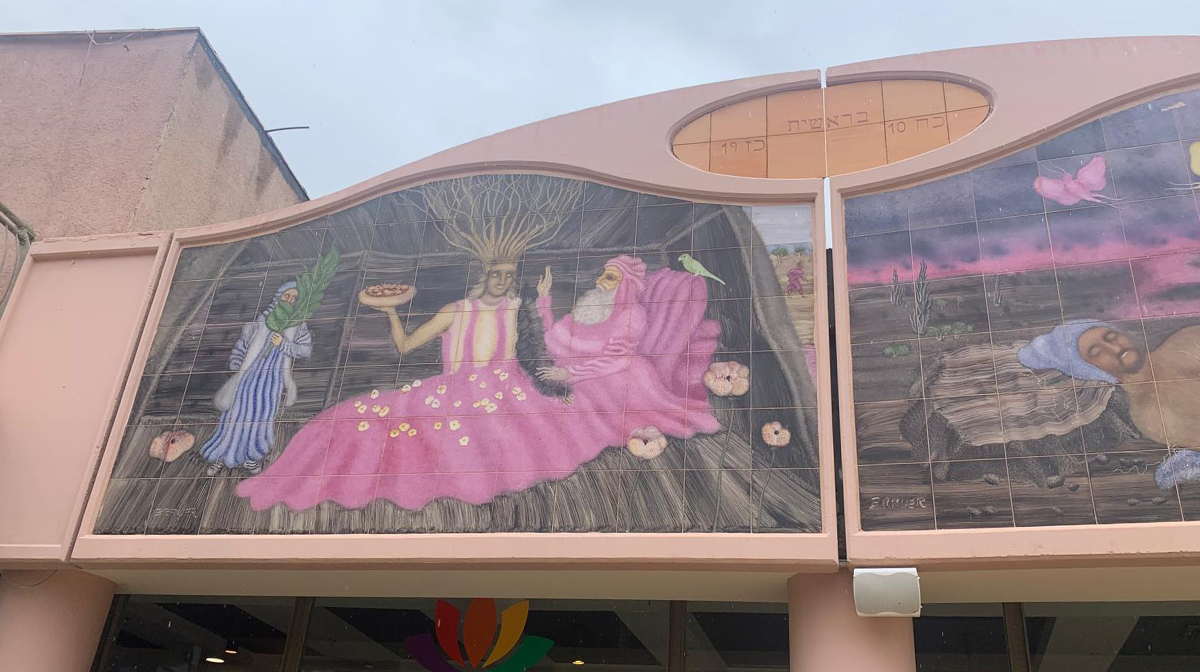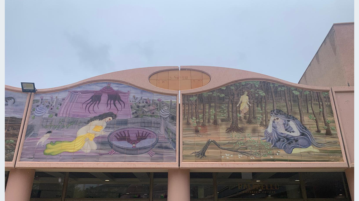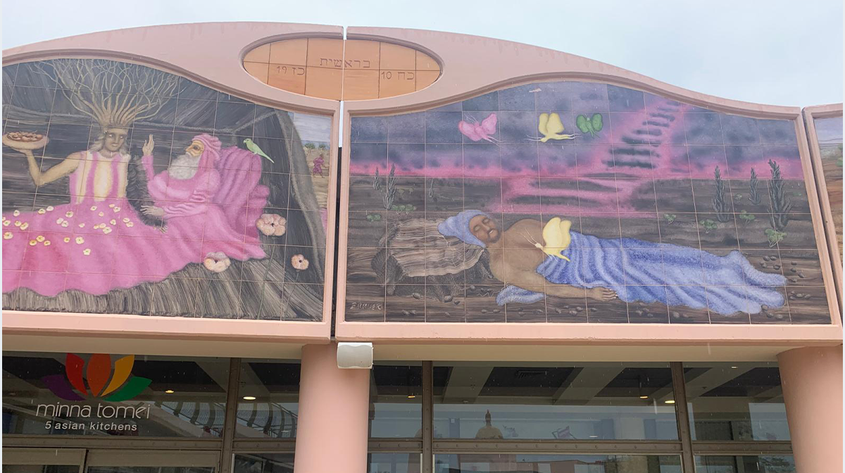 לאורך קירו החיצוני של המבנה תמונת קיר גדולה עשויה אריחי חרסינה, מעשה ידי האמן פרופסור אריק בראואר. בציור מתוארים סיפורי התנ"ך ובהם: אדם וחווה, סולם יעקב, יוסף ואחיו, יהושע בן נון, השופט גדעון, שמשון הגיבור, דוד וגוליית, דוד ובת שבע. בתוך כיפת מרכז הקניות מצוי ציור קיר נוסף רחב־ממדים, מהגדולים במדינת ישראל.