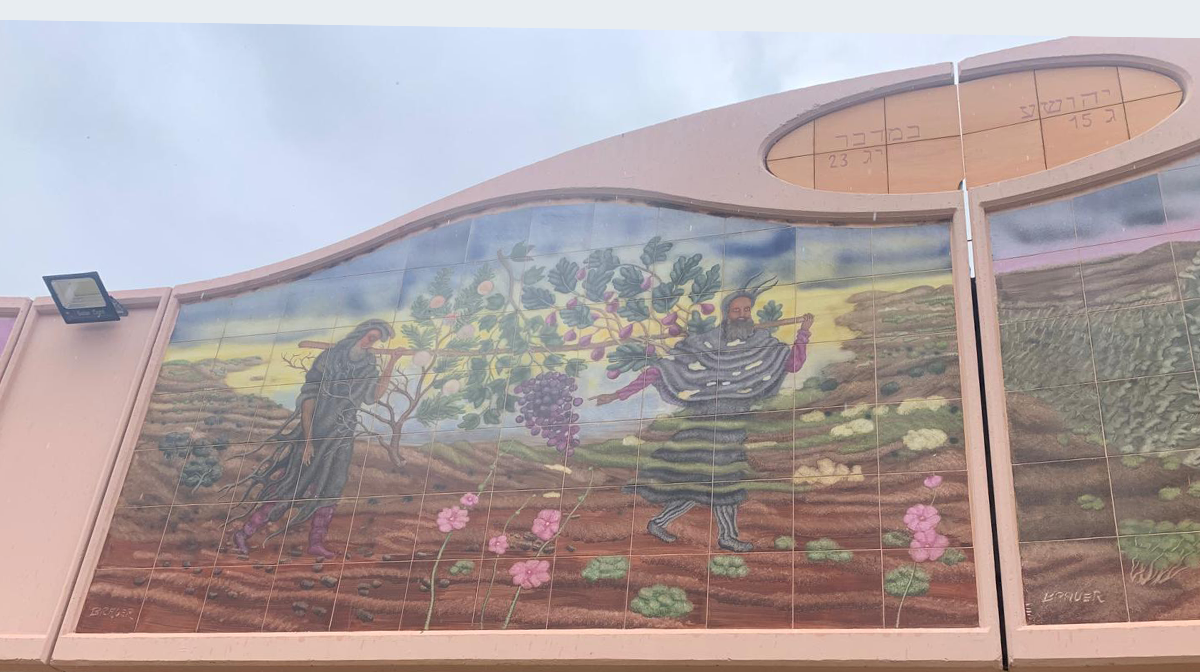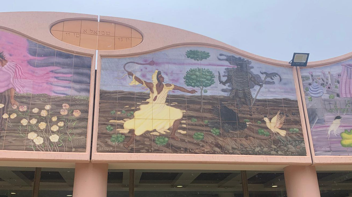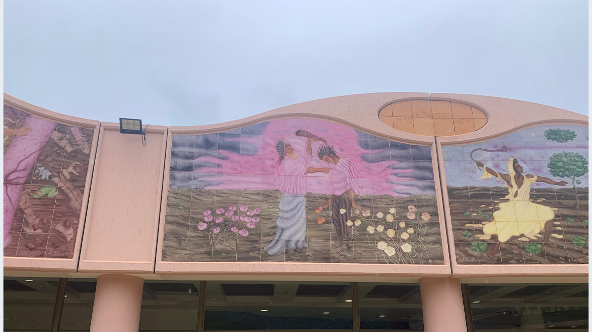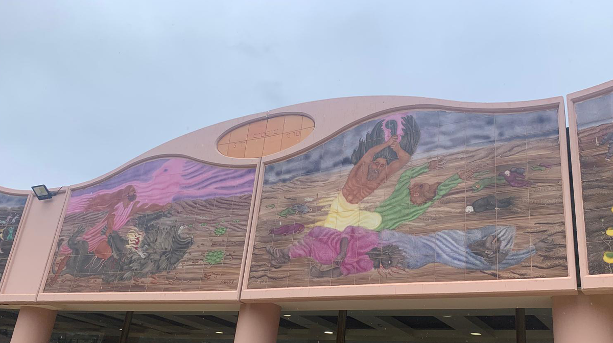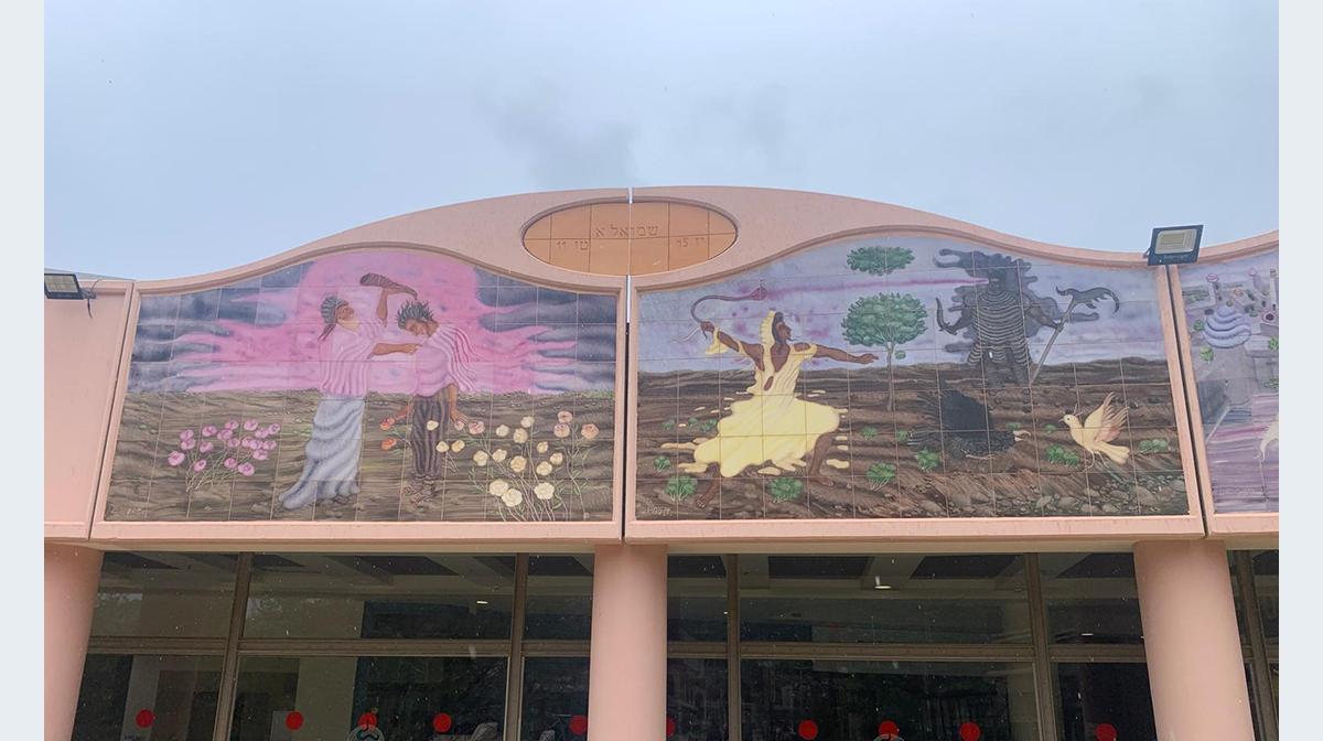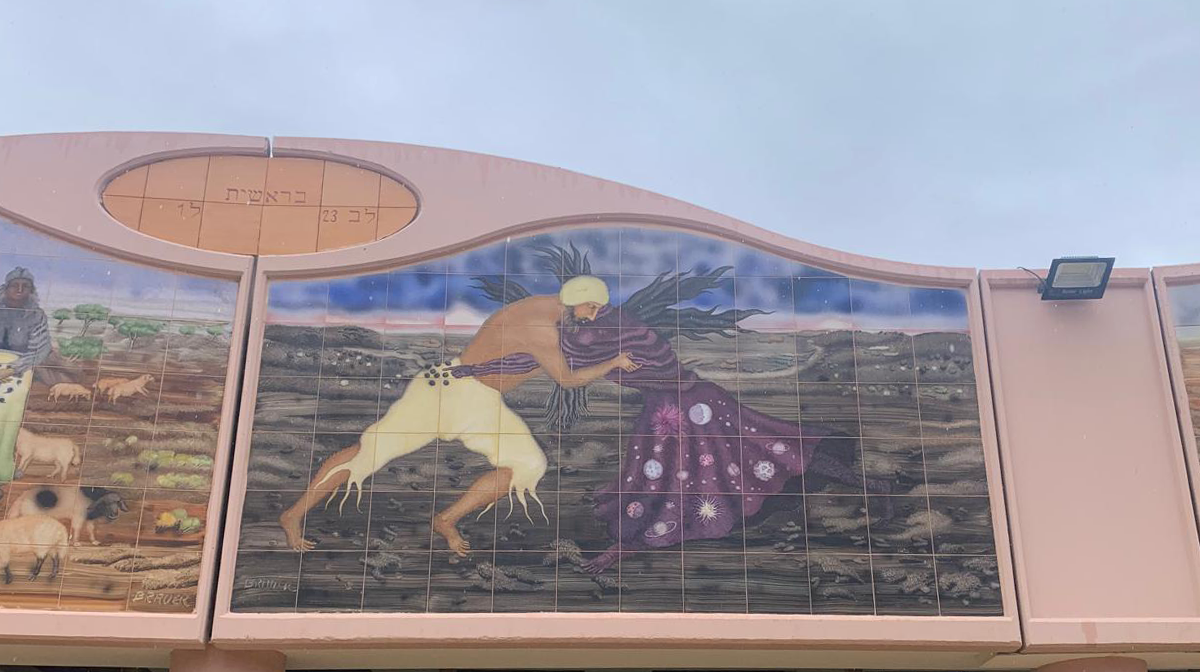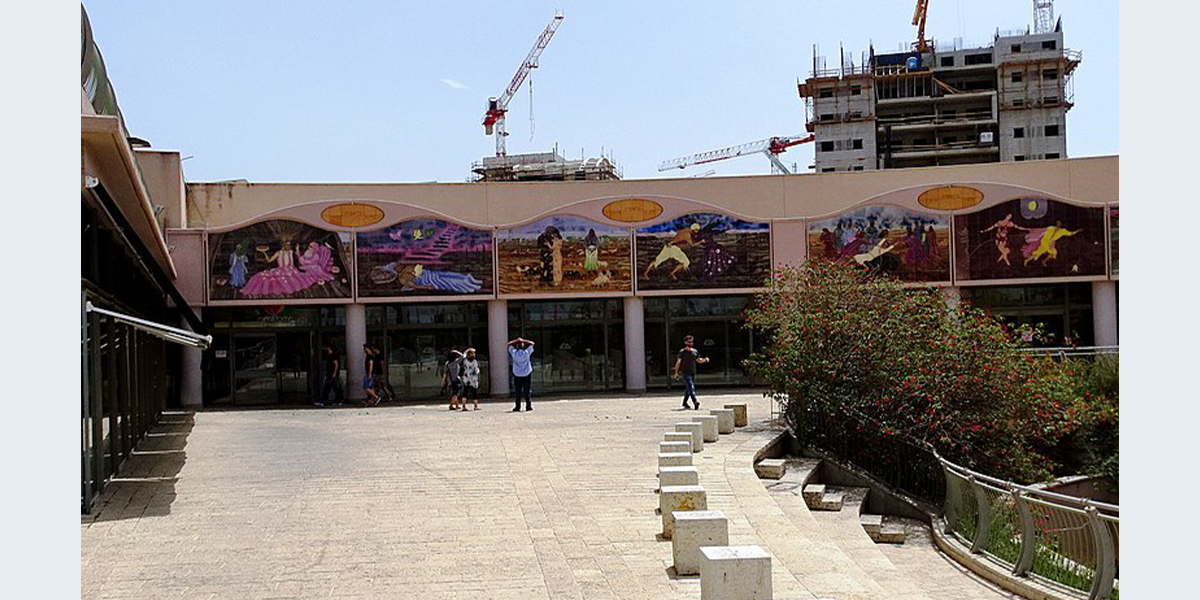 לאורך קירו החיצוני של המבנה תמונת קיר גדולה עשויה אריחי חרסינה, מעשה ידי האמן פרופסור אריק בראואר. בציור מתוארים סיפורי התנ"ך ובהם: אדם וחווה, סולם יעקב, יוסף ואחיו, יהושע בן נון, השופט גדעון, שמשון הגיבור, דוד וגוליית, דוד ובת שבע. בתוך כיפת מרכז הקניות מצוי ציור קיר נוסף רחב־ממדים, מהגדולים במדינת ישראל.