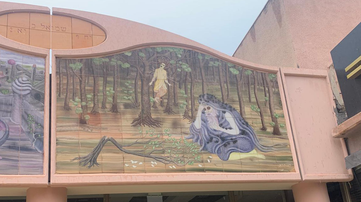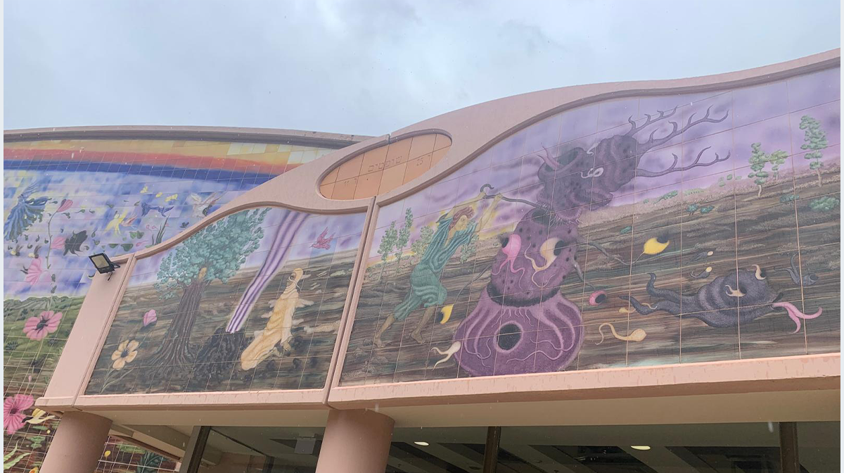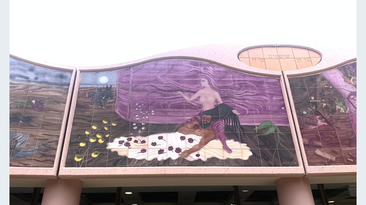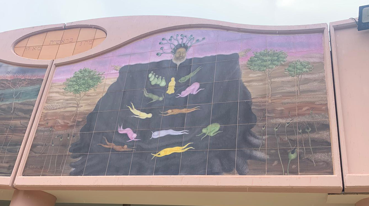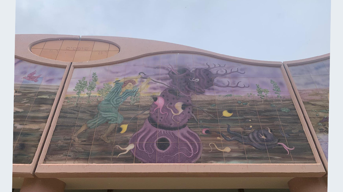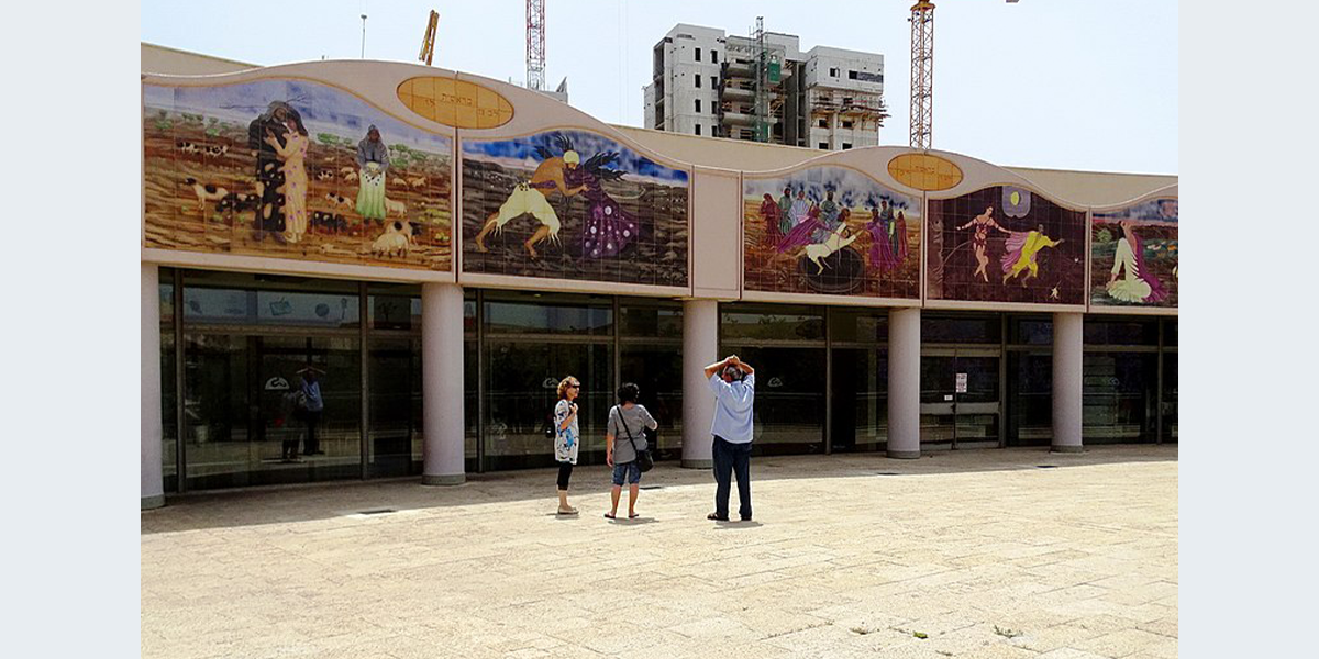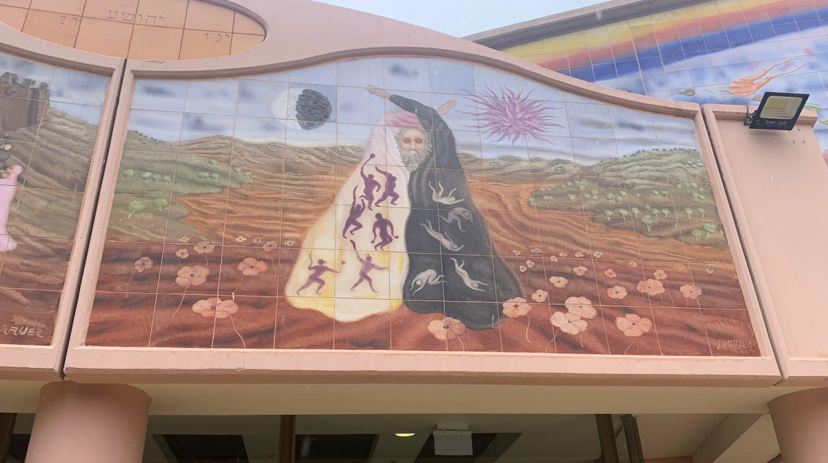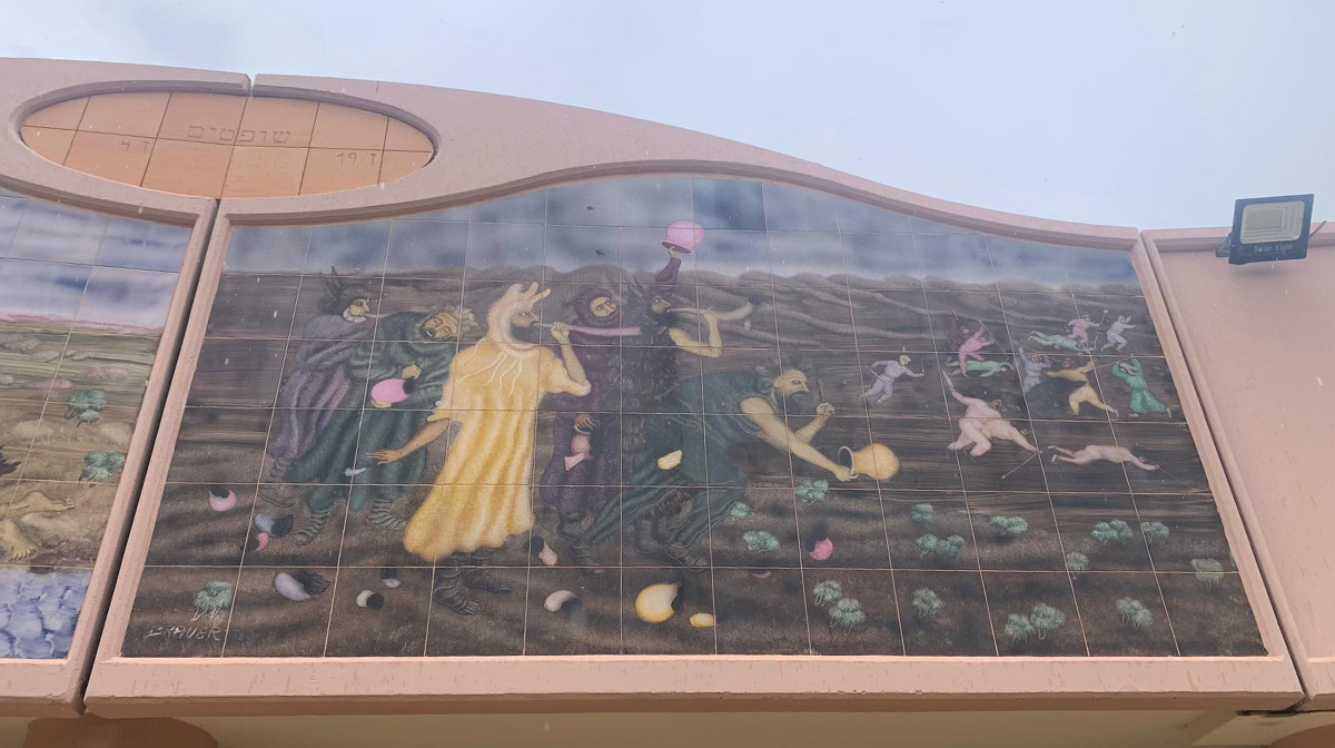 לאורך קירו החיצוני של המבנה תמונת קיר גדולה עשויה אריחי חרסינה, מעשה ידי האמן פרופסור אריק בראואר. בציור מתוארים סיפורי התנ"ך ובהם: אדם וחווה, סולם יעקב, יוסף ואחיו, יהושע בן נון, השופט גדעון, שמשון הגיבור, דוד וגוליית, דוד ובת שבע. בתוך כיפת מרכז הקניות מצוי ציור קיר נוסף רחב־ממדים, מהגדולים במדינת ישראל.