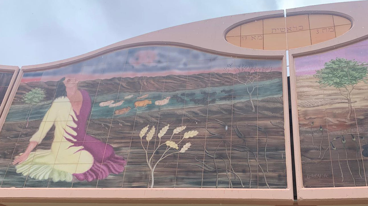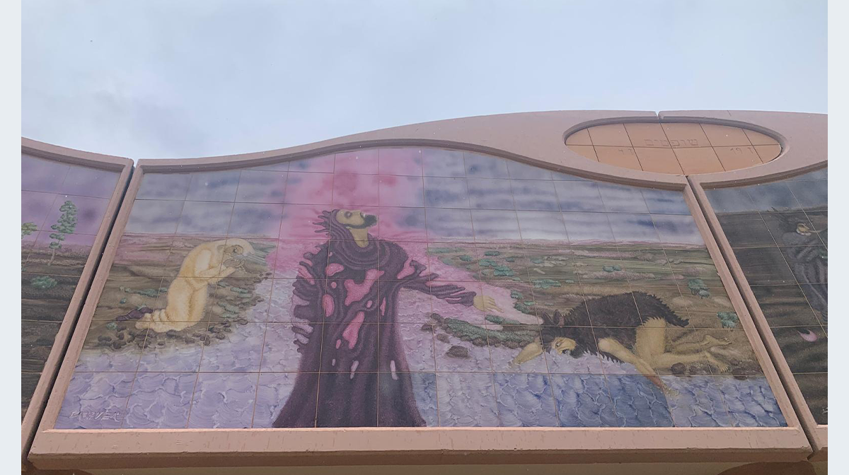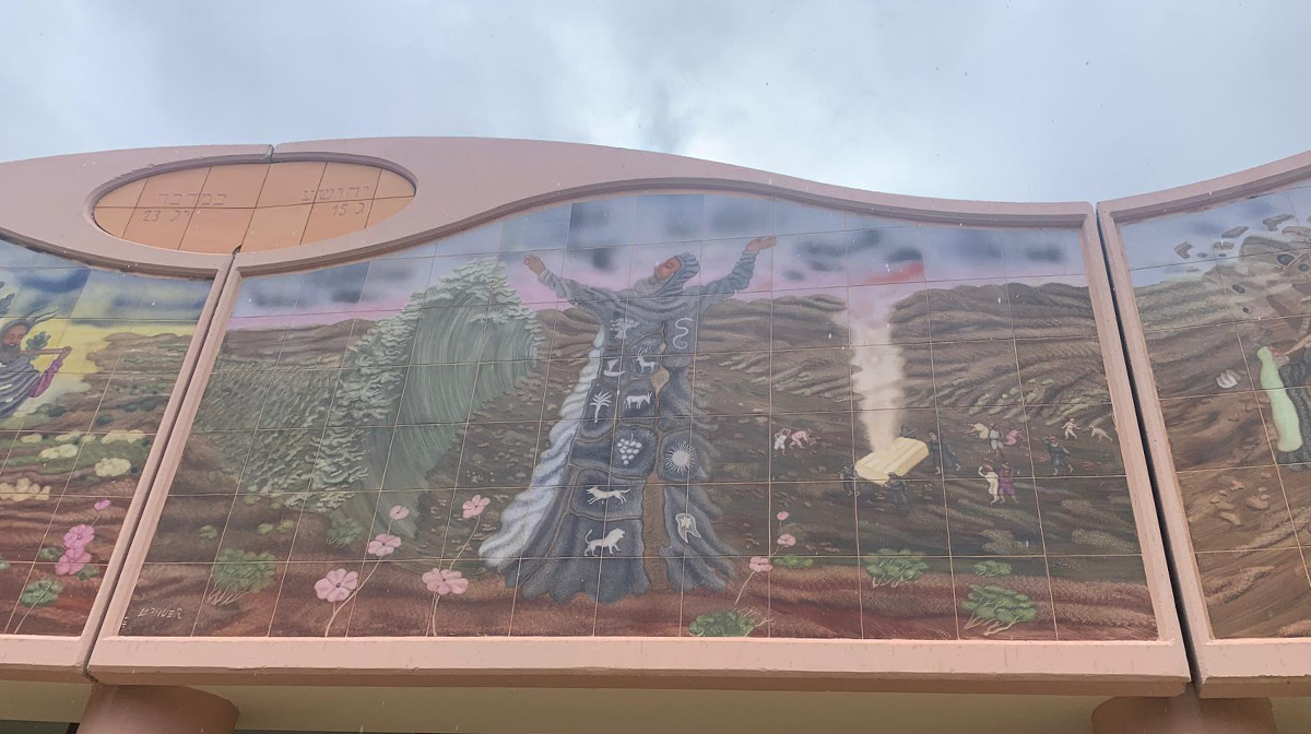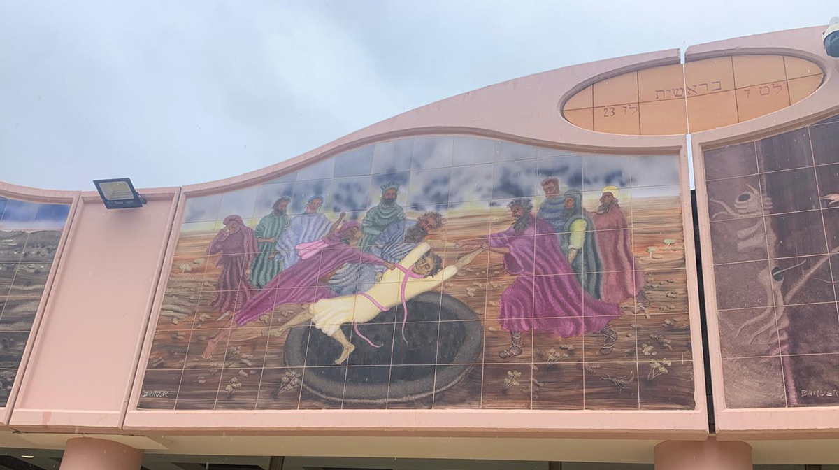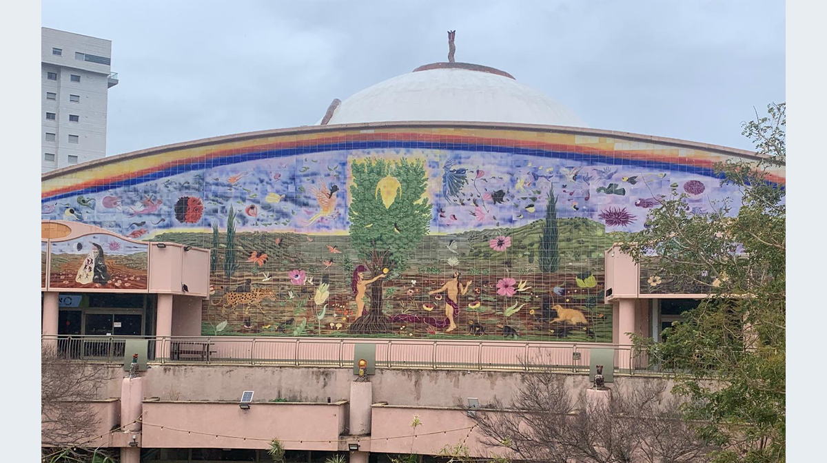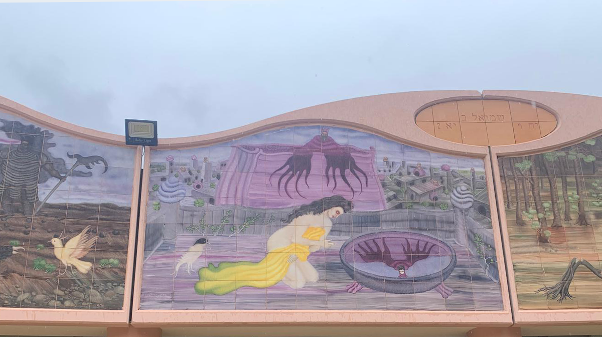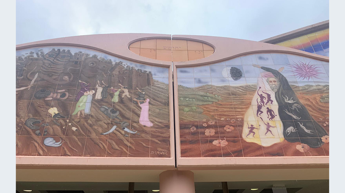 לאורך קירו החיצוני של המבנה תמונת קיר גדולה עשויה אריחי חרסינה, מעשה ידי האמן פרופסור אריק בראואר. בציור מתוארים סיפורי התנ"ך ובהם: אדם וחווה, סולם יעקב, יוסף ואחיו, יהושע בן נון, השופט גדעון, שמשון הגיבור, דוד וגוליית, דוד ובת שבע. בתוך כיפת מרכז הקניות מצוי ציור קיר נוסף רחב־ממדים, מהגדולים במדינת ישראל.