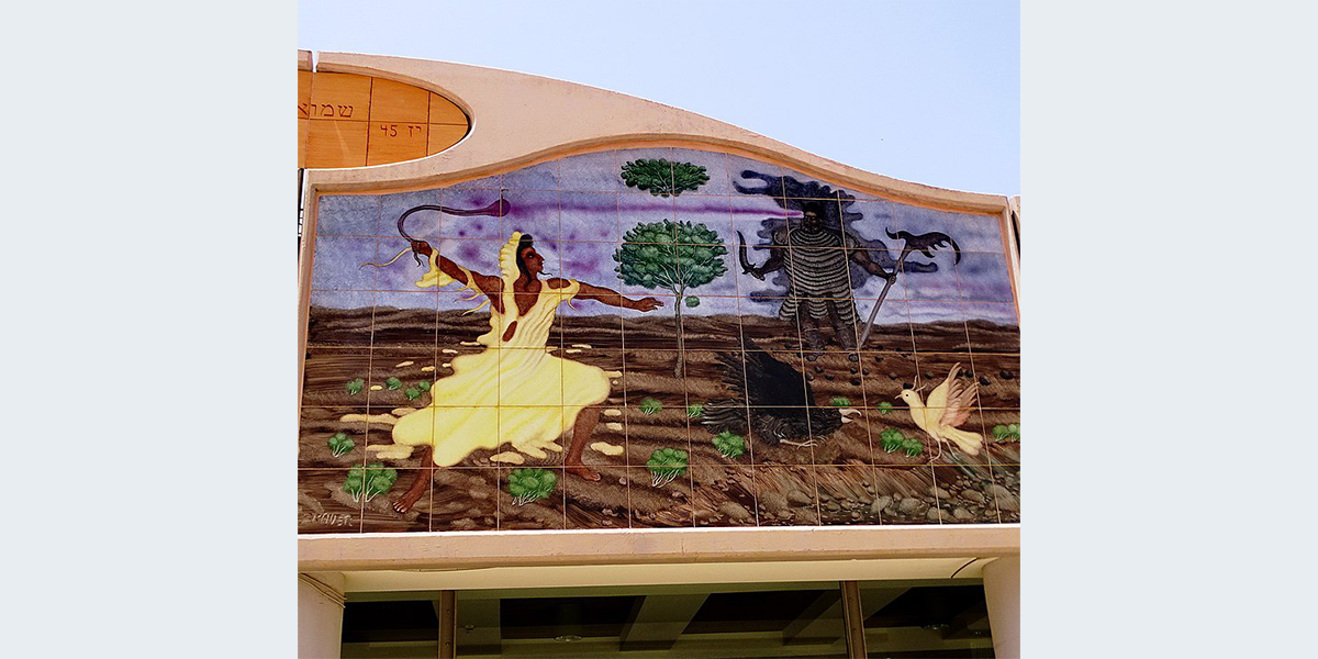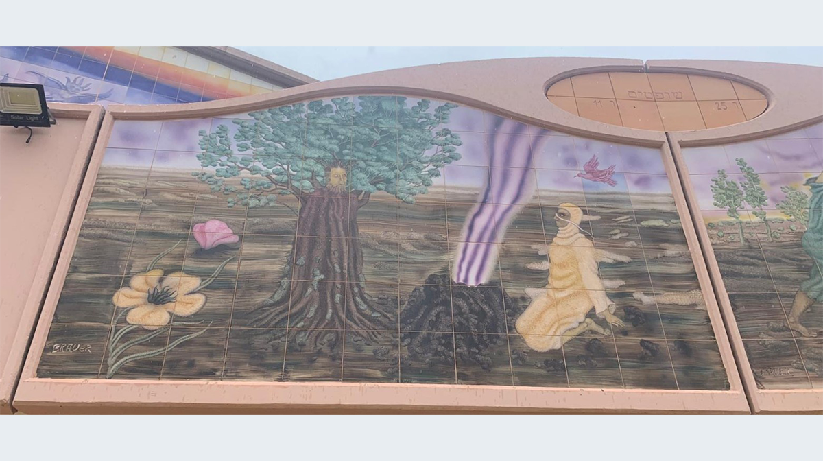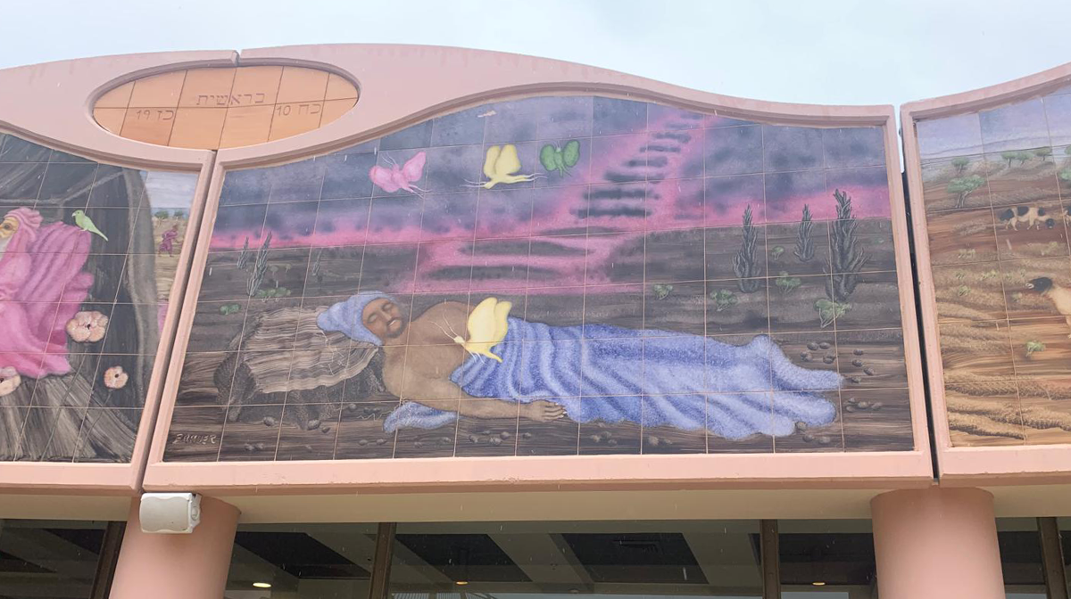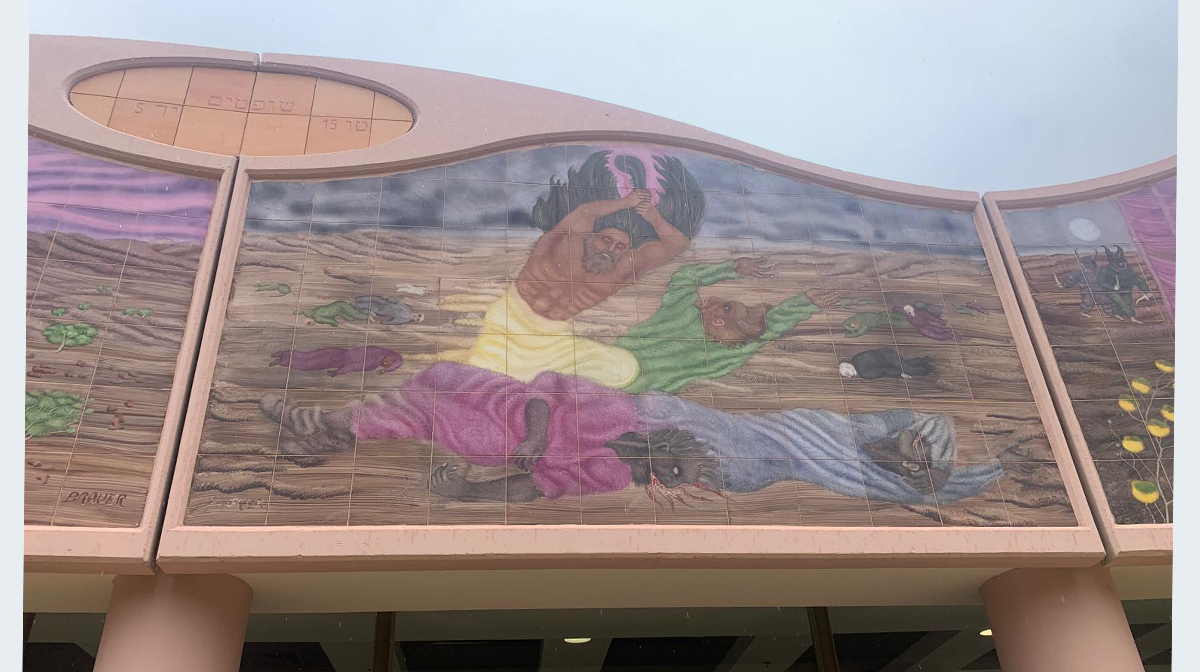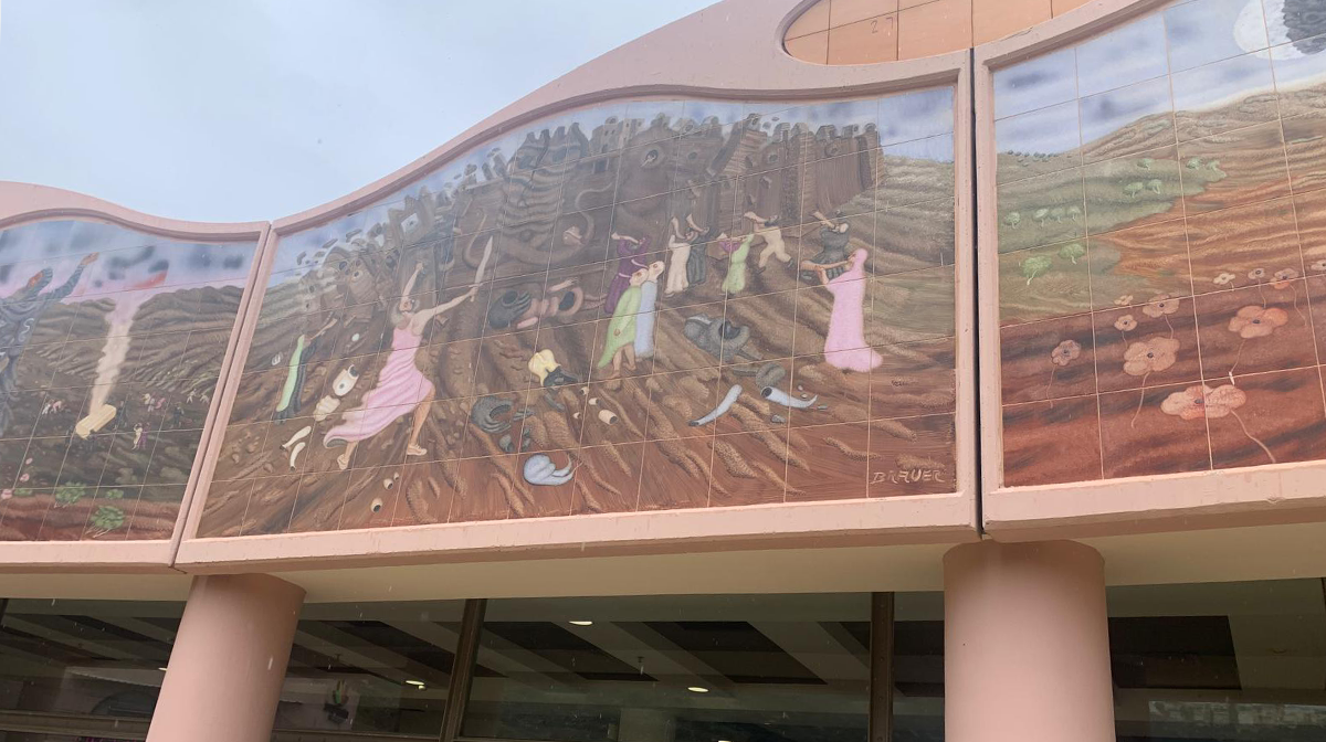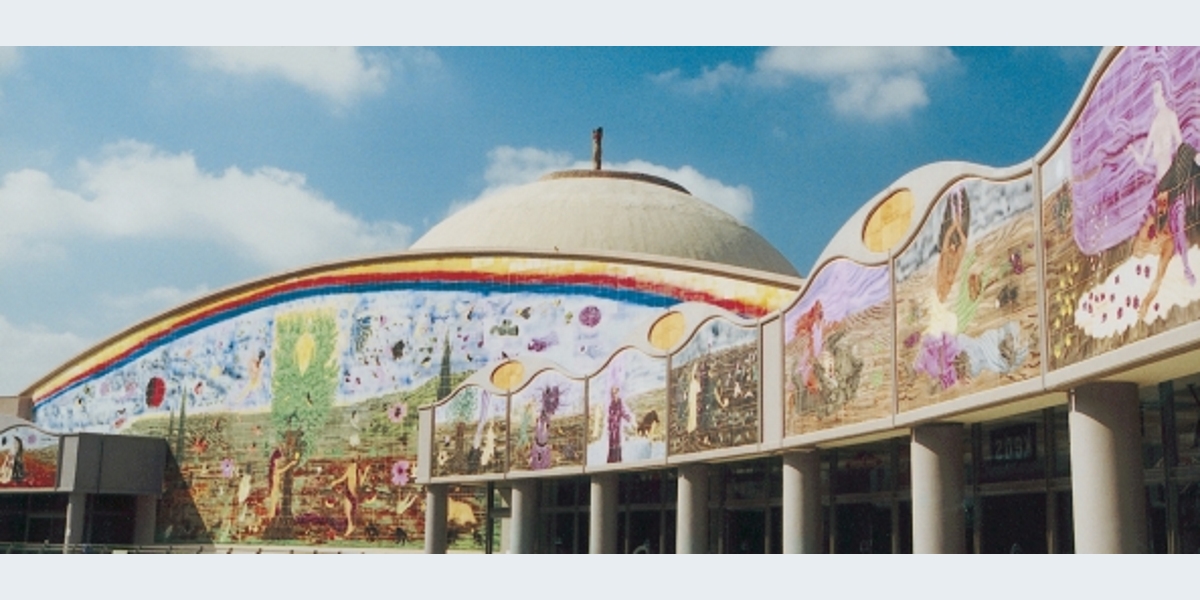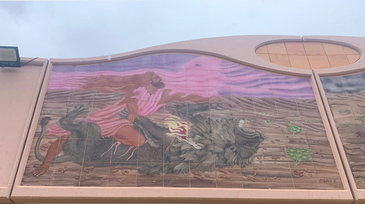 לאורך קירו החיצוני של המבנה תמונת קיר גדולה עשויה אריחי חרסינה, מעשה ידי האמן פרופסור אריק בראואר. בציור מתוארים סיפורי התנ"ך ובהם: אדם וחווה, סולם יעקב, יוסף ואחיו, יהושע בן נון, השופט גדעון, שמשון הגיבור, דוד וגוליית, דוד ובת שבע. בתוך כיפת מרכז הקניות מצוי ציור קיר נוסף רחב־ממדים, מהגדולים במדינת ישראל.