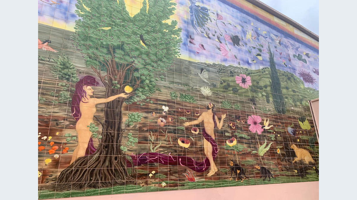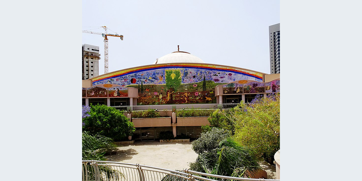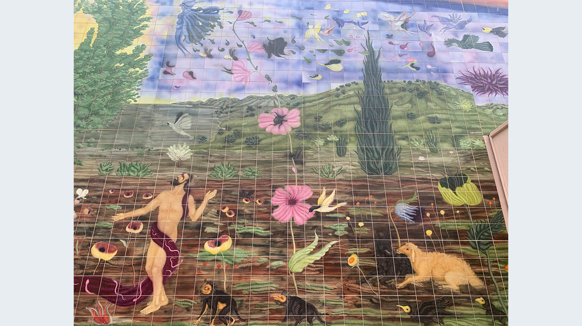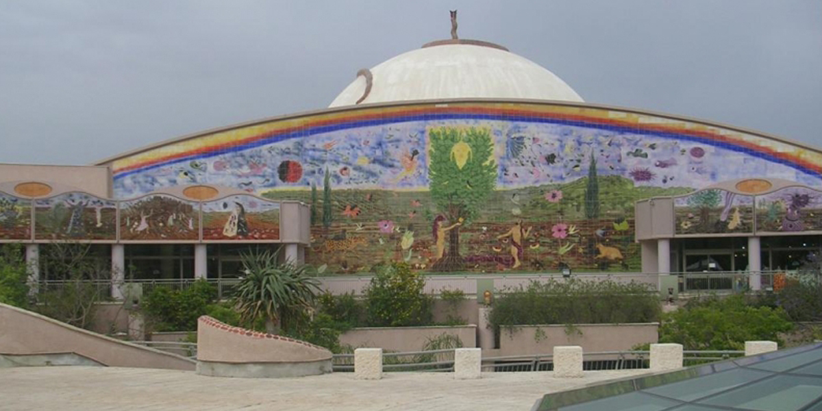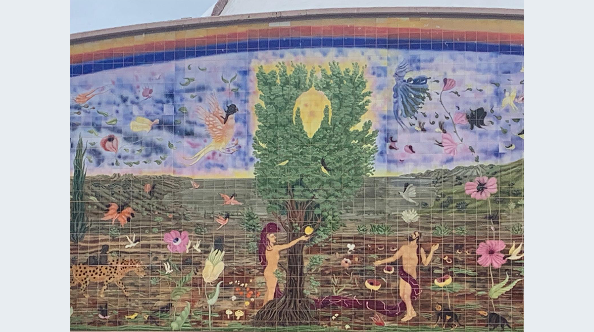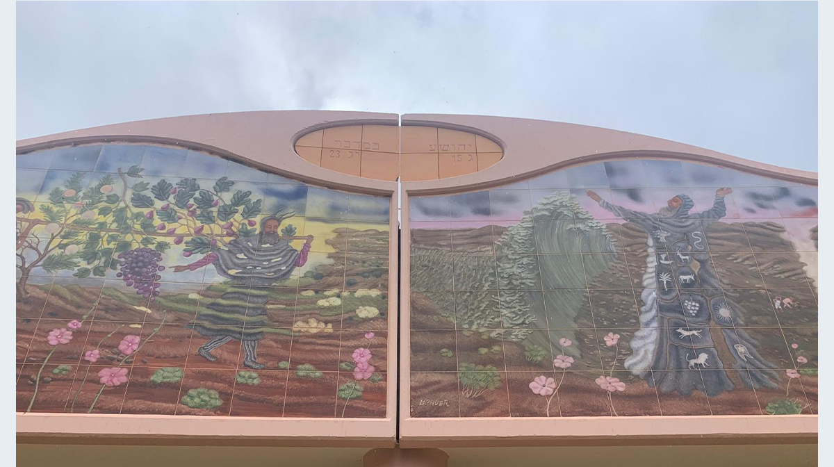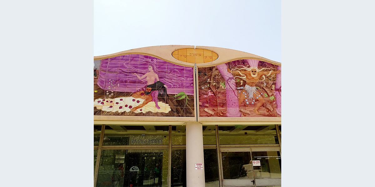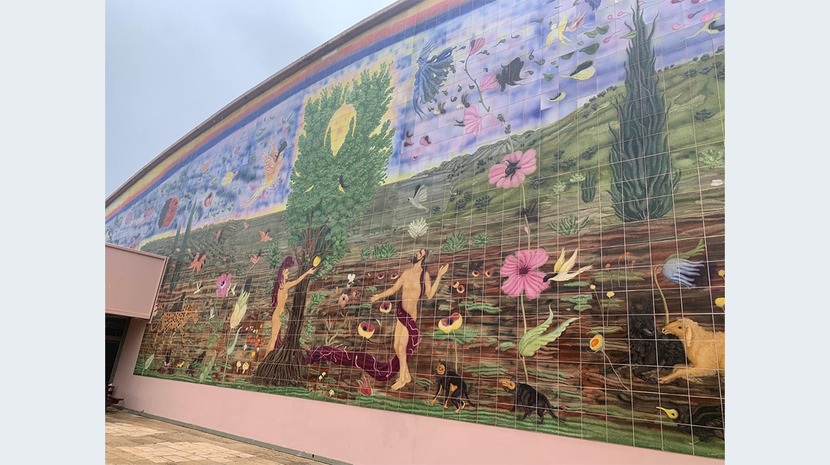 לאורך קירו החיצוני של המבנה תמונת קיר גדולה עשויה אריחי חרסינה, מעשה ידי האמן פרופסור אריק בראואר. בציור מתוארים סיפורי התנ"ך ובהם: אדם וחווה, סולם יעקב, יוסף ואחיו, יהושע בן נון, השופט גדעון, שמשון הגיבור, דוד וגוליית, דוד ובת שבע. בתוך כיפת מרכז הקניות מצוי ציור קיר נוסף רחב־ממדים, מהגדולים במדינת ישראל.
