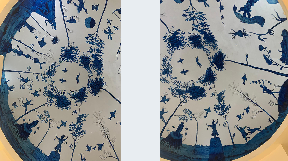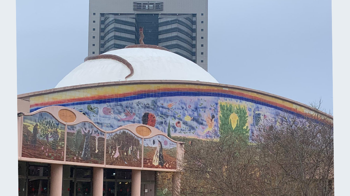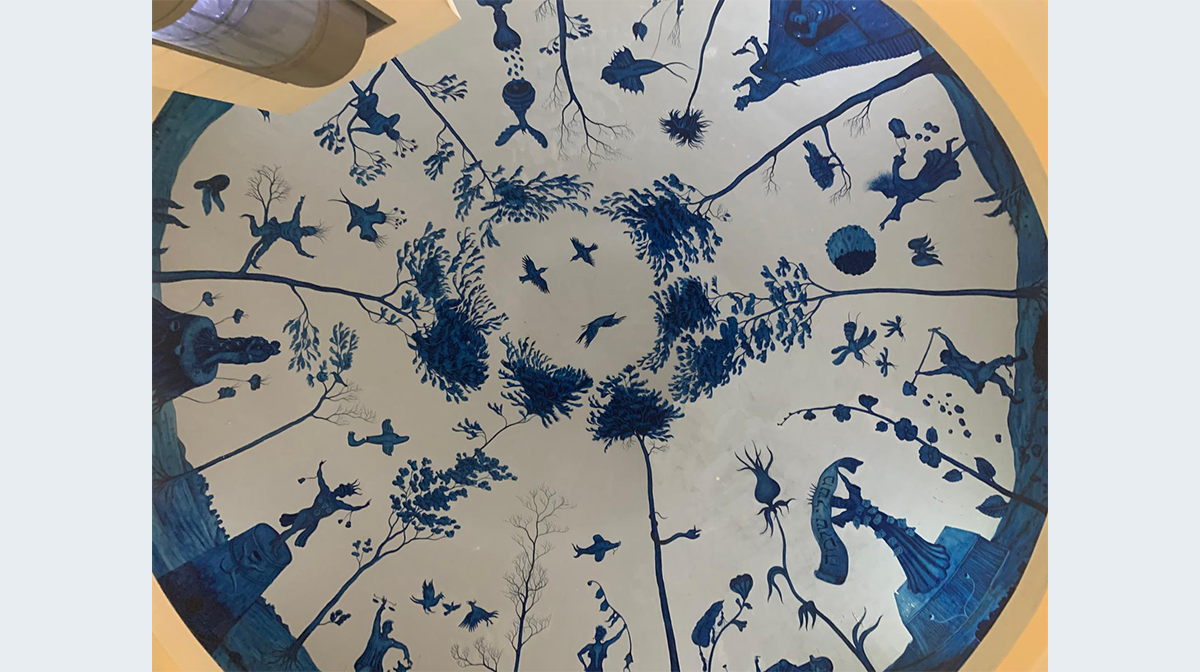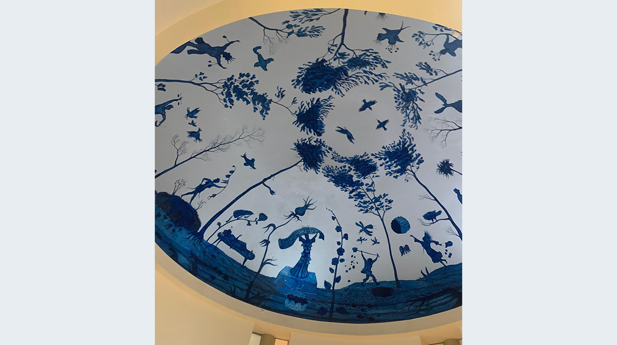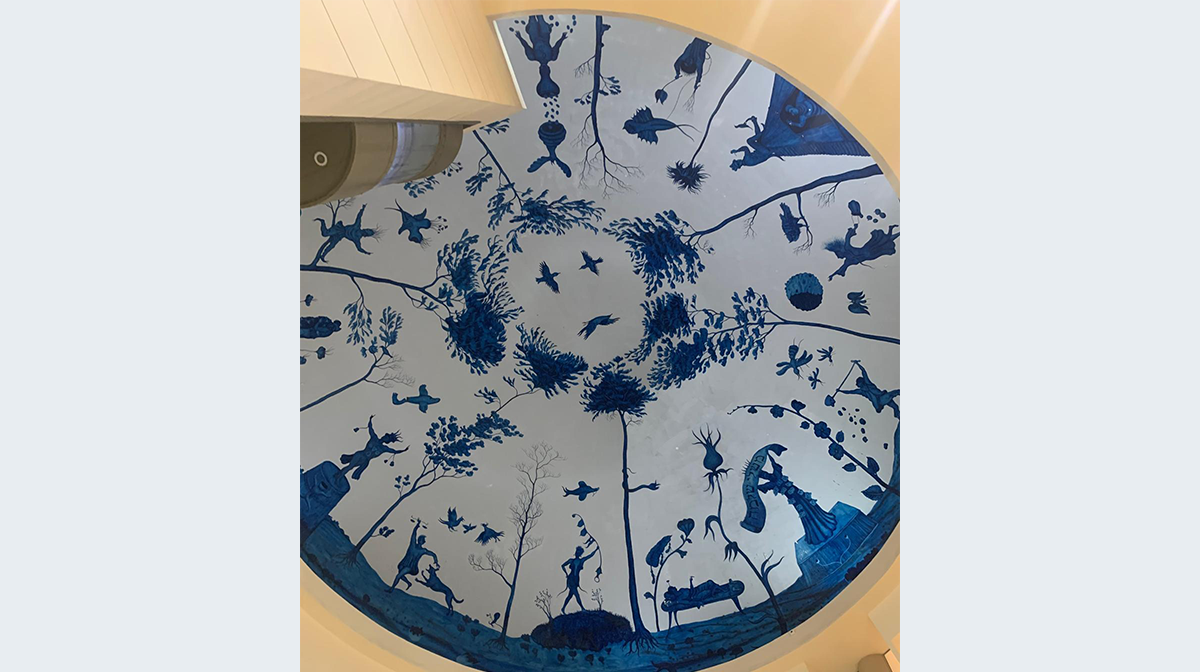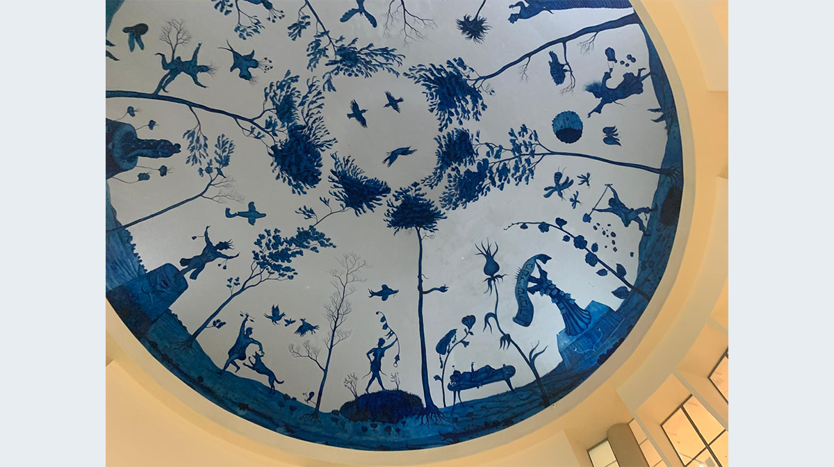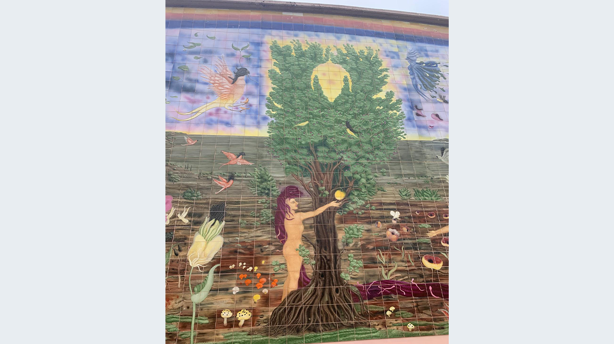 לאורך קירו החיצוני של המבנה תמונת קיר גדולה עשויה אריחי חרסינה, מעשה ידי האמן פרופסור אריק בראואר. בציור מתוארים סיפורי התנ"ך ובהם: אדם וחווה, סולם יעקב, יוסף ואחיו, יהושע בן נון, השופט גדעון, שמשון הגיבור, דוד וגוליית, דוד ובת שבע. בתוך כיפת מרכז הקניות מצוי ציור קיר נוסף רחב־ממדים, מהגדולים במדינת ישראל.