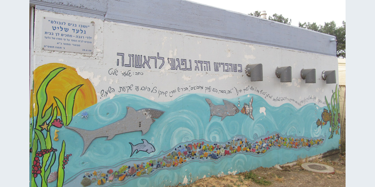 הפסיפס המשולב בציור קיר של עולם ימים נעשה על קיר ביה"ס האזורי רגבה, והוא מתבסס על ספרו של גלעד שליט "כשהכריש והדג נפגשו לראשונה". הפסיפס נוצר כשגלעד שליט היה בשבי.