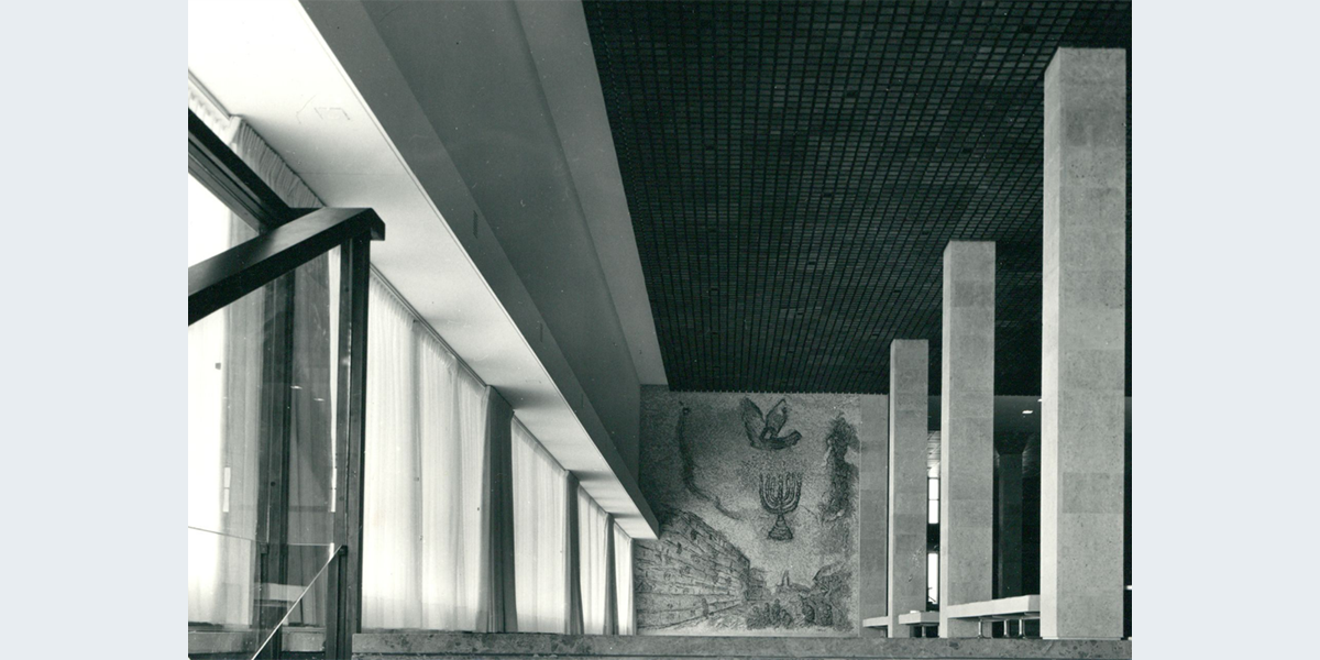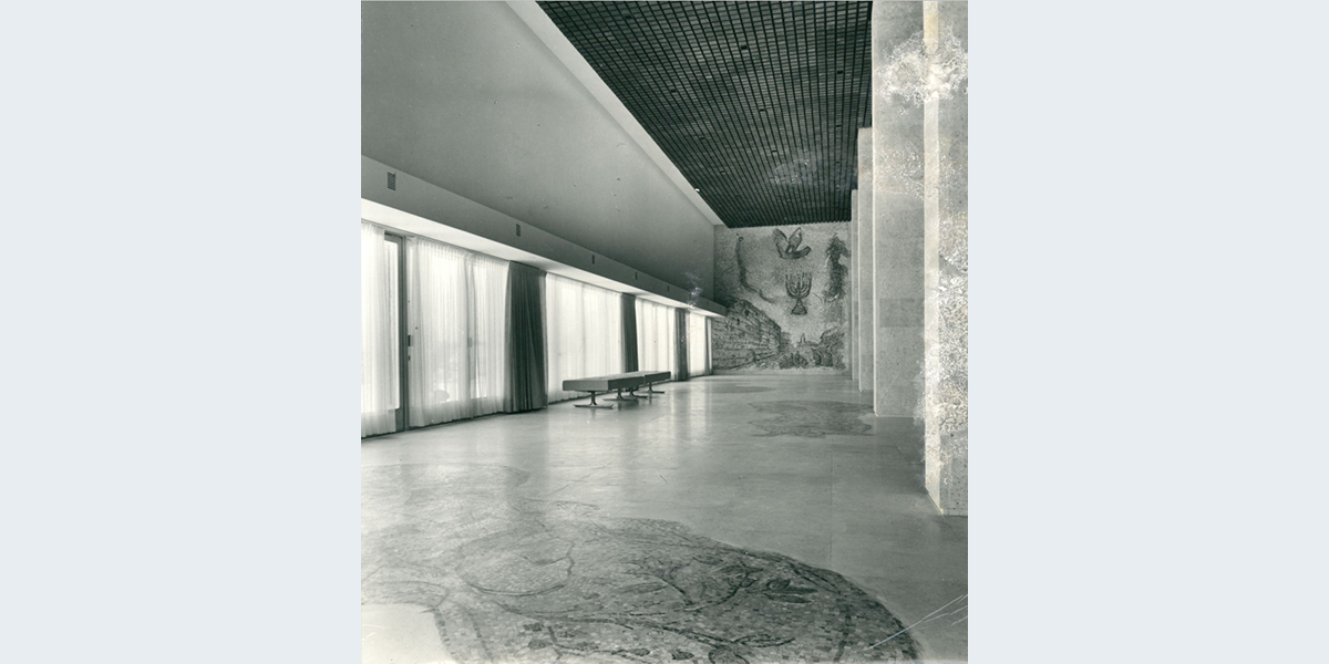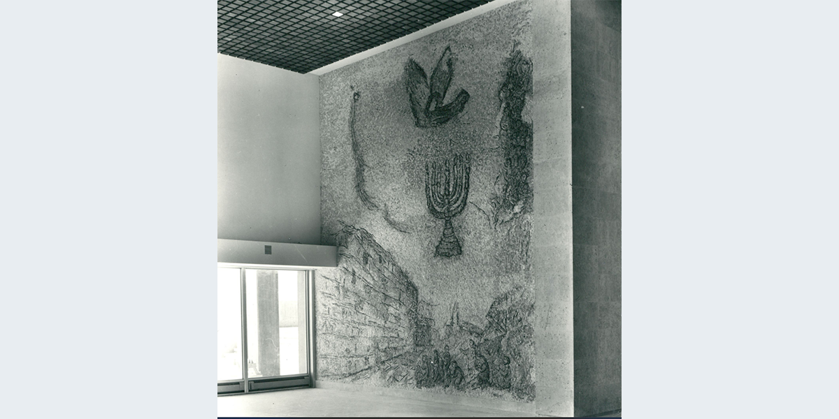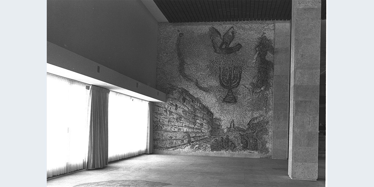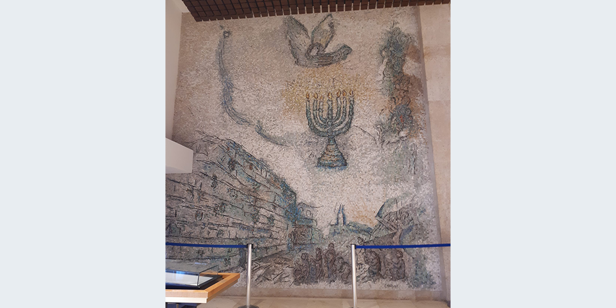 בדצמבר 1965 החליט שאגאל להוסיף פסיפס בקיר הצפוני של הטרקלין, ובו ייצג את הפסוקים "עַל נַהֲרוֹת בָּבֶל שָׁם יָשַׁבְנוּ גַּם בָּכִינוּ… אִם אֶשְׁכָּחֵךְ יְרוּשָׁלִָם תִּשְׁכַּח יְמִינִי…" (תהלים קלז). בפסיפס נראה הכותל המערבי, שאז עוד היה בידי הירדנים וליהודים לא הייתה גישה אליו. לרגלי הכותל יהודים מתפללים, ובאופק – מבני העיר העתיקה ומגדל דוד. במרכז הפסיפס מנורת שבעת קנים היא מנורת בית המקדש המרמזת גם אל סמל המדינה. ביצירה רואים גם אנשים הצופים במלאך הקורא לבני ישראל לשוב למולדתם. הכוכב בעל ששת הקודקודים שבקצה השמאלי של הפסיפס מייצג הן את הפסוק "דָּרַךְ כּוֹכָב מִיַּעֲקֹב וְקָם שֵׁבֶט מִיִּשְׂרָאֵל" (במדבר כד, יז), הן את סמל מגן דוד שעל דגל המדינה. העבודה על הפסיפסים הושלמה לקראת מועד חנוכת הכנסת באוגוסט 1966.