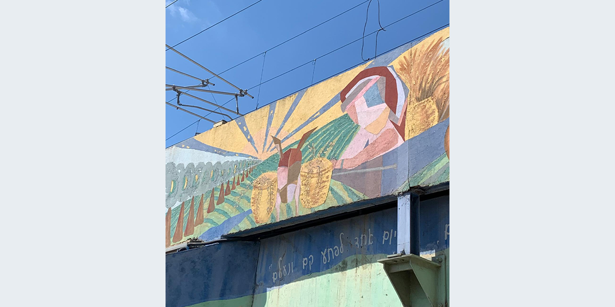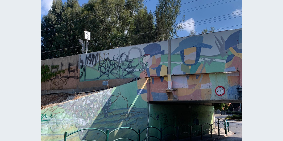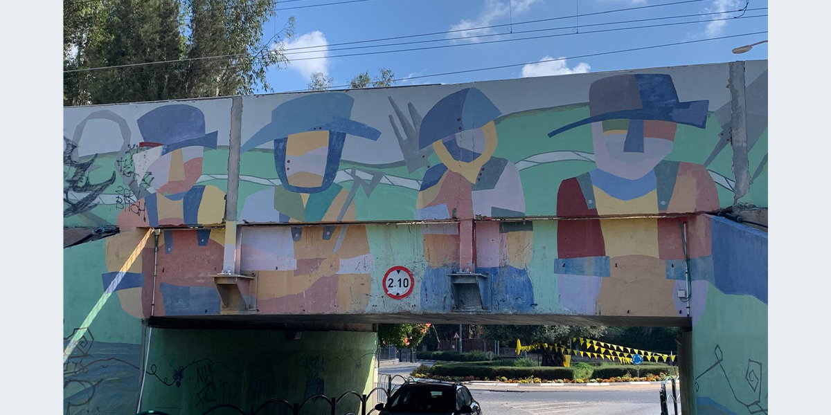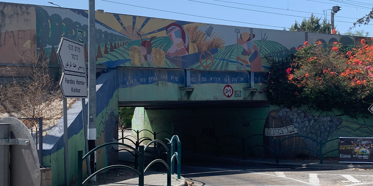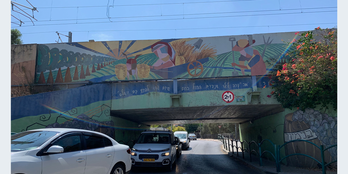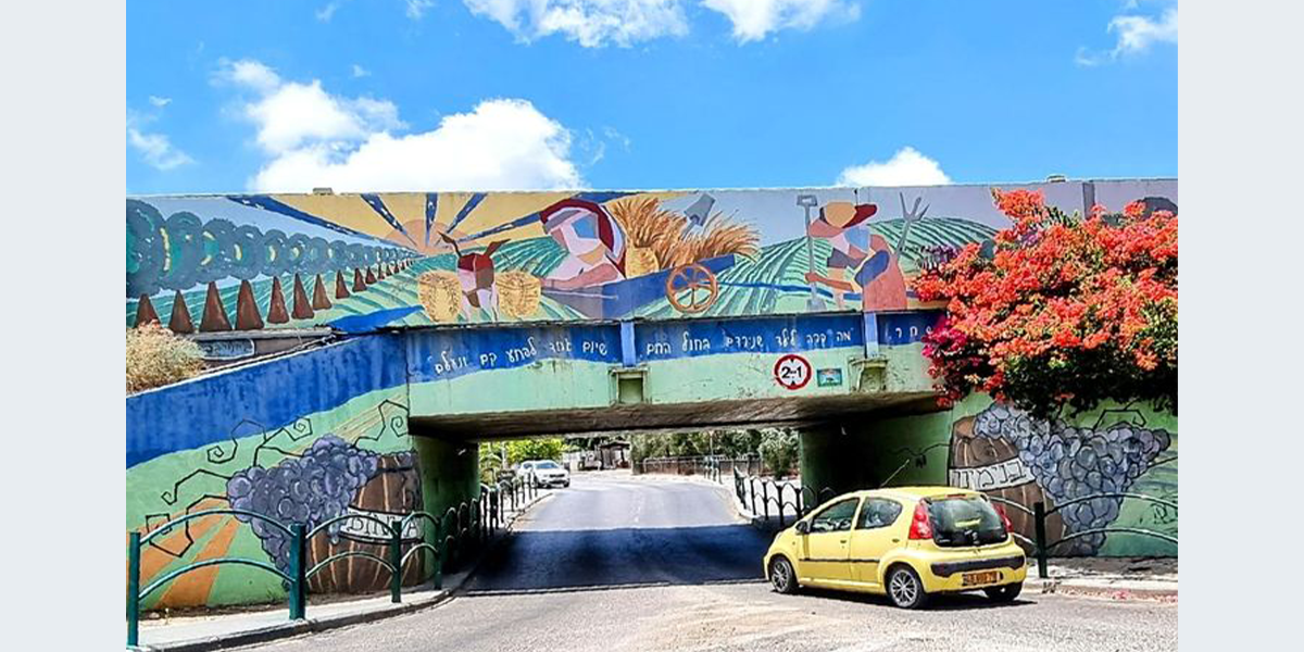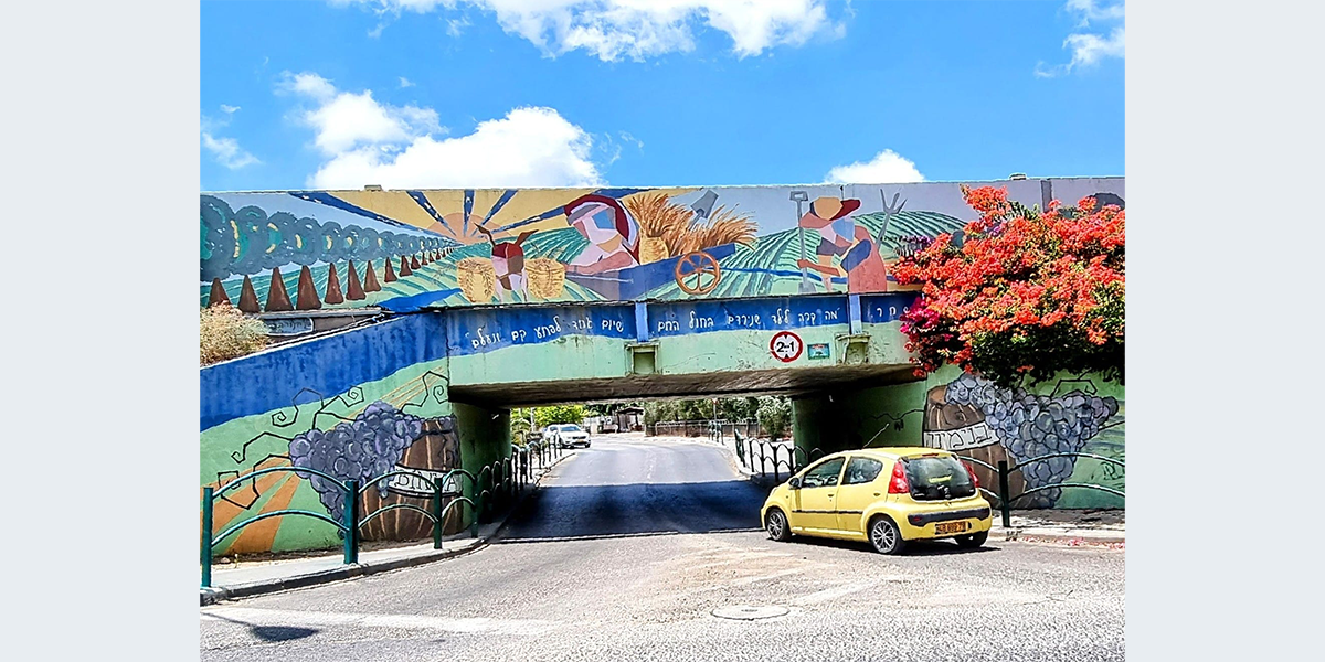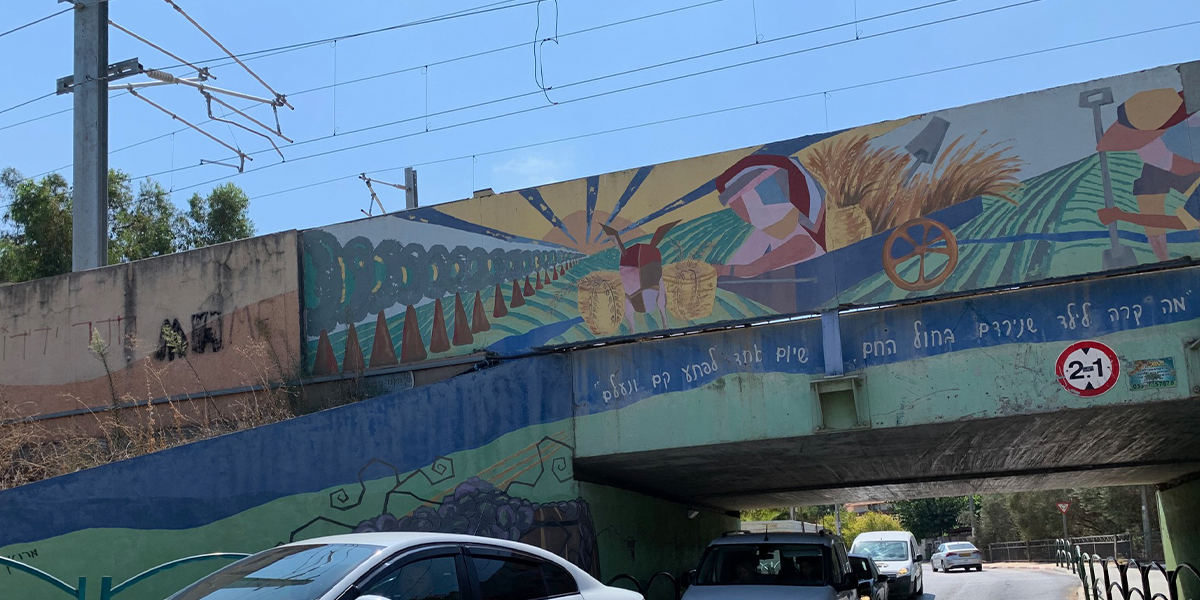 "בשנת 2005, החליט ראש המועצה המקומית דאז מר אריה זיתונ לטפל באסתטיקה של המושבה ופנה למספר אמנים לקבל הצעה רעיונית לעיטור גשר הרכבת. מתוך מבחר רעיונות של האמנים השונים, בחר בסקיצה של אדריכלית השימור טל מילנר-הוברמi מגבעת עדה. טל הציעה מספר רעיונות ביניהם גם פיסול קיר שטוח המורכב ממתכות שונות, אולם זיתוני העדיף את הצבעוניות על פני המראה המתכתי.