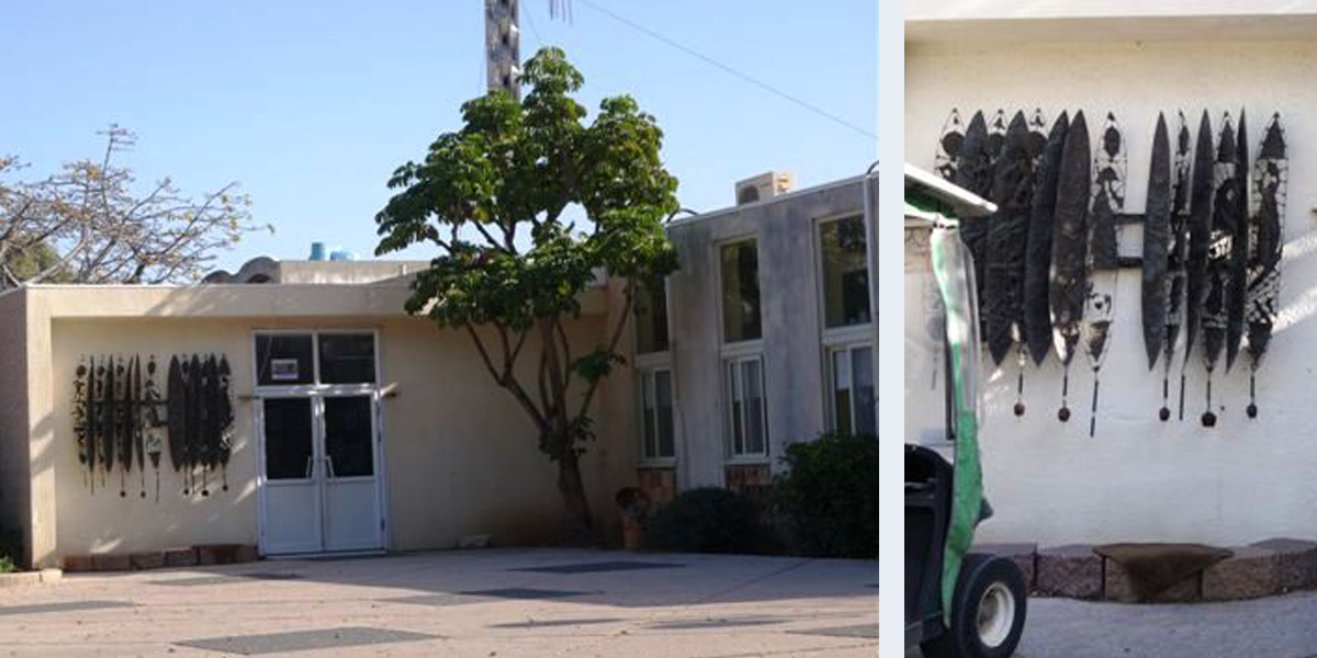 "מעשה ידיהם של תלמה ואריק הראל, חברי הקיבוץ. הם עיטרו את הכניסה עם עבודת מתכת ובאולם האכילה עבודת קיר גדולה בטכניקה מעורבת. "שתי העבודות שראית הן משנות ה־60", סיפר לי אריק הראל, "כל חג עשינו קישוט לחדר האוכל. העבודה בכניסה בוצעה במקורה לפסח והוצבה בתוך חדר האוכל. כדי לתלות בכניסה צמצמנו אותה. בעבודה מתוארת חציית ים סוף, שירת מרים ומשה המוביל את העם. עבודת הקיר הגדולה שבפנים חדר האוכל, מתארת את חגי ישראל".