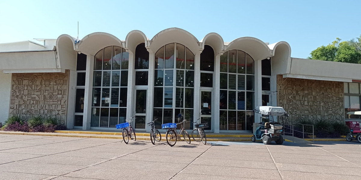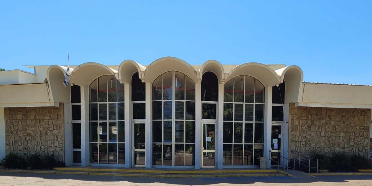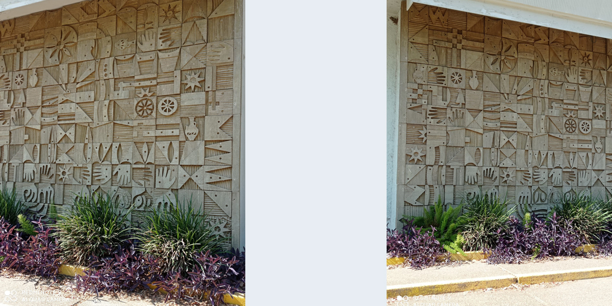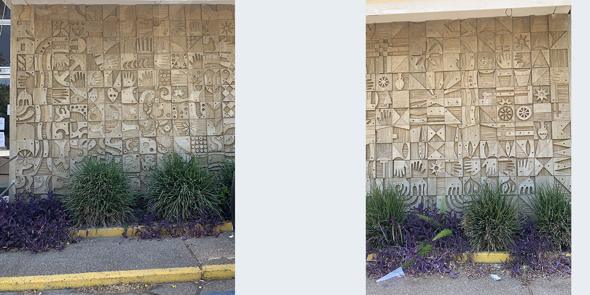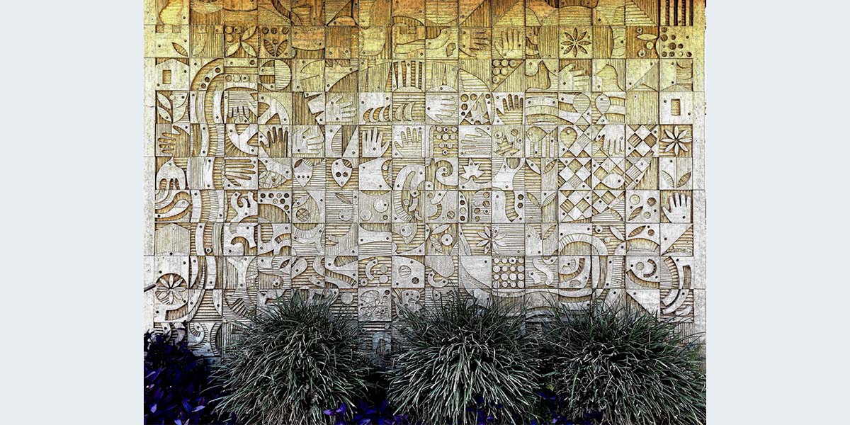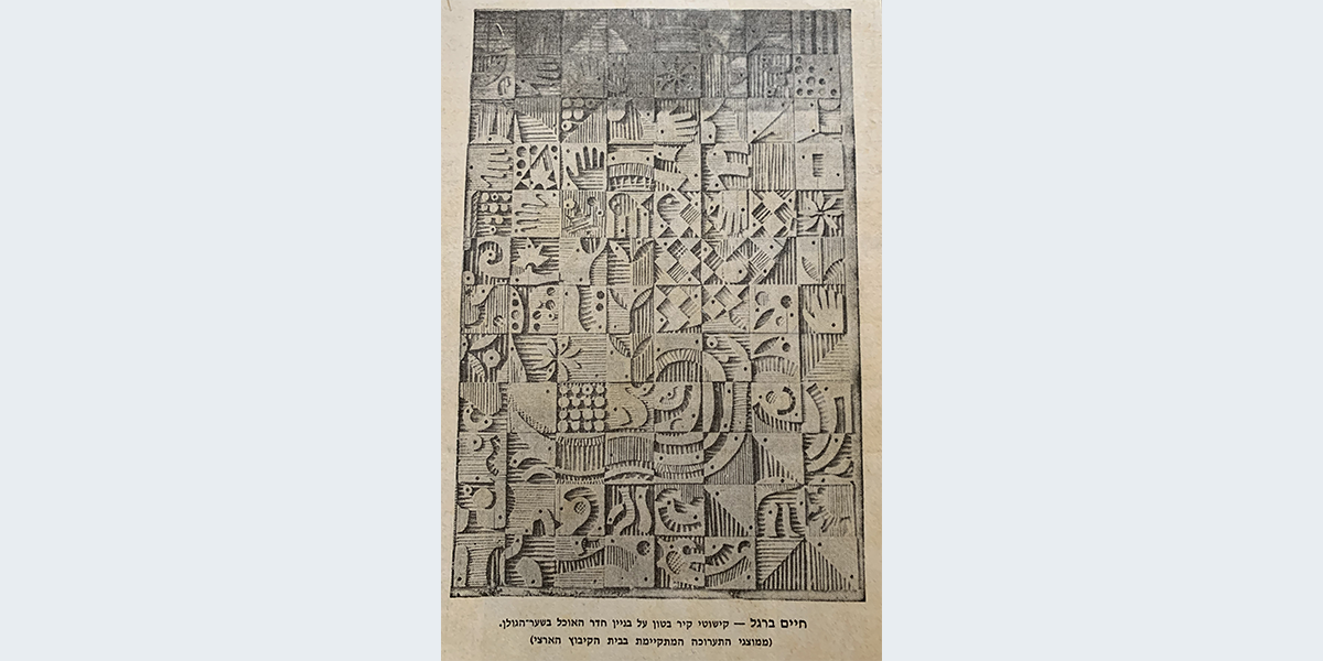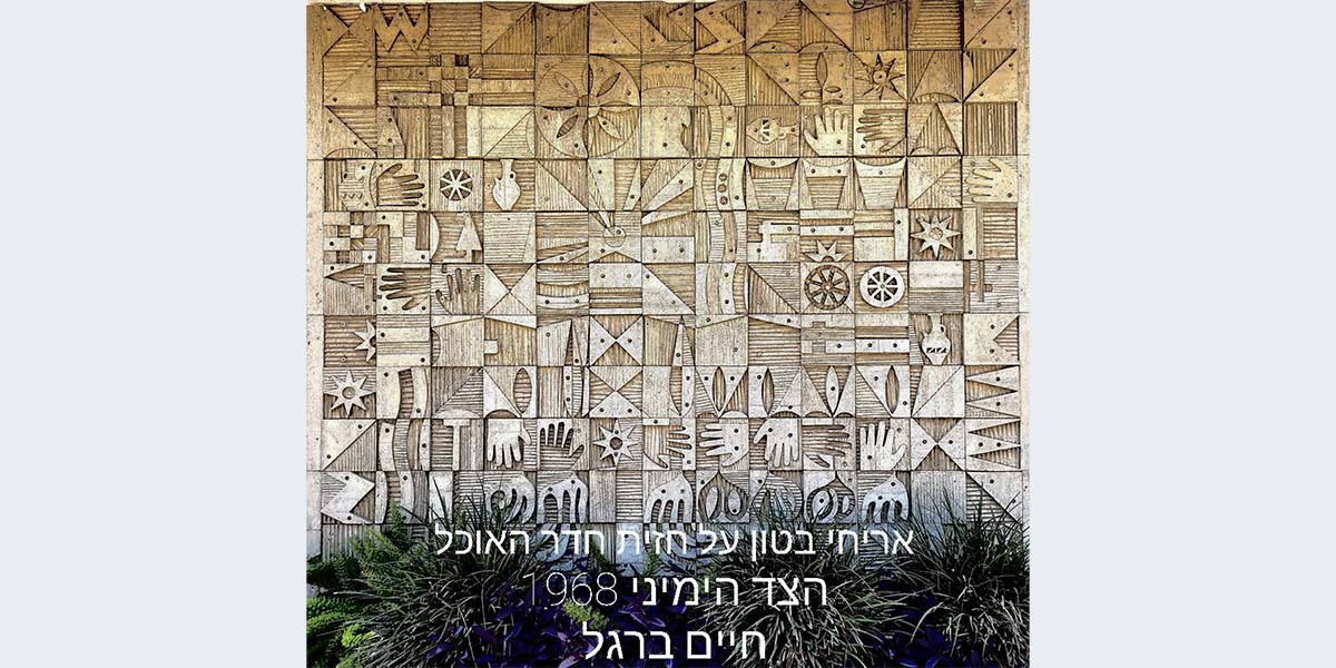 חזית חדר האוכל ועוד קיר. תבליט בטון שנראות בו ידיים עובדות וגלגלים, מים זורמים ופֵרות.
