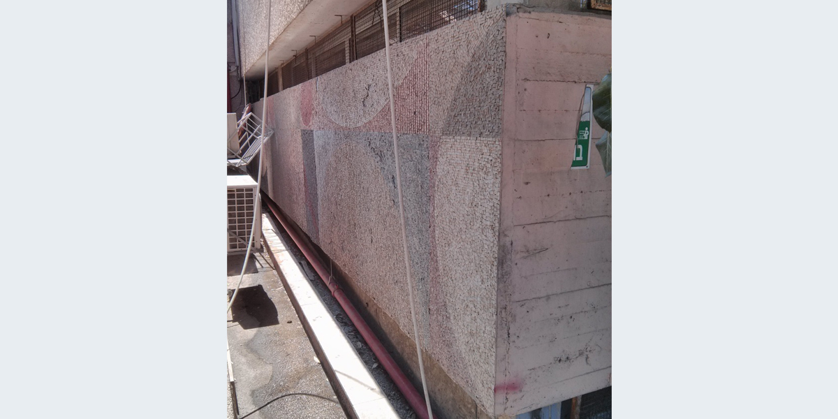 מצב השתמרות היצירה: ככל הנראה החלק הדרומי של היצירה נהרס לצורך הקמת תיאטרון הספרייה בצמוד לדופן המקורית. בפסיפס שנשתמר נשרו חלק מן האבנים.