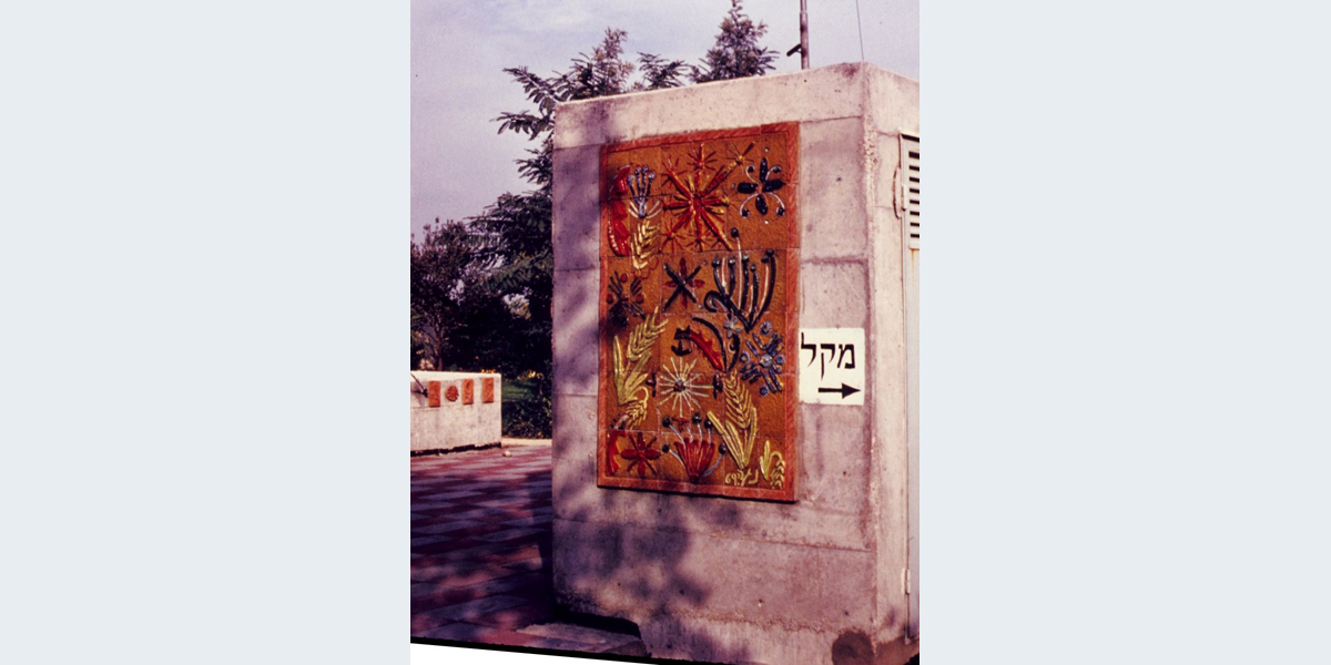 תבליט קרמיקה של נגה פישר חברת הקיבוץ שנקבע על קיר מקלט.