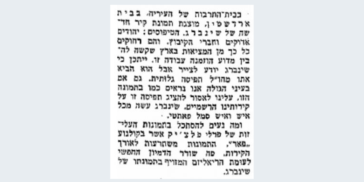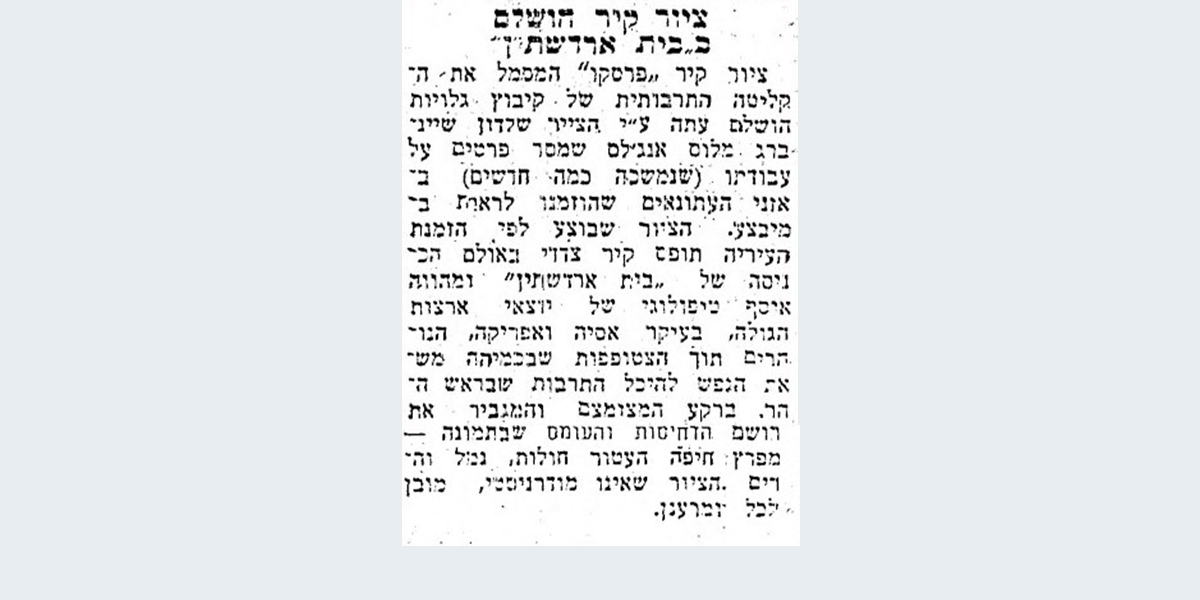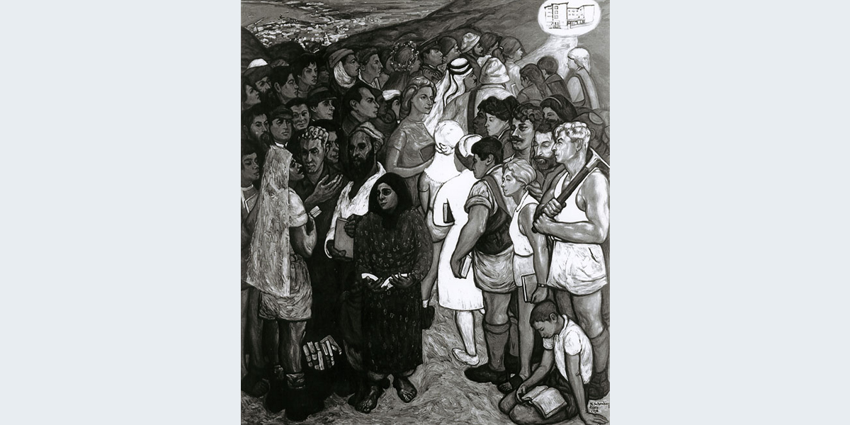 היצירה הממוקמת בבית ארנדשטיין – מבנה הספרייה לשעבר של אוניברסיטת חיפה וכיום אולפן לעברית – נושאה הוא העלייה אל מדינת ישראל הצעירה.