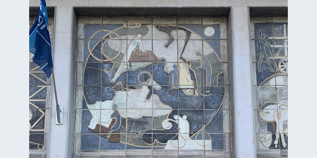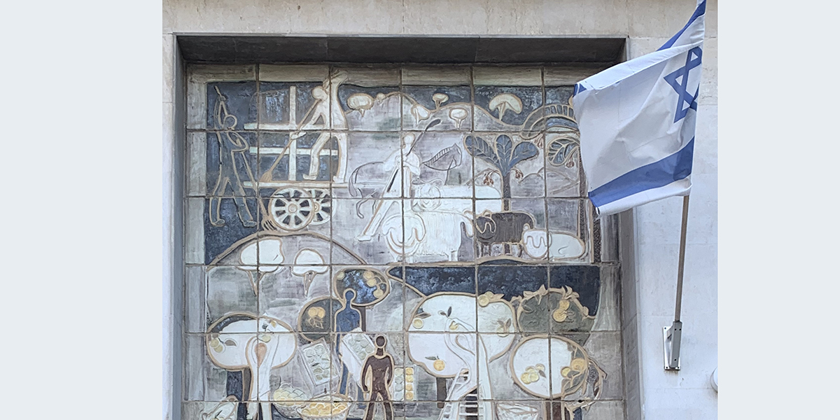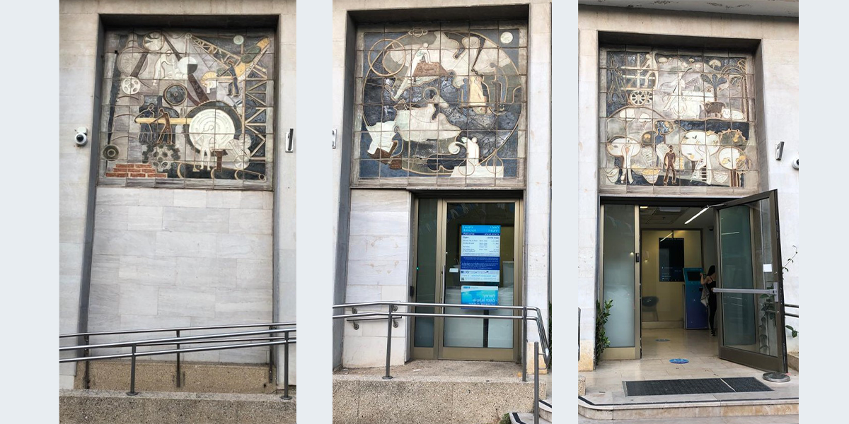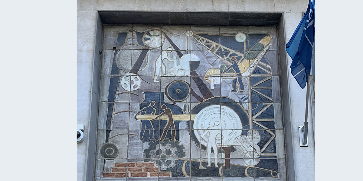 התבליט נוצר ב־1956 בבית המלאכה "כד וספל" שניהלה האמנית חוה סמואל. בתבליט המורכב משלושה לוחות – כל אח מהם מתמקד בענף תעסוקה שונה: הלוח הימני עוסק בנושא חקלאות: רועה צאן, קטיף בפרדס, איסוף יבול. הלוח המרכזי – בבעלי מקצועות חופשיים: מורה, מדען, מהנדס, והלוח השמאלי – בתעשייה: פועלי ייצור במפעלים שונים.