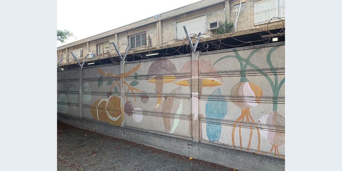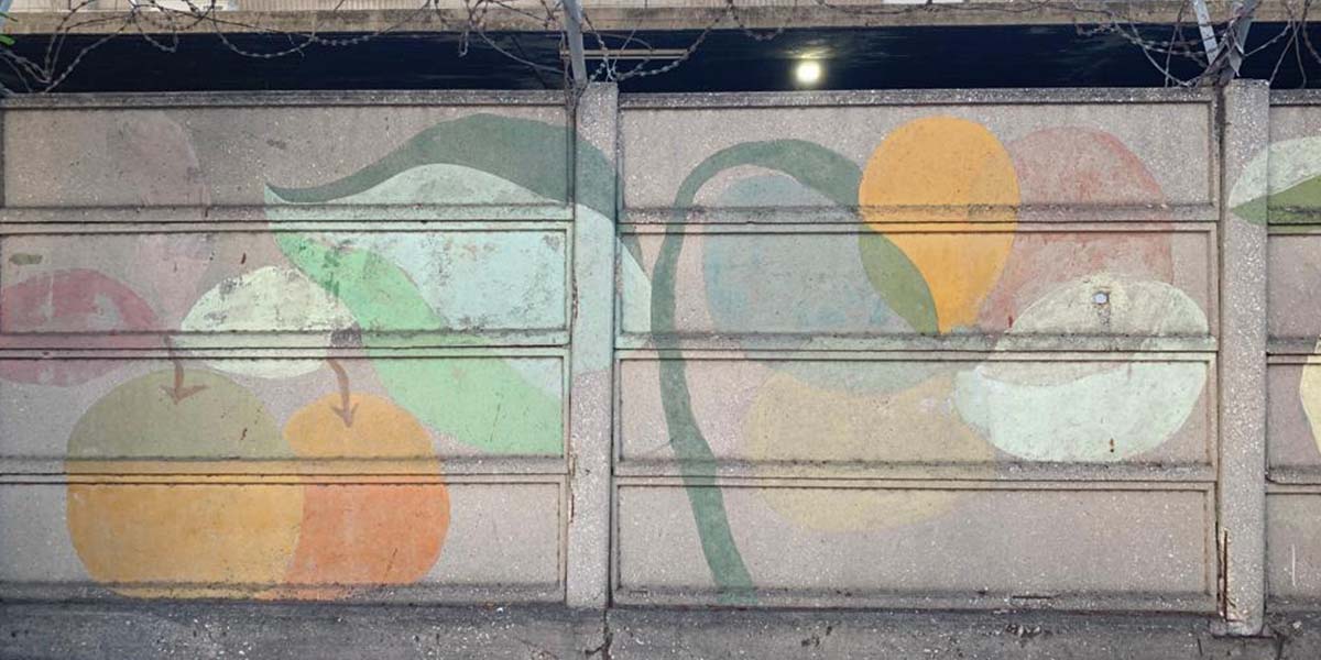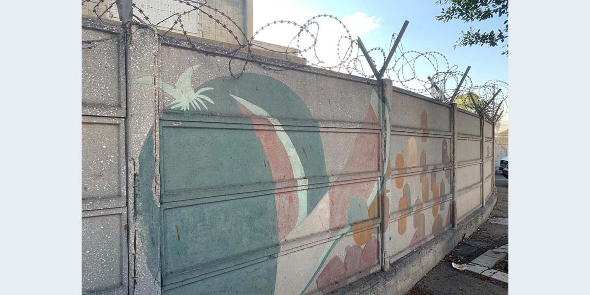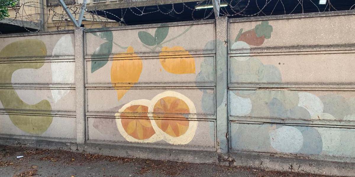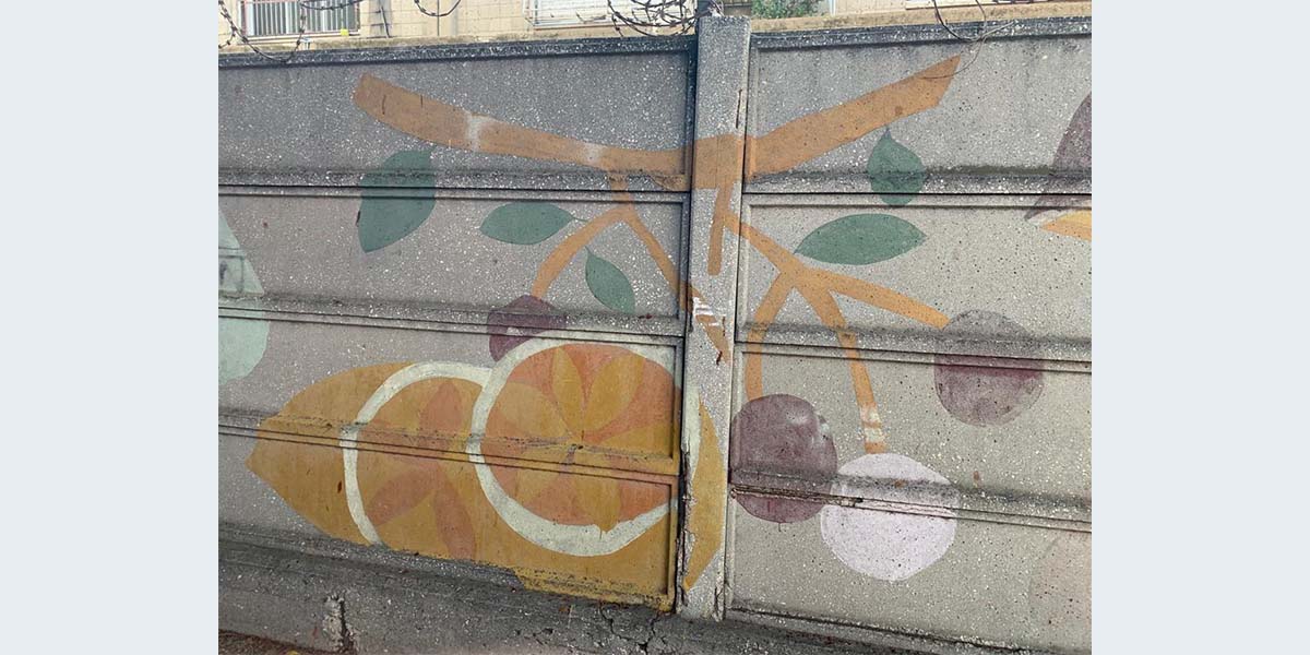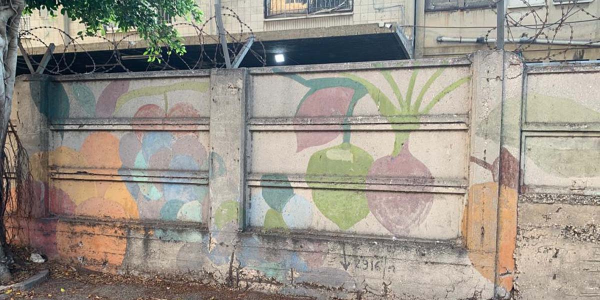 פֵרות וירקות לאורך גדר השוק הסיטונאי בחיפה. את הציור יזמו אנשי היחידה לשיפור פני העיר בעיריית חיפה.