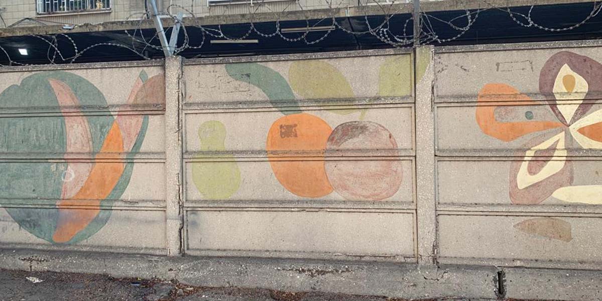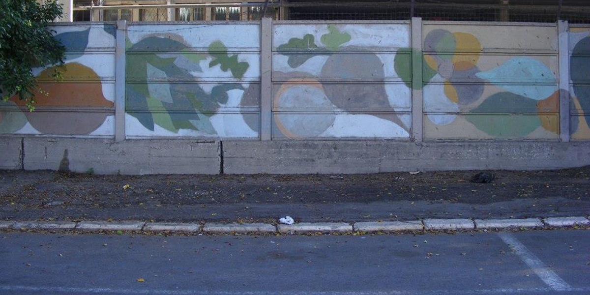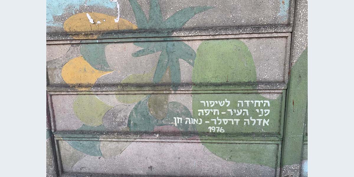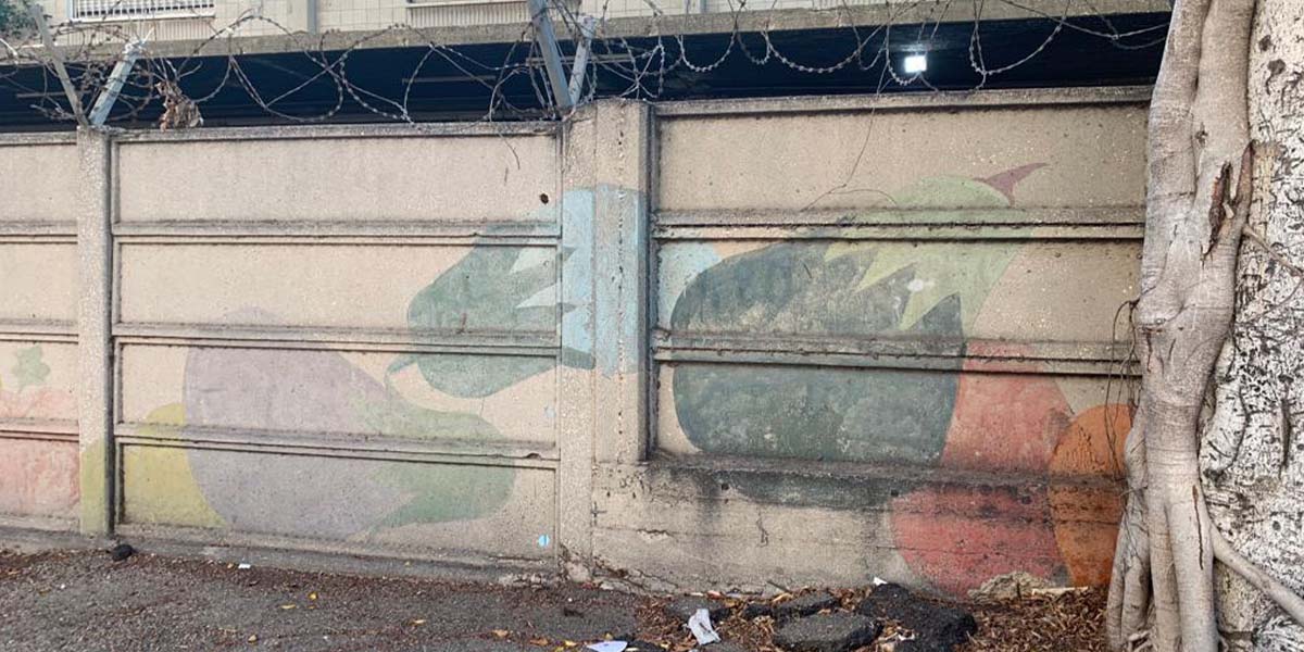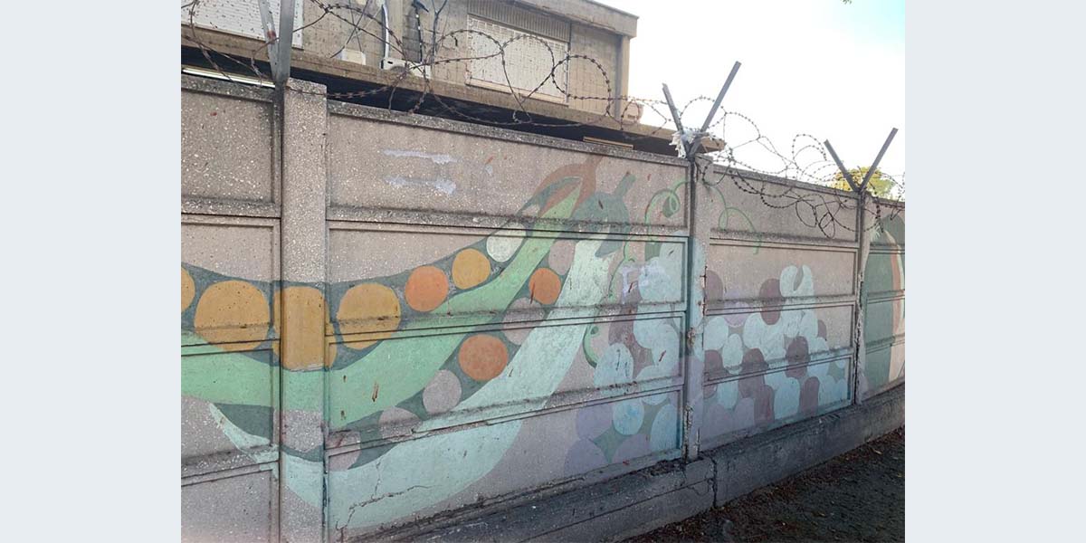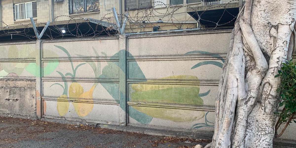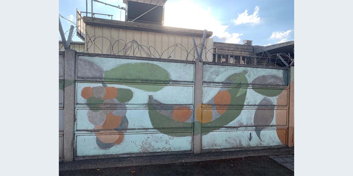 פֵרות וירקות לאורך גדר השוק הסיטונאי בחיפה. את הציור יזמו אנשי היחידה לשיפור פני העיר בעיריית חיפה.