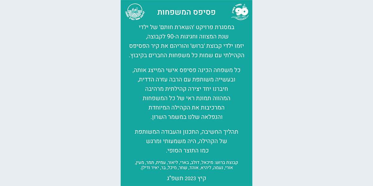 בקיץ 2023 במסגרת מיזם "השארת חותם" של ילדי שנת המצווה וחגיגות ה־90 לקבוצה, יזמו ילדי קבוצת "ברוש": מיכאל, דולב, בארי, ליאור, עמית, תמר, מעין, אורי, נעמה, ליהיא, אוהד, שחר, מיכל, בר, יאיר ודילן והוריהם את קיר הפסיפס הקהילתי עם שמות כל משפחות החברים בקיבוץ. כל משפחה הכינה פסיפס אישי המייצג אותה, ובעשייה משותפת עם הרבה עזרה הדדית, חיברנו יחד יצירה קהילתית מרהיבה המהווה תמונת ראי של כל המשפחות המרכיבות את הקהילה המיוחדת והנפלאה שלנו במשמר השרון. תהליך החשיבה, התכנון והעבודה המשותפת של הקהילה, היה משמעותי ומרגש כמו התוצר הסופי.