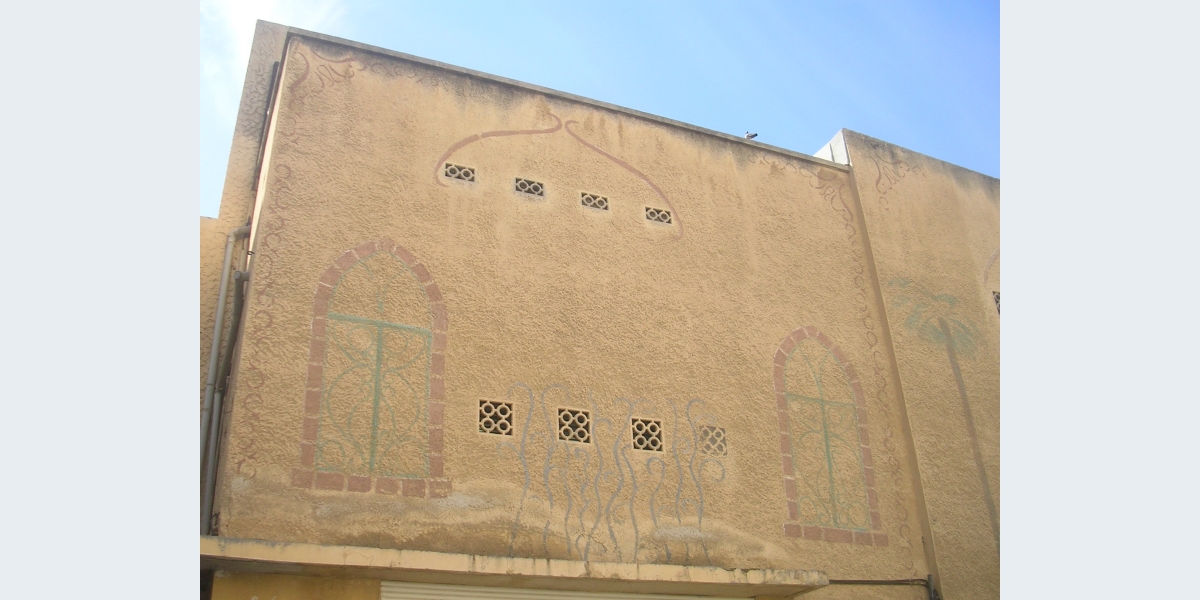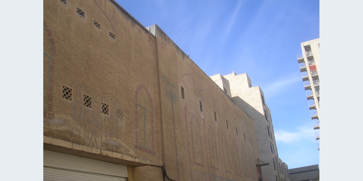 בציור על הקיר החיצוני של קולנוע פאר בהדר הכרמל חיפה מצוירים חלונות וכיפות בסגנון המזרח ועצי דקל המצוירים בצבע על טיח.