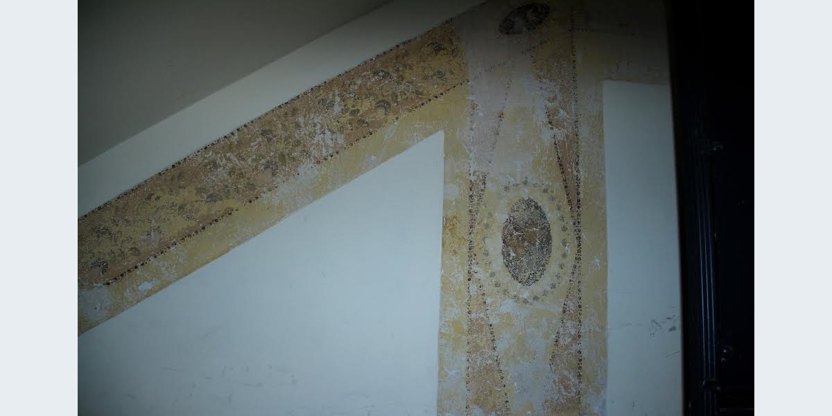 עיטורים גאומטריים על בניין מגורים "בית רחל". המבנה שופץ רק בצד ימין ובחדר המדרגות בחלק שלא שופץ יש כמה ציורי קיר מוזנחים.