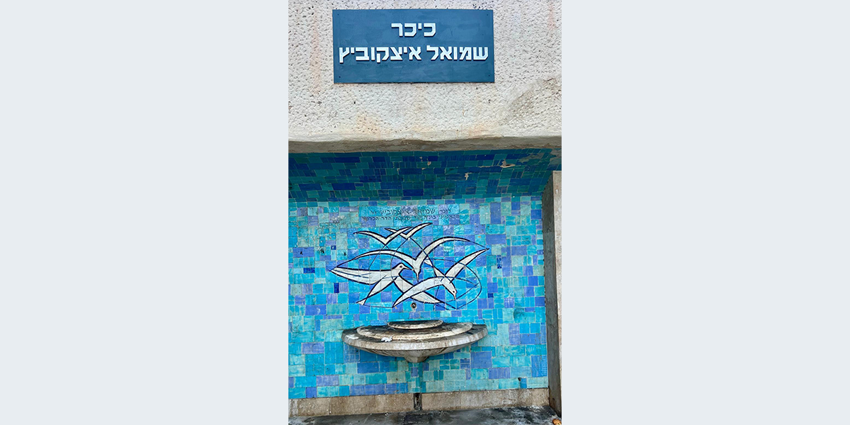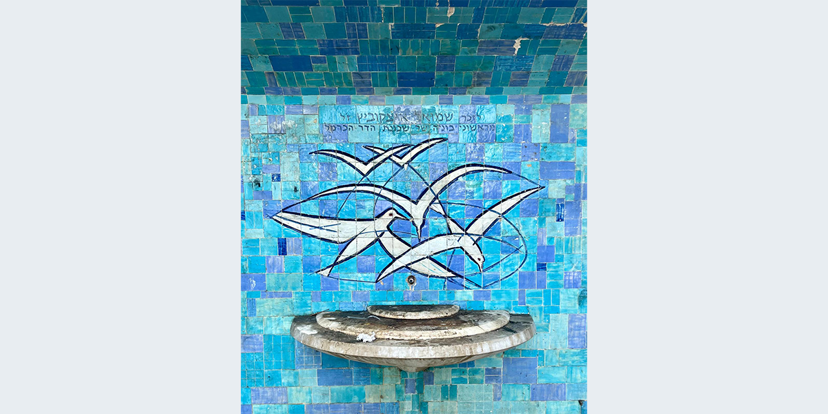 ציור של ציפורים לבנות על אריחי קרמיקה בצבע טורקיז הקבוע מעל ברזייה ציבורית במדרגות איצקוביץ המקשרות בין רחוב החלוץ לרחוב הרצל בחיפה.
