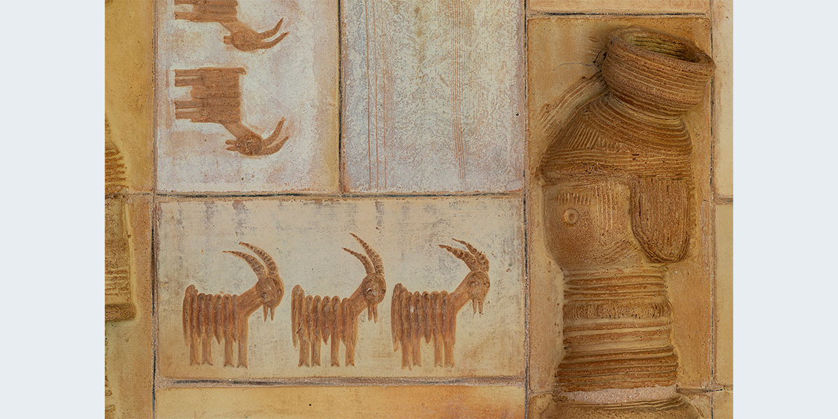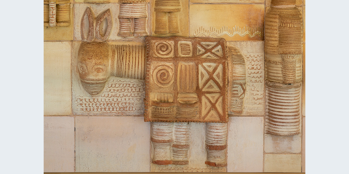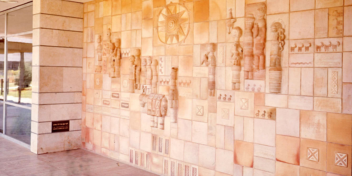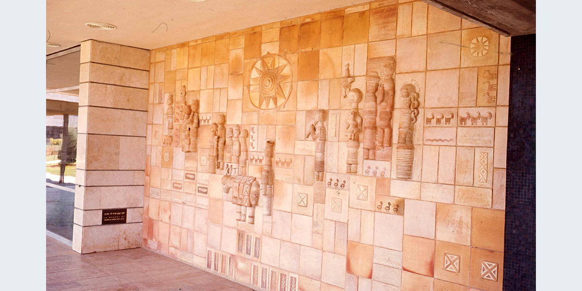 התבליט מציג קבוצה של דמויות אשר עוצבו באובניים. שריפת החומר בתנור הטביעה את לשונות האש בצבע ובחומר. הצבעים נמשחו בחופשיות, בהשראת צבעי המדבר, והופקו מהאדמות הצבעוניות של מכתש רמון. אף שאין ביצירה ניסיון לתיאור נוף פרספקטיבי, הקומפוזיציה עושה שימוש באמצעים כגון קנה מידה שונה לתיאור שורות בעלי החיים, סידור דמויות האדם על פני מישור מעוגל ועוד. כך נוצרת בתבליט תחושה של מרחב דינמי", מיכל מור, "אמנות בעברית", עמ' 104.