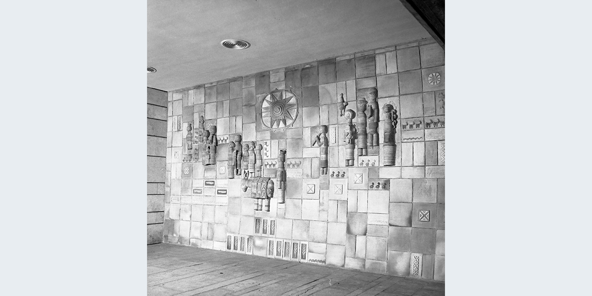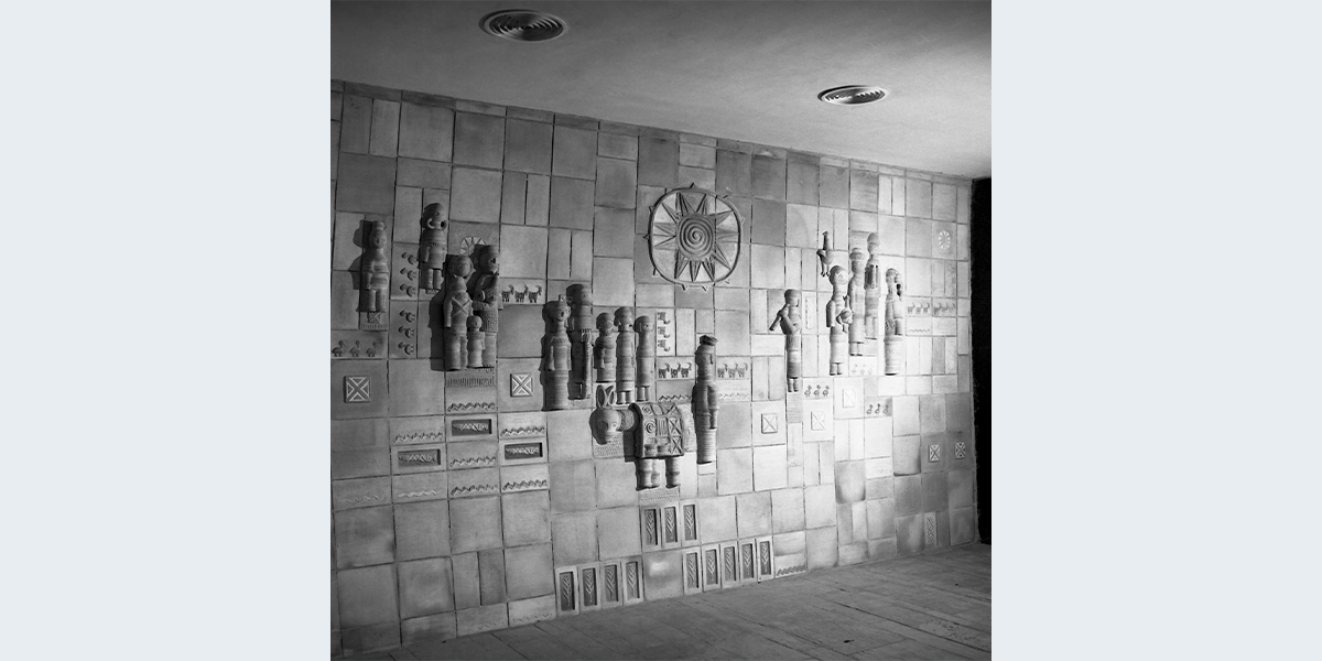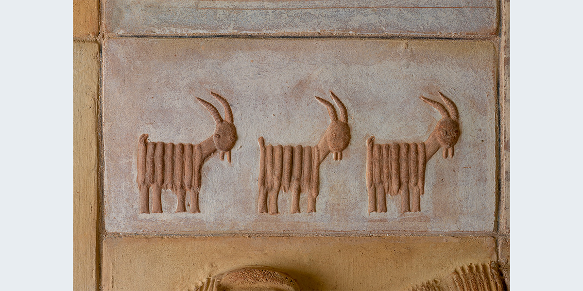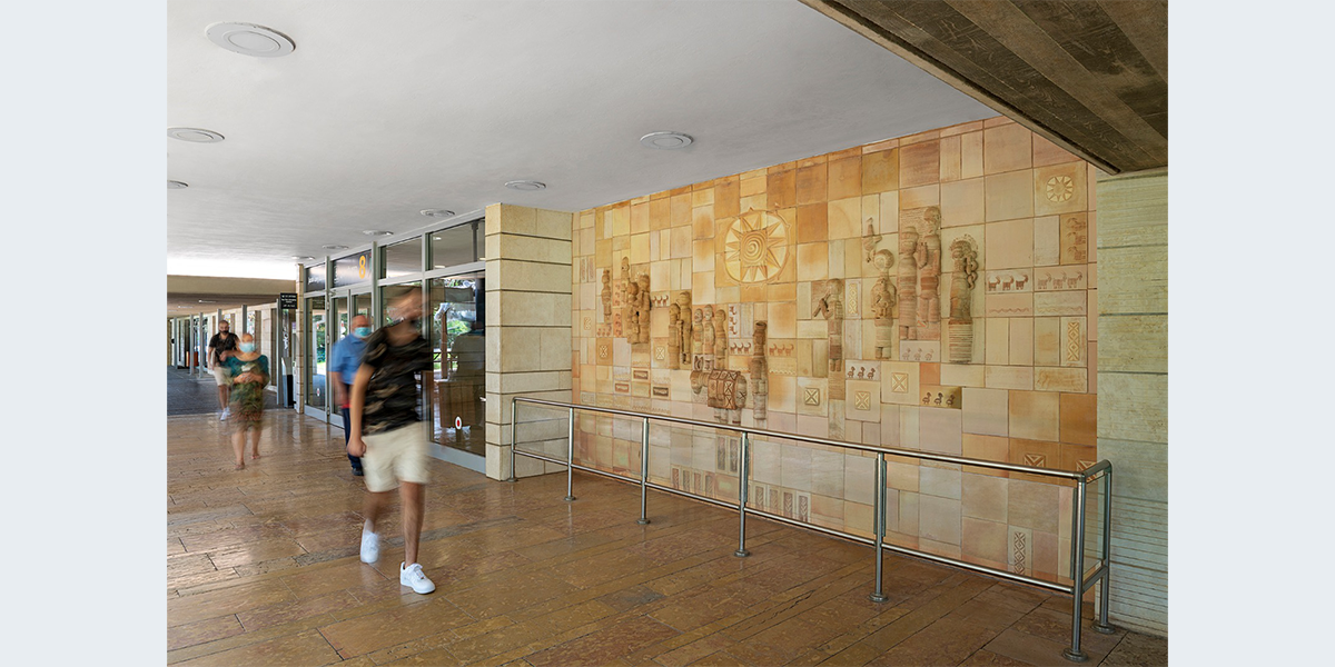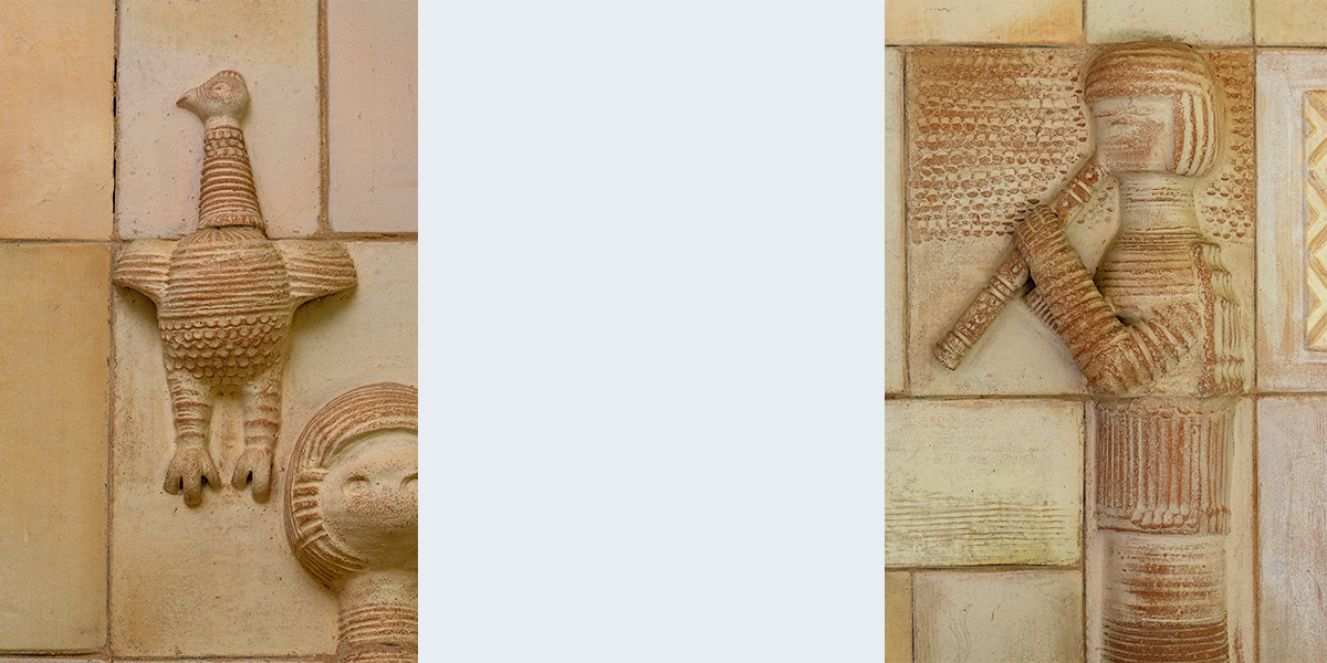 התבליט מציג קבוצה של דמויות אשר עוצבו באובניים. שריפת החומר בתנור הטביעה את לשונות האש בצבע ובחומר. הצבעים נמשחו בחופשיות, בהשראת צבעי המדבר, והופקו מהאדמות הצבעוניות של מכתש רמון. אף שאין ביצירה ניסיון לתיאור נוף פרספקטיבי, הקומפוזיציה עושה שימוש באמצעים כגון קנה מידה שונה לתיאור שורות בעלי החיים, סידור דמויות האדם על פני מישור מעוגל ועוד. כך נוצרת בתבליט תחושה של מרחב דינמי", מיכל מור, "אמנות בעברית", עמ' 104.