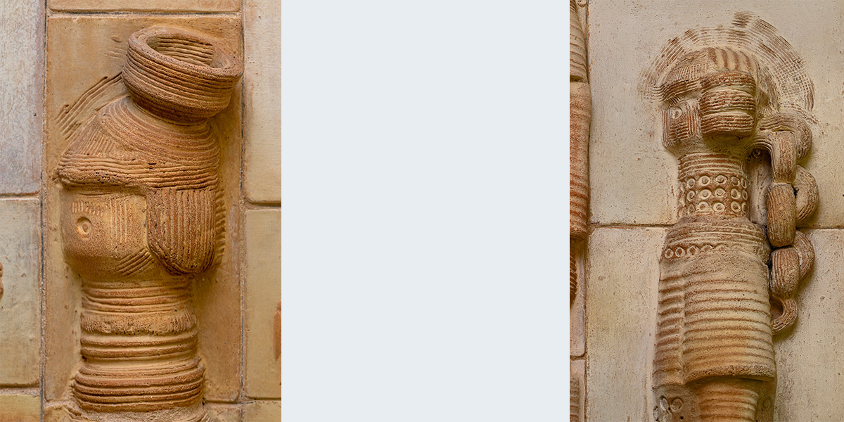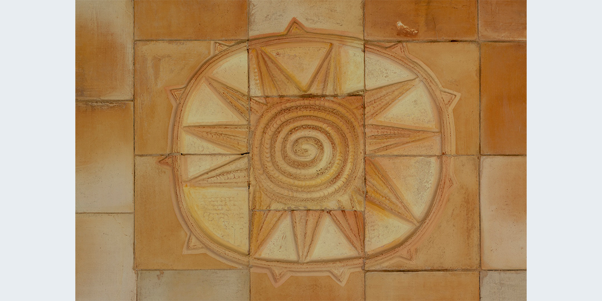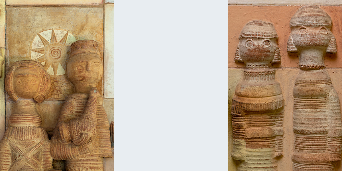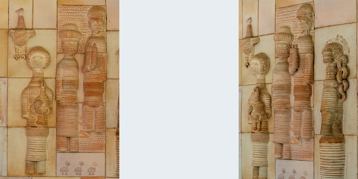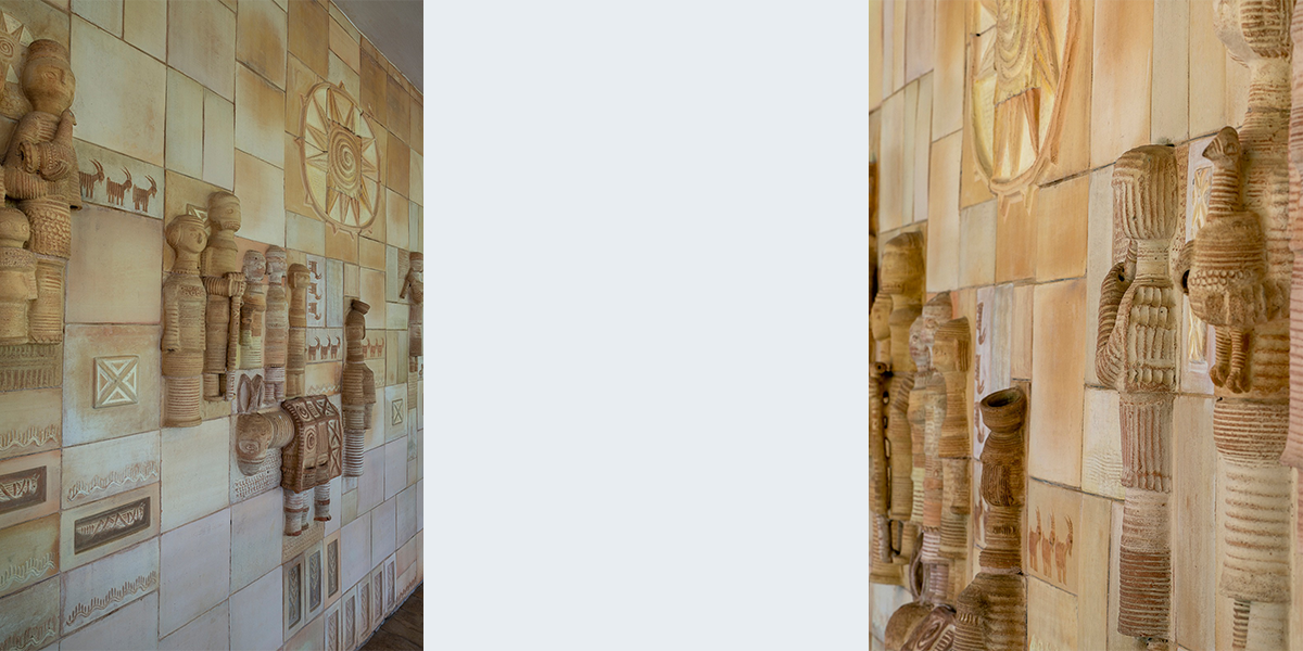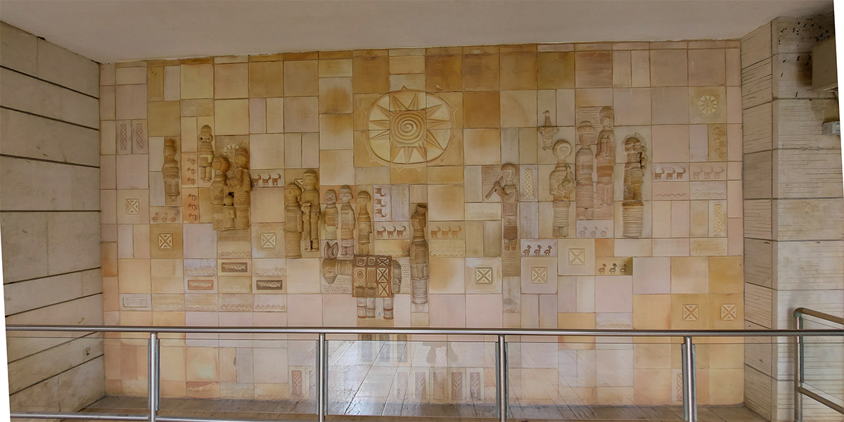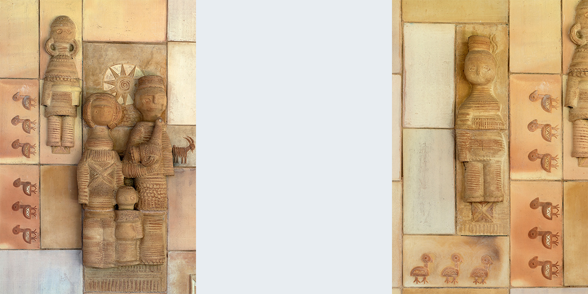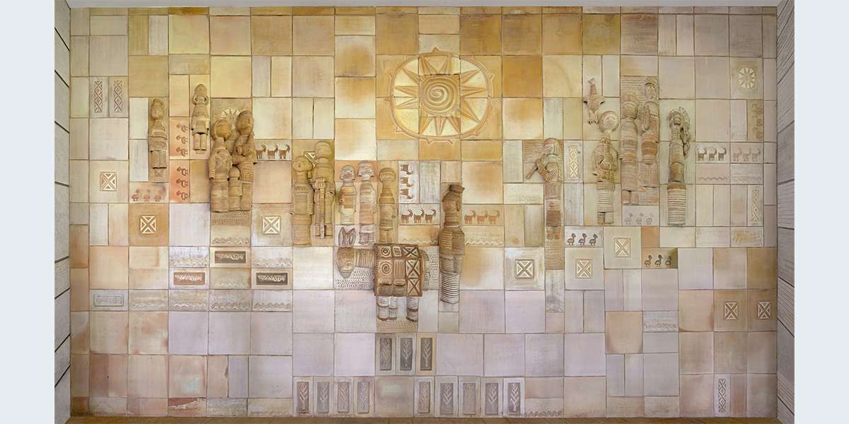 היצירה עשויה מאריחי קרמיקה רבועים – חלקם ריבועיים וחלקם מלבניים. צבעי האריחים שונים: גוני חמרה בהירה, אוקר־שנהב, צהבהב או ורדרד. במרכז היצירה בחלקה העליון נראית שמש עשויה ספירלת חומר וממנה בוקעות 11 קרניים משולשות. לאורך כל החלק האמצעי של היצירה נראות 17 דמויות אנושיות עשויות חומר בשלושה מקבצים. בין מקבצי הדמויות מונחים אריחים ועליהם מקבצים של חיות קטנטנות: 3 עזים או גדיים ו־3 ברווזים או תרנגולים, חלקם של אריחים אלו אנכיים וחלקם אופקיים. באחד מהם נראה חגב (או ארבה) הממלא את כל האריח. בכל היצירה משובצים מדי פעם אריחים מרובעים ובהם עיטור של איקס בתוך ריבוע עם ארבעה משולשים תואמים, וכן אריחים מלבניים אופקיים ובהם תיאור גל עשוי משני קווים בולטים. שמש נוספת מוקטנת בתוך אריח נמצאת בחלק הימני העליון של היצירה וכן מאחורי מקבץ האנשים השמאלי בה. במקבץ הדמויות הימני יש ארבע דמויות ונשר. כל הדמויות מתפרשות על גובה של כשלושה אריחים מרובעים והן במרקם של תחריט מפוספס. הדמות הימנית בפרופיל פונה שמאלה אל חברה, היא עוטה שמלה מפוספסת עם עיטור באזור הבטן ועיטור גבוה (אולי תכשיט) באזור הצוואר. צמתה משתלשלת על עורפה. השנייה מימין עומדת זקוף ומביטה לעבר הצופה ובידיה ספר תורה קטן, אולי היא לובשת מכנסיים. השלישית חובשת טורבן או כובע חסידי (ואולי יש לה זקן). הדמות הרביעית לבושה בשמלה ולראשה מטפחת או כיסוי ראש, והיא נוטה שמאלה כמו פונה אל הקבוצה. היא מחזיקה בידה תרנגול או תרנגולת. מעל ראשה מצד שמאל עוד בעל כנף גדול (אולי תרנגולת) בערך בגודל שלוש הדמויות האנושיות. במרווח ניכר מהן דמות נוספת, פונה שמאלה והלאה מן הקבוצה ומחללת בחליל. חלק מהריבועים שעליהם הדמויות אינן חלקות אלא בעלות מרקם של תחריט מנוקד על כל פני השטח. בקבוצה המרכזית הנמצאת נמוך יותר, במרחק כמה אריחים מהראשונה, יש שש דמויות אנושיות וחמור אחד. הדמות הימנית ביותר הנושאת על ראשה כד, פונה שמאלה אל הקבוצה והחמור. שלוש הדמויות המרכזיות נמוכות מהשאר, אולי אלה ילדים. משמאל להם נראה זוג; גבר הנושא בידו מטה (אולי בעל זקן) ואישה בעלת תסרוקת מסוגננת לובשת שמלה. כל הדמויות האחרונות פונות אל הצופה. משמאל לדמות הראשונה ומתחת לדמויות הנמוכות עומד חמור בפרופיל ופונה שמאלה. רוב גופו מעוטר פסים ועל גבו שמיכה ובה חרוטים עיטורים גאומטריים, ראשו פונה מטה ואוזניו זקופות כלפי מעלה. קבוצת הדמויות השמאלית גבוהה מהמרכזית, אולי בגובה הקבוצה הימנית. רואים בה בני זוג: הגבר חובש תרבוש נמוך והאישה בעלת התסרוקת הנשית לובשת שמלה עם עיטור איקס ייחודי. ביניהם ניצב ילד קטן. הגבר נושא תרנגול/ת קטנ/ה, וברקע נראית שמש קטנה. מעליהם משמאל רואים עוד ילד/ה קטנ/ה (אולי בתסרוקת קוקיות). משמאל להם במרחק אריח עומד אדם נוסף הפונה לצופה ולראשו תרבוש נמוך. בתחתית היצירה ובמרכזה יש כמה אריחים מלבניים אנכיים ועליהם עיטור צמחי (אולי שיבולת), חלקם צמודים זה לזה ואחרים ממוקמים ברווח של כמה אריחים. חתימתה של האמנית גדולה עוגן חרוטה באותיות דפוס על אריח מלבני אופקי בקצה השמאלי של היצירה, בערך בשליש גובהה.