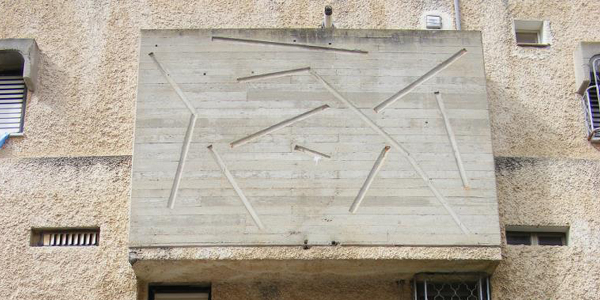 קווים חרוטים בבטון מעל הכניסה הראשית למבנה.