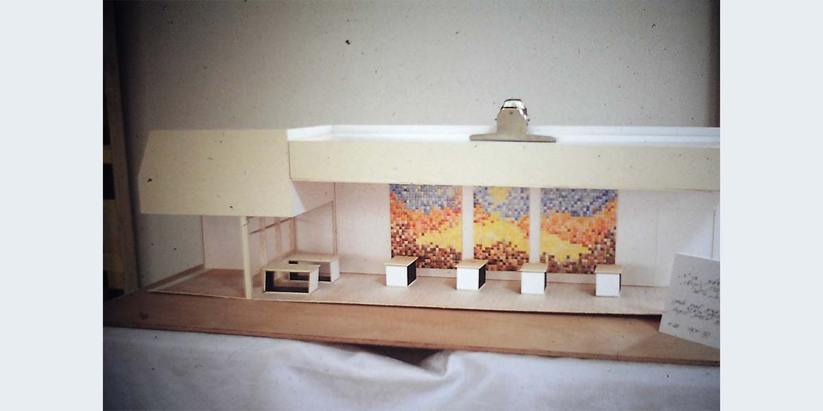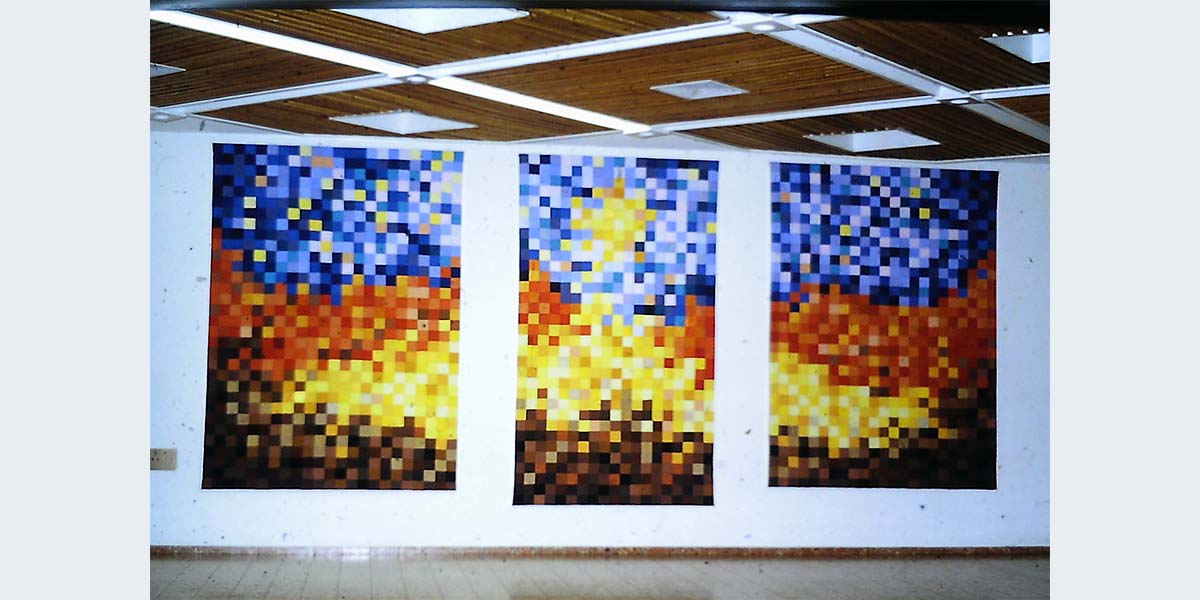טריפטיך העשוי מעבודת טלאים. בקיבוץ החליטו ליצור קישוט לחדר האוכל, והועלו שתי הצעות: קיר קרמי של משה סעידי, האמן מכפר מנחם ועבודת טלאים, שהגו חברי הגרעין הצפון־אמריקאי "מח" ששהה אז בגבולות. ההצעה השנייה התקבלה, ולימים לא נותר איש מאנשי הגרעין בקיבוץ.