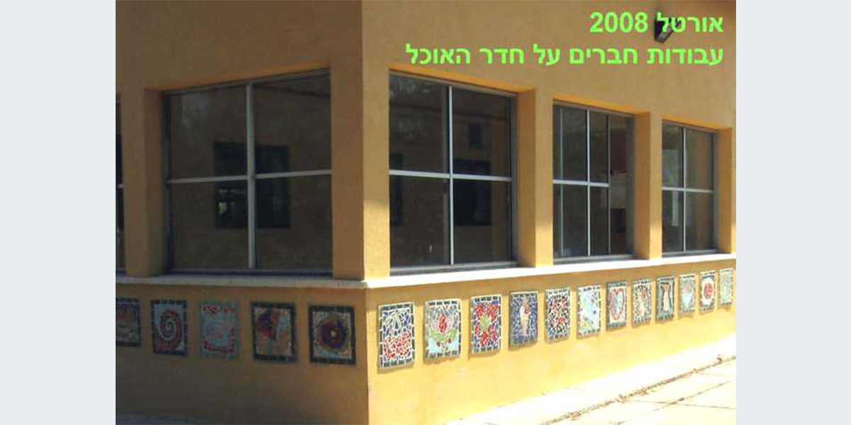 חברי קיבוץ אורטל עיטרו ריבועי פסיפס בהנחיית האמן רפי בונה. אריחי הפסיפס נתלו על חדר האוכל.