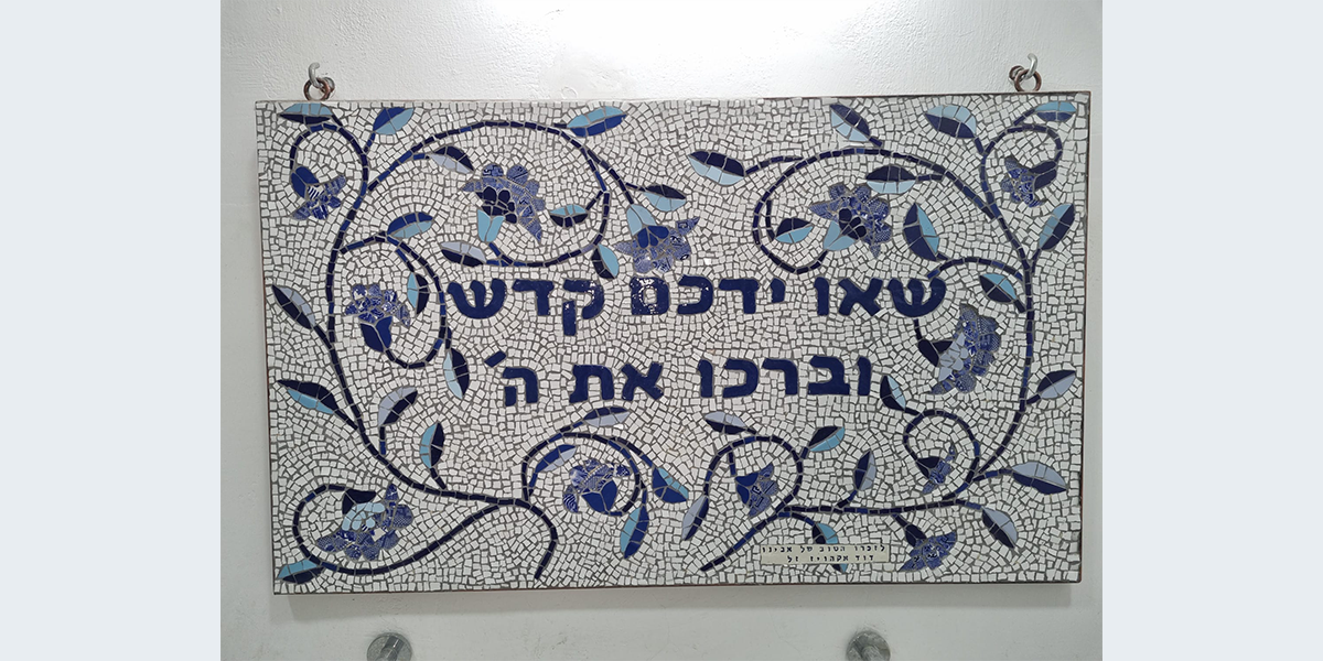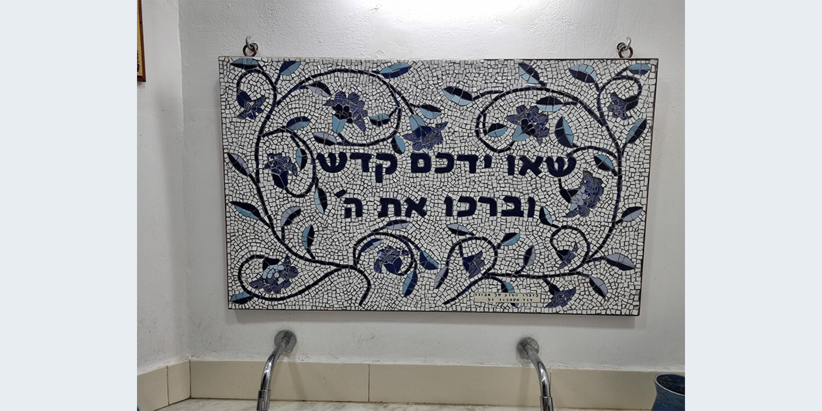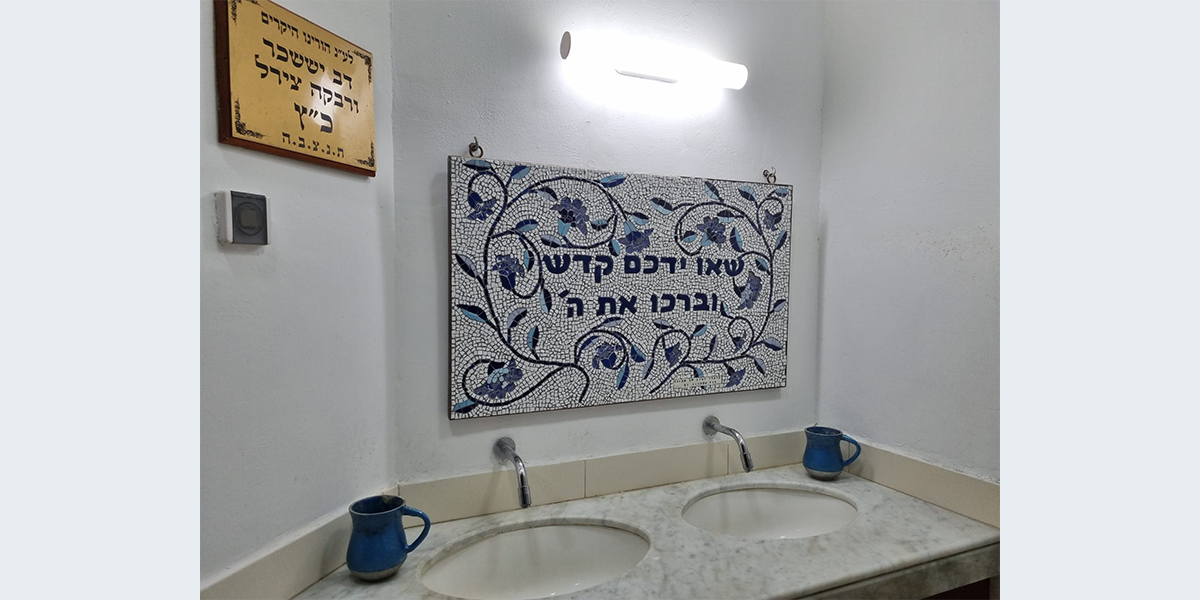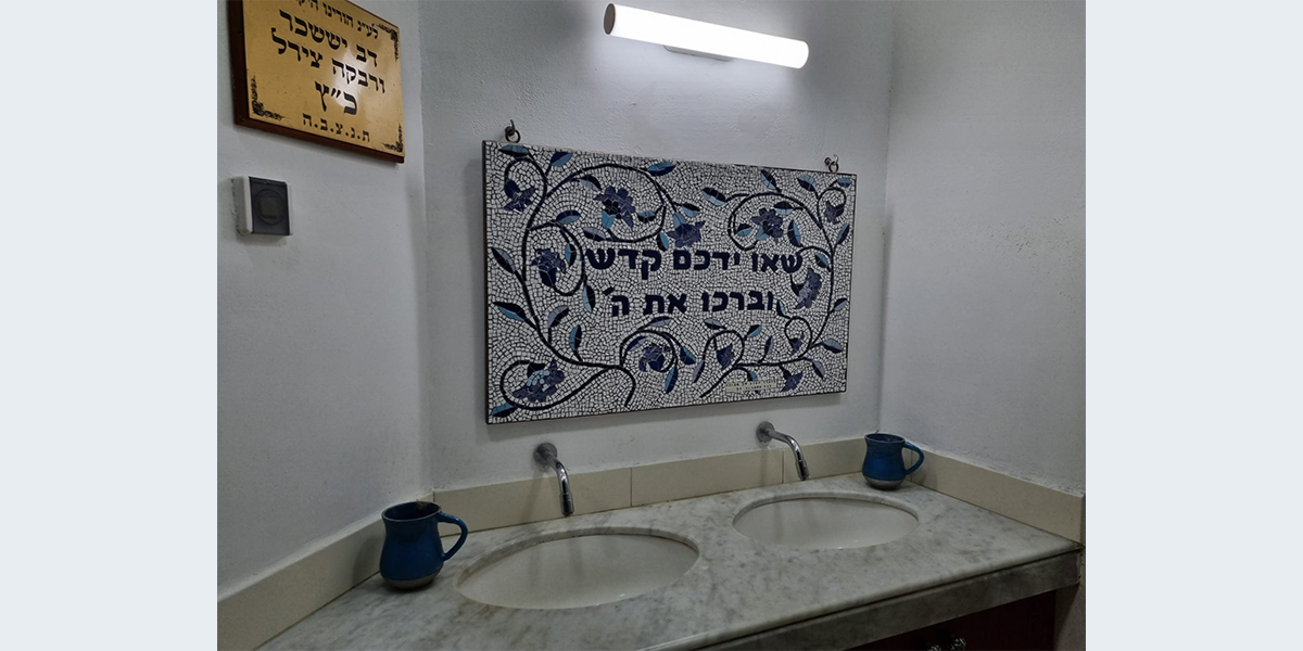 פינה לנטילת ידיים לזכר אביה של האמנית דוד אקהויז ז"ל בבית הכנסת היכל בנימין זאב.