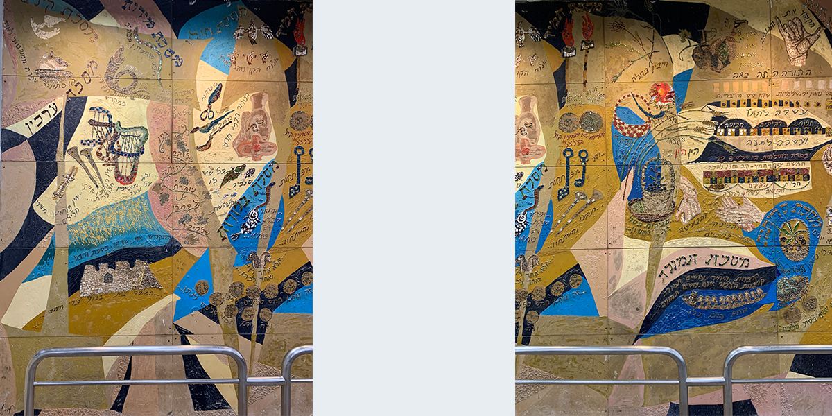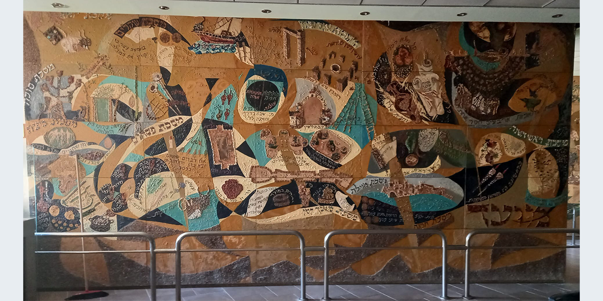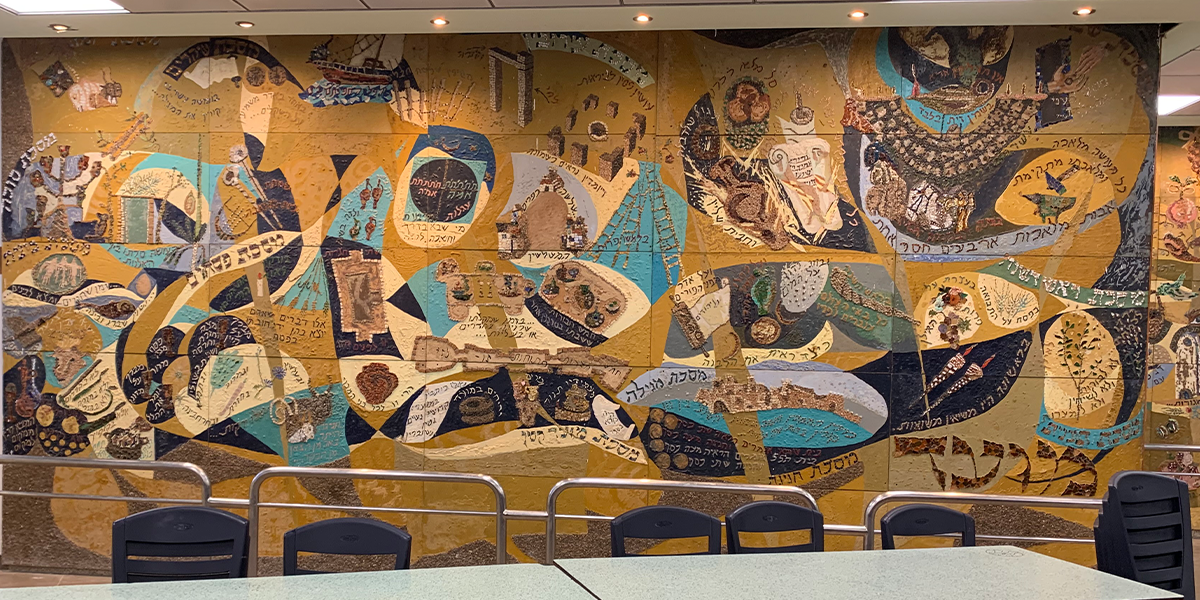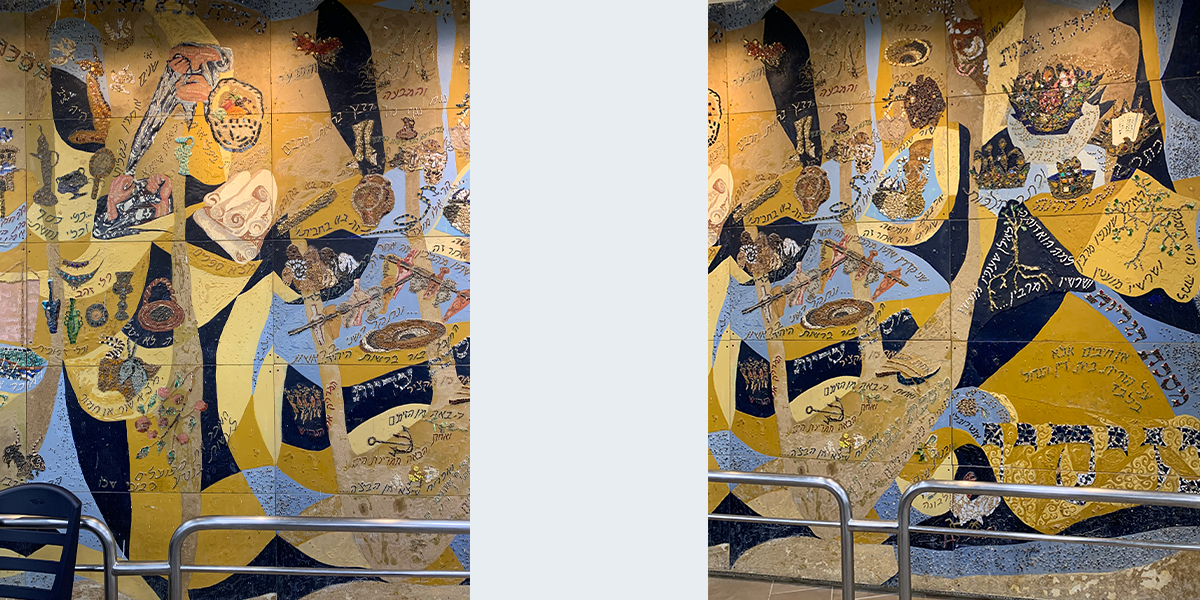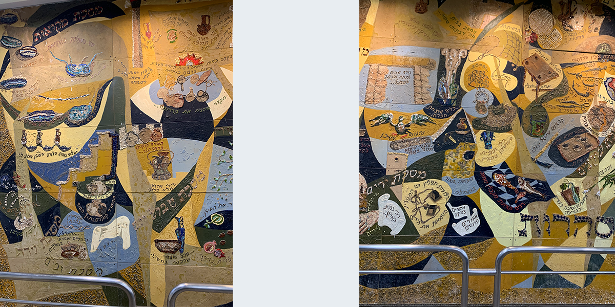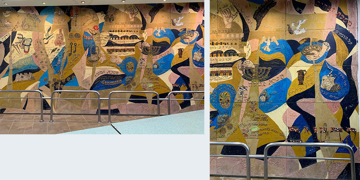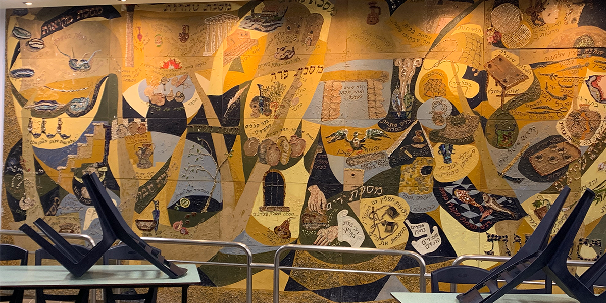 שש התמונות קבועות לפי סדר הש"ס לאורך הקיר החיצוני (המערבי) של האולם הגדול, הבנוי בצורת זיגזאג, שכחלונות פאנוראמיים מפרידים בין תמונה לתמונה, ומאירים אותן באור יום, ובערב בתאורה מלאכותית מיוחדת. עם הכניסה לאולם אין רואים את החלונות ונדמה לצופה, כי שש התמונות מצטרפות ליריעה ציורית אחידה, המשתרעת לאורך כל האולם. עם התקדמותנו לאמצע האולם מתגלות לעינינו בזו אחר זו שש התמונות, שלכל אחת מהן קומפוזיציה משלה, ציורף מיוחד של צורות וצבעים, ואוירה מיוחדת בהתאם לתוכן המיוחד של כל סדר וסדר. ככל שאנו מתקרבים לתמונה, נחשפים לעינינו חלקי התמונה המתארים מסכתות ופרשיות שונות, באותו סדר, והמשולבים זה בזה בכתובות מאותן מסכתות ופרשיות, המשמשות בעת ובעונה אחת מפתחות לנושאים השונים וגם חוליות המקשרות את הציורים השונים לקומפוזיציה אמנותית אחת.