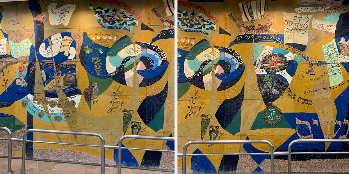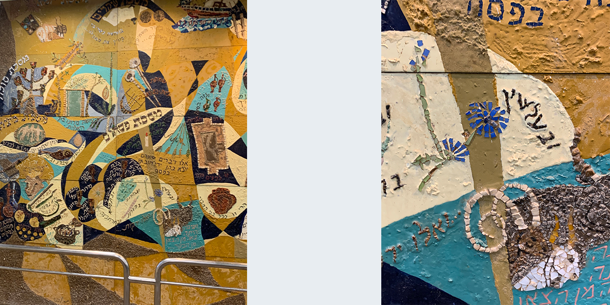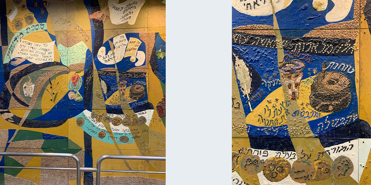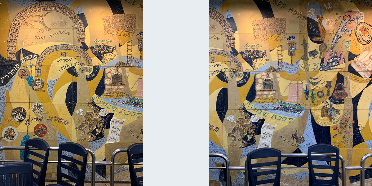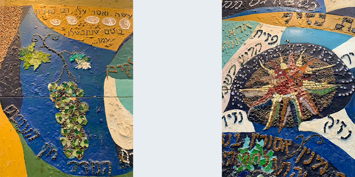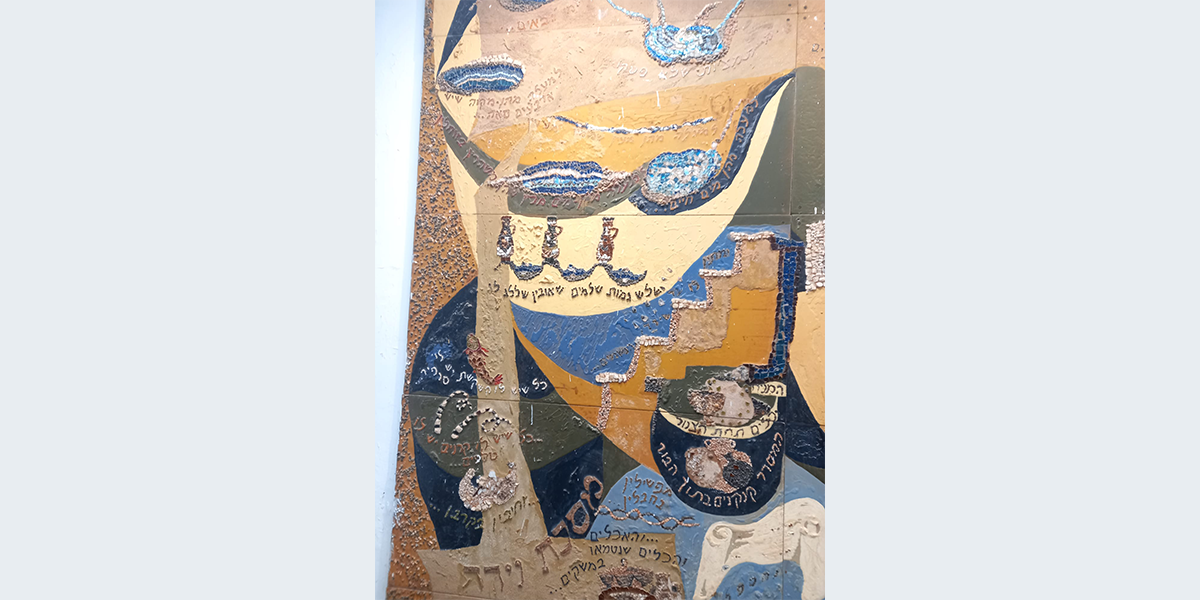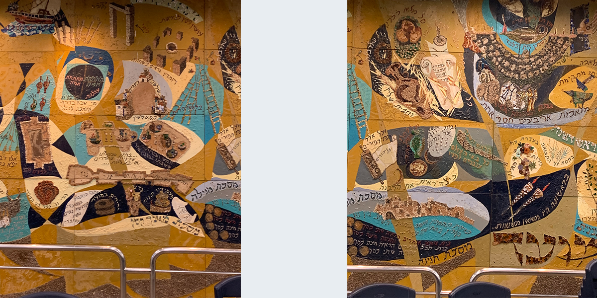שש התמונות קבועות לפי סדר הש"ס לאורך הקיר החיצוני (המערבי) של האולם הגדול, הבנוי בצורת זיגזאג, שכחלונות פאנוראמיים מפרידים בין תמונה לתמונה, ומאירים אותן באור יום, ובערב בתאורה מלאכותית מיוחדת. עם הכניסה לאולם אין רואים את החלונות ונדמה לצופה, כי שש התמונות מצטרפות ליריעה ציורית אחידה, המשתרעת לאורך כל האולם. עם התקדמותנו לאמצע האולם מתגלות לעינינו בזו אחר זו שש התמונות, שלכל אחת מהן קומפוזיציה משלה, ציורף מיוחד של צורות וצבעים, ואוירה מיוחדת בהתאם לתוכן המיוחד של כל סדר וסדר. ככל שאנו מתקרבים לתמונה, נחשפים לעינינו חלקי התמונה המתארים מסכתות ופרשיות שונות, באותו סדר, והמשולבים זה בזה בכתובות מאותן מסכתות ופרשיות, המשמשות בעת ובעונה אחת מפתחות לנושאים השונים וגם חוליות המקשרות את הציורים השונים לקומפוזיציה אמנותית אחת.