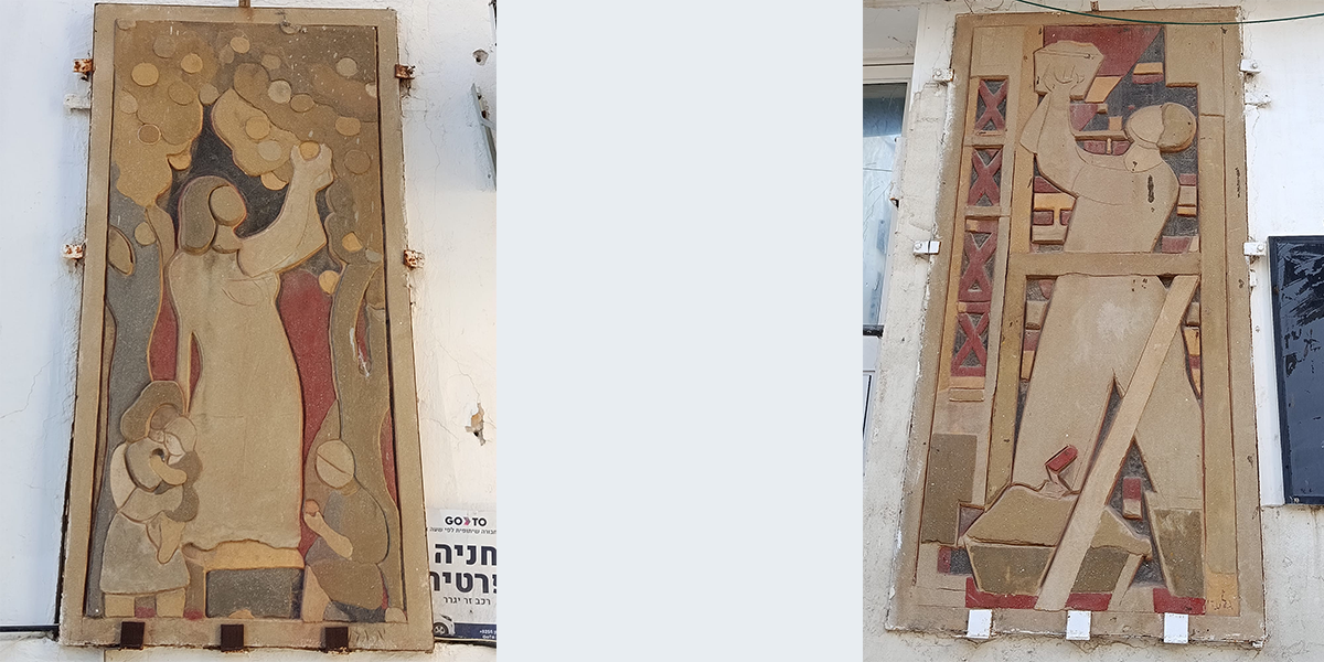 שלושה תבליטים צבועים שיצר האמן אהרון גלעדי לגלריה "עידן" לרגל שינוי שמה (קודם לכן היא נקראה גלריה לאומנות כ"ץ) ומעברה למשכנה החדש ברח' פרישמן 19 בתל אביב־יפו. הגלריה פעלה באתר זה עד שנסגרה בשנת 1974. עם השנים התחלפו בתי העסק בחזית המבנה. במקום פעלה עד תחילת שנות ה־2000 חנות העתיקות "גלריה שלי".