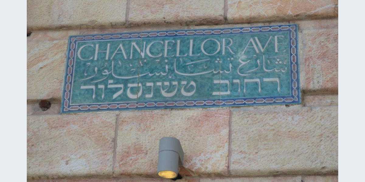 שלט רחוב מתקופת המנדט לרחוב טשנסלור (כיום רח' שטראוס).