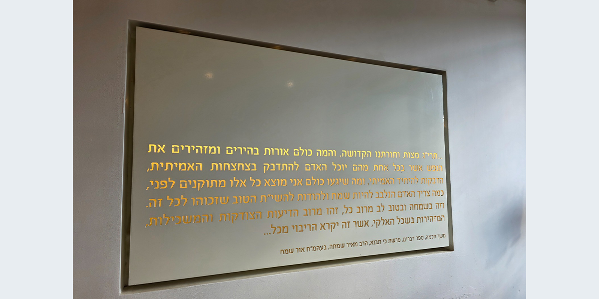 כיוון שבמקור יועד הבניין לבתי מגורים, לא עוצבה בו כניסה ייצוגית כראוי למבנה ציבור. כדי לשנות זאת תכנן האדריכל את "שער האותיות". זהו אלמנט פיסולי עשוי כולו אותיות ברזל, ואלה מתחברות לפסוקים מהספר "משך חכמה" (1927) שכתב הרב מאיר שמחה הכהן, הרב שעל שמו קרויה הישיבה "אור שמח". המאמצים שהשקיעו האדריכל וצוותו כדי שהכתוב יהיה קריא לא צלחו, ולכן לנוחות הקהל, על קיר בכניסה למבואה תלוי הטקסט. השער מרשים ומושך את מבטם של הנכנסים בו כלפי מעלה, הוא ממסגר את השמיים באותיות עבריות ומרמז על הרצון של המקום לחזק את הקשר בין האדם ובין שמיא, לפי מיכאל יעקובסון, חלון אחורי.