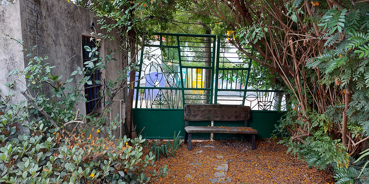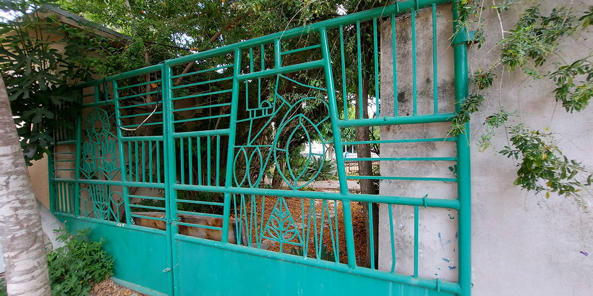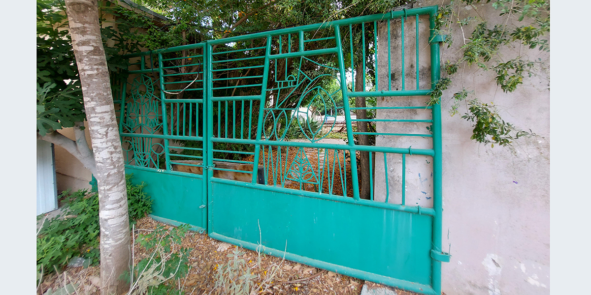 שער הקיבוץ הישן שיצר האמן שמואל כץ. בשיפוץ השער פורק והורכב מחדש במקום אחר, בגינה מול חדר האוכל הישן.