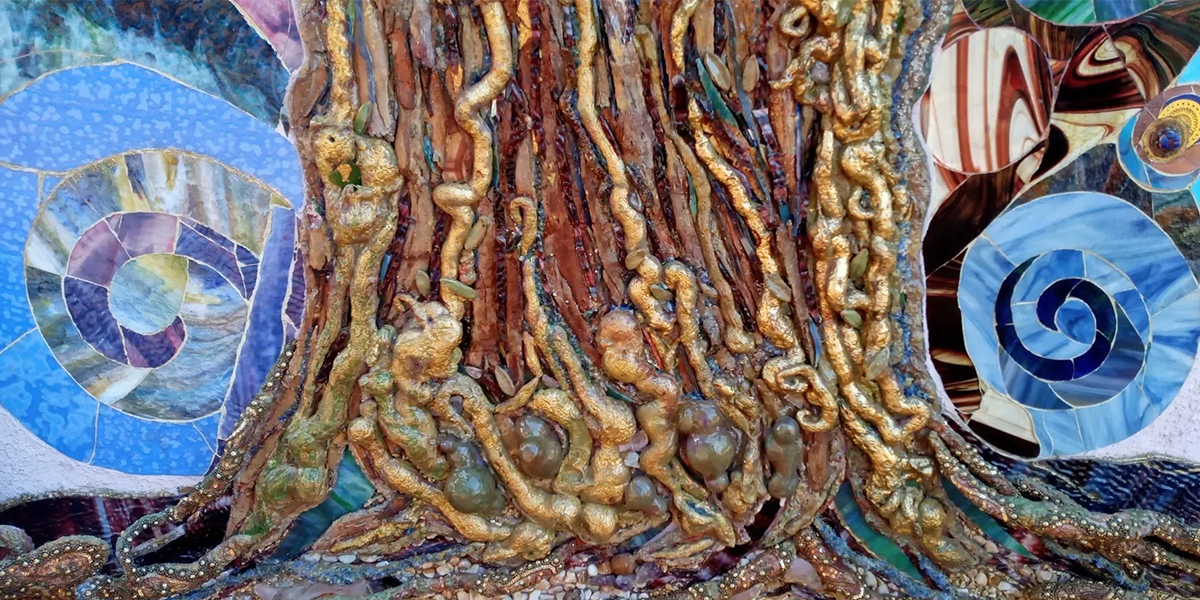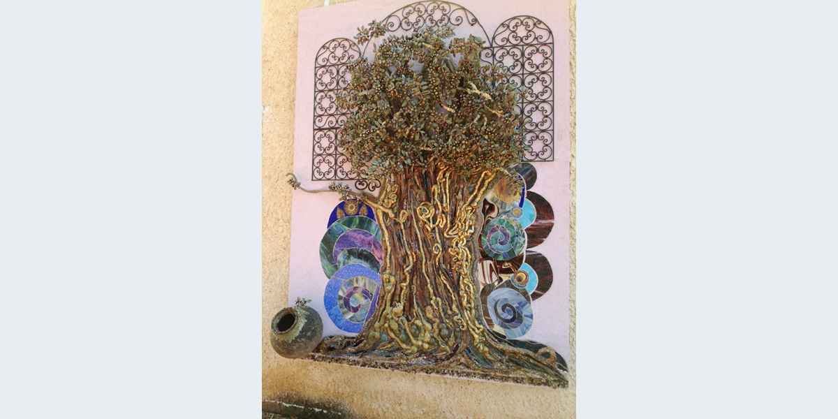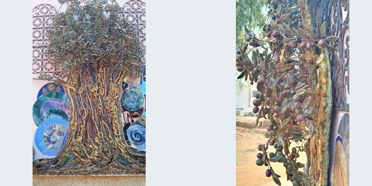 בעבודה קהילתית בחלקהּ מוצגים שמות חברי קהילת נורדיה כפֵרות ועלים של עץ זית.