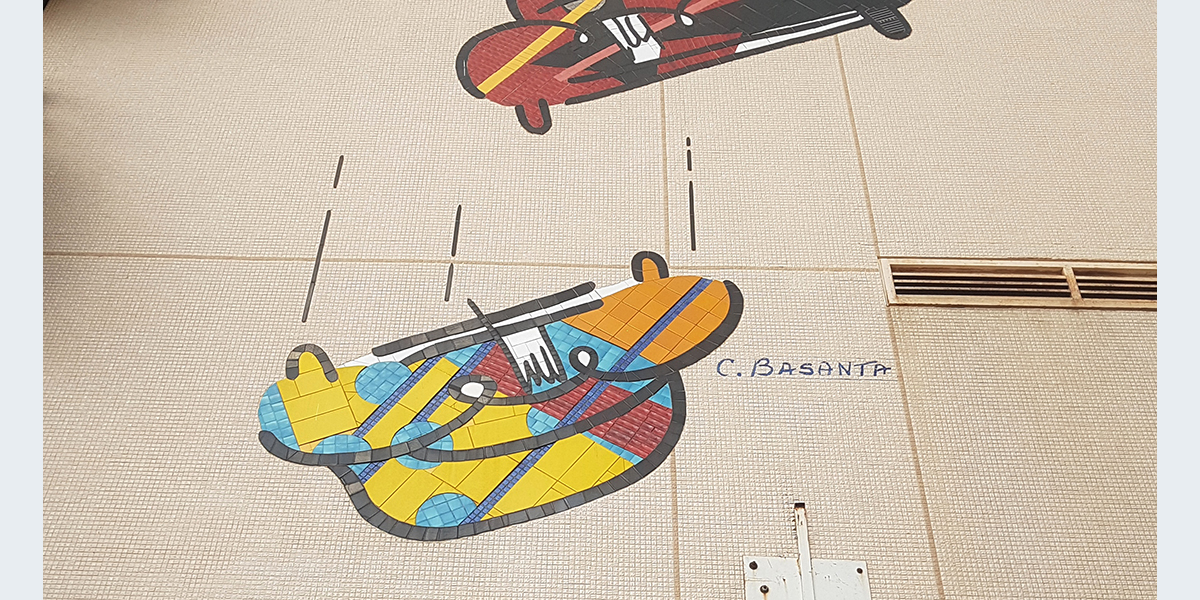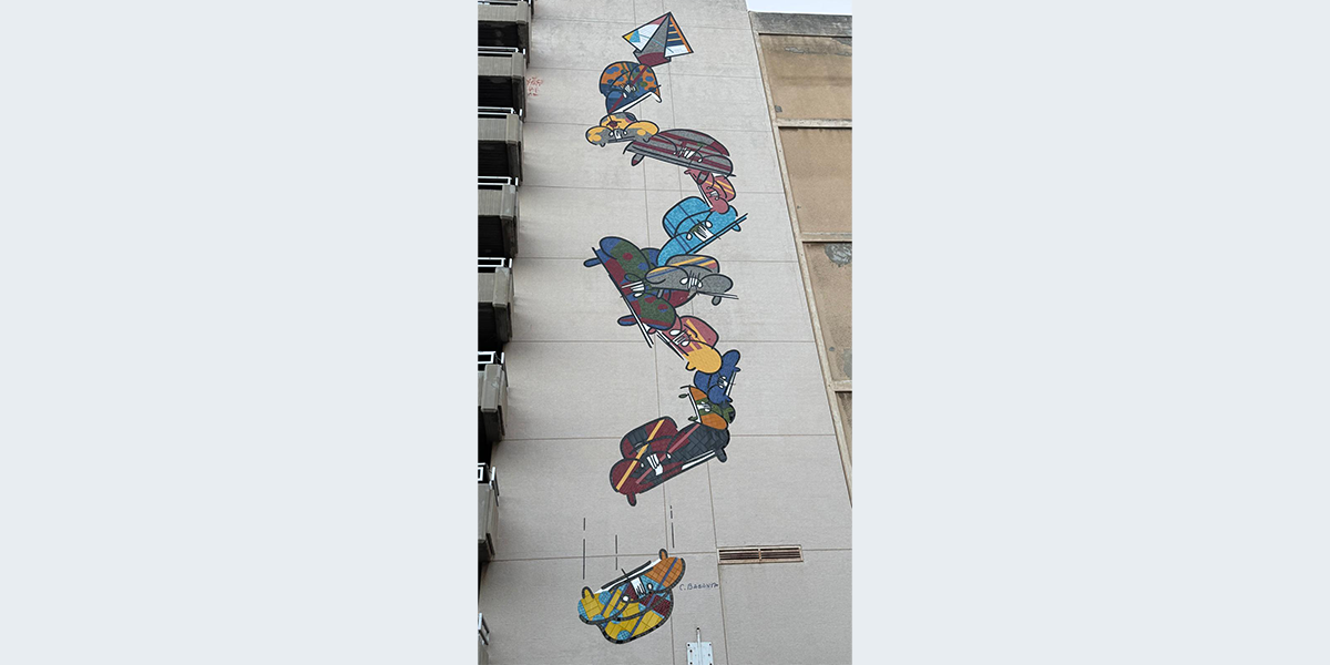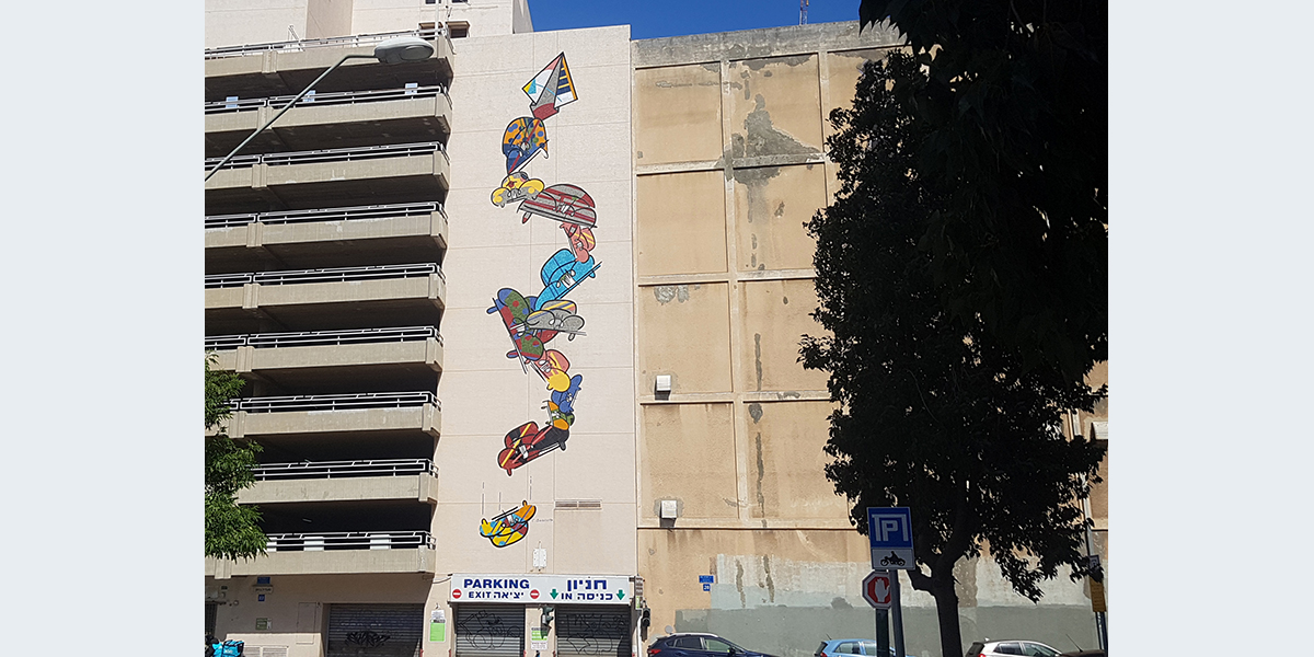 היצירה גדולת־הממדים מעטרת את חזית בניין החניה של חברת אבן זיו הפונה לרחוב סעדיה גאון. בעבודה יש 11 מכוניות צבעוניות קשורות הממריאות אל על במטוס נייר, ומכונית אחת נשמטת… האמן קרלוס בסנטה הוא קנדי יליד ספרד, ויש עוד עבודות שלו בארץ שנעשו בשנים 1983–1998. עוד עבודה של בסנטה מכונית צהובה נמצאת בחזית הבניין הפונה לרחוב צקלג.