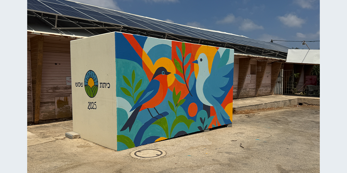 האמן מירון אלגרישי צייר את הציור על המיגונית עם כיתת שמש, בני המצווה בקיבוץ, כמתנה למשק.