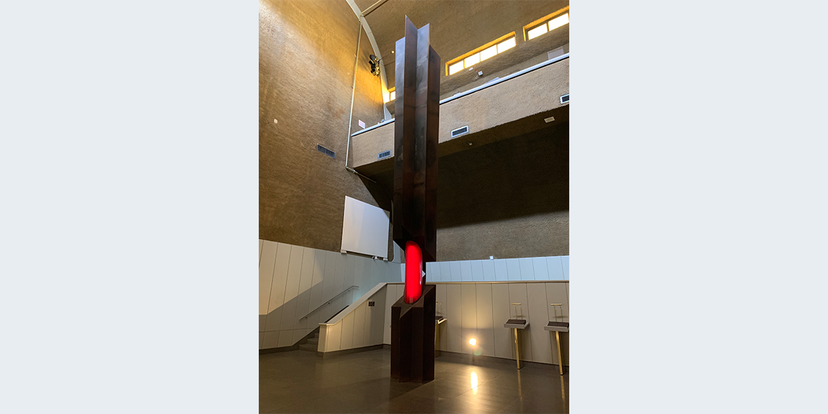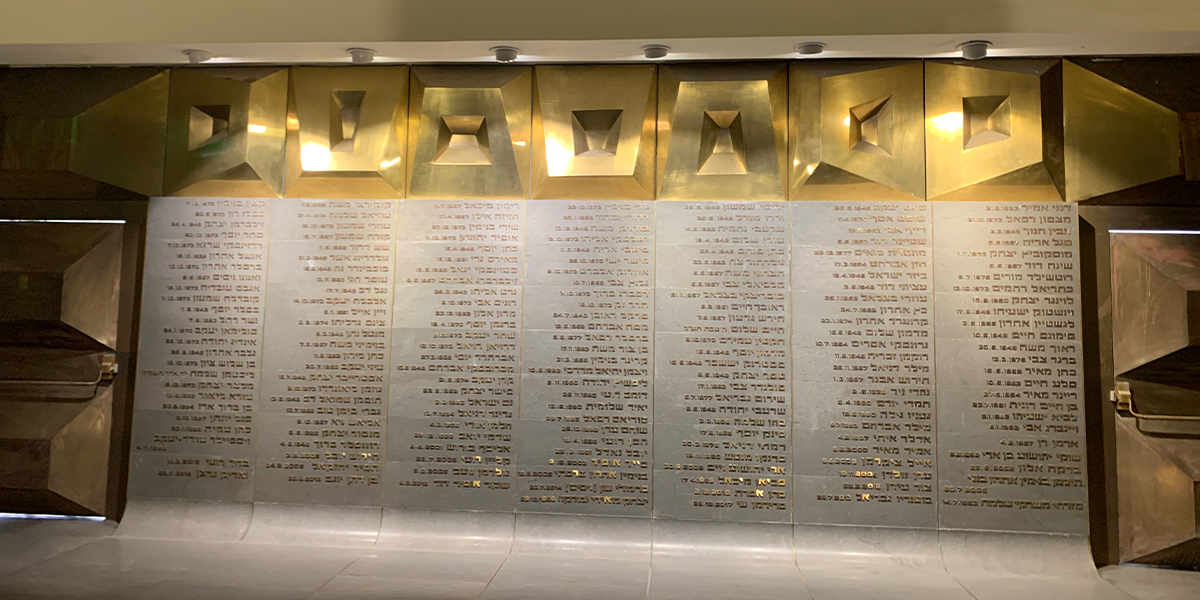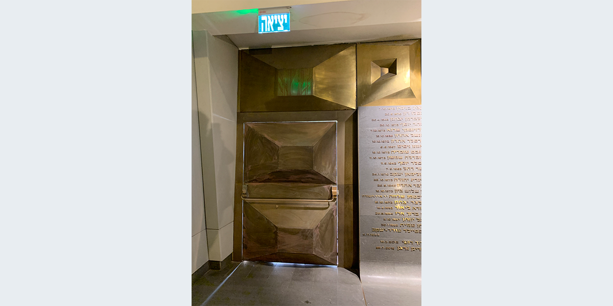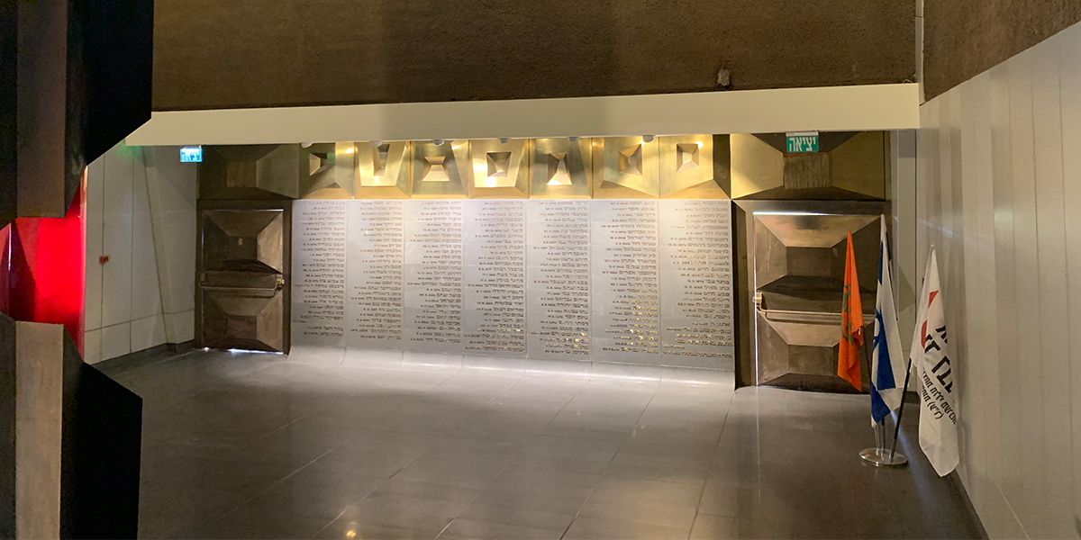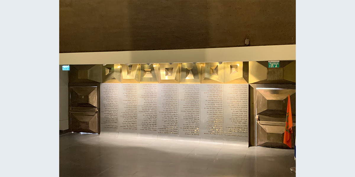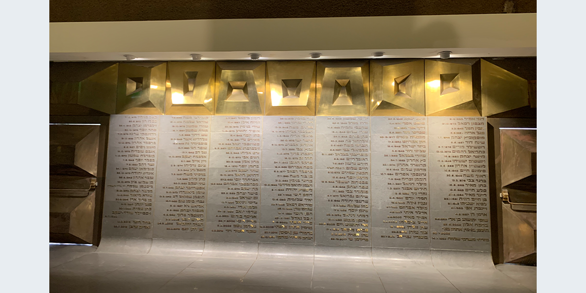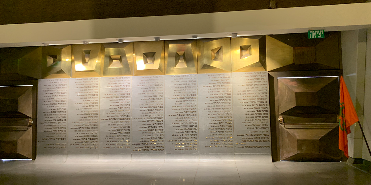 הקיר באולם ההנצחה המרכזי בבית יד לבנים. רצפתו מחולקת לאורכה בפסים ועל הקיר המרכזי לוחות שיש הנראים כהמשך ישיר של הרצפה. על הלוחות שמות הנופלים באותיות זהב. מעל כל לוח מרובע מתכת כסופה, כל מרובע מעוצב בזוויות שונות. במרכז האולם לכל גובהו עמוד שחור אשר במרכזו בוקע אור אדום חזק, כעין צלקת במרכז הגוף.באולם מוצגים ספרי הנופלים, ובהם יוחד דף לכל נופל ובו סיפור חייו ומותו. האתר הוקם ב־1987 בעיצובה של הפסלת אילנה גור, לפי אתר "יזכור".