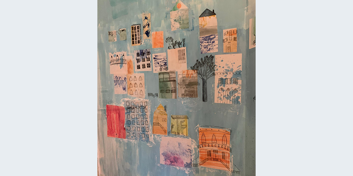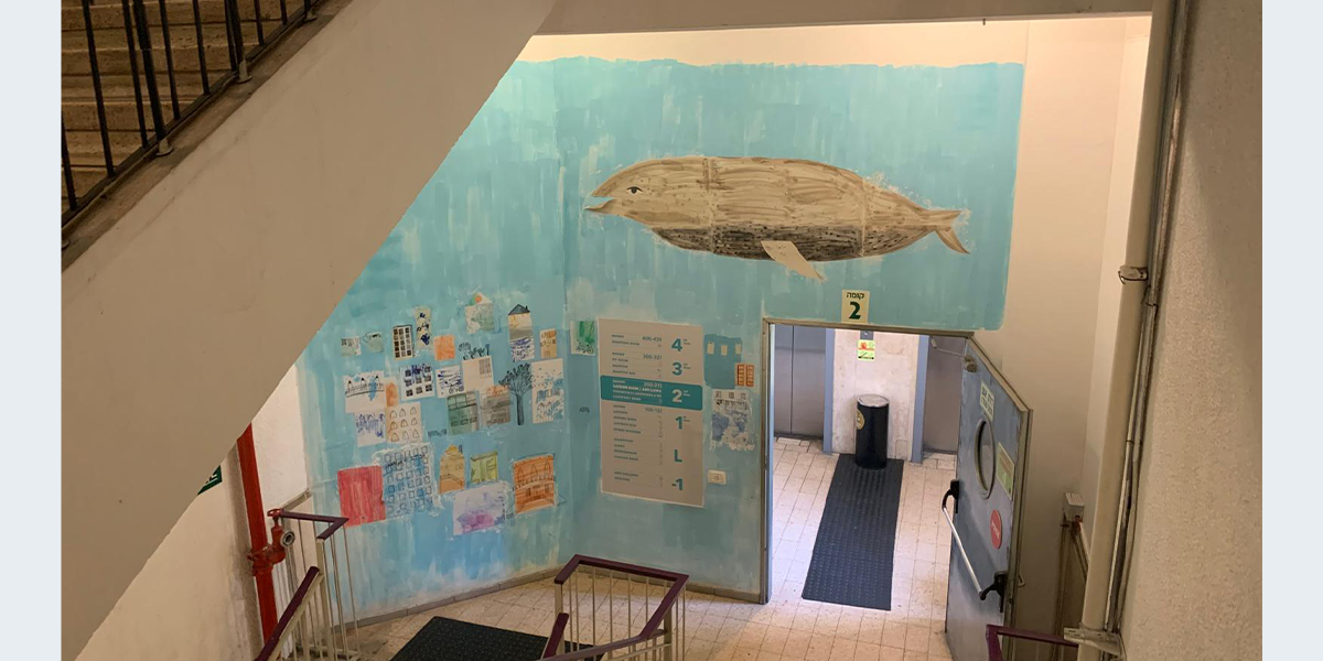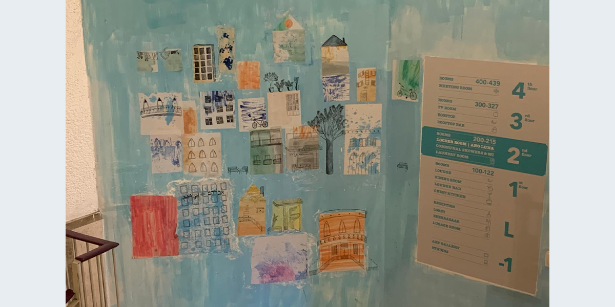 איילה נוהגת להשתמש בטכניקות שונות ומגוונות באיוריה, שלרוב אינם גדולים מפורמט A3. העבודה שיצרה עבור ההוסטל היא ציור הקיר הראשון שלה, ומתוך המחשבה על התמודדות עם קנה המידה יצרה איילה טכניקת עבודה ייחודית, המורכבת ממעין קולאז' של ניירות וטקסטורות המודבקים לקיר, עליהם ציירה במכחול. אילה מספרת: "נולדתי וגדלתי בתל אביב, וכשהתחלתי לחשוב על ציור על קיר ההוסטל היה ברור לי שאני רוצה שיראו את תל אביב דרך העיניים שלי. ראשית, חשבתי על טכניקה שתייצג את תל אביב – מבחינתי הקולאז' מייצג אותה הכי טוב, טכניקה מקושקשת, מבולגנת, מודבקת אחד על השני וקצת מאולתרת אבל גם צבעונית, מלאה חיים, שמחה ואסתטית. כל הבניינים המוצגים צוירו בהשראת בניינים תל אביבים מוכרים יותר או פחות (חפשו גם את ההוסטל עצמו), ויחד איתם מתוארים עוד שני אלמנטים המייצגים את העיר – עציצים ואופניים. אחרי שיצרתי את העיר, עלתה לי מחשבה להכניס אליה משהו לא צפוי, לקחת את תל אביב המוכרת ולהכניס בה קסם. הרגשתי שיש לי אפשרות להגשים לעצמי חלום, שיתרחש מקרה בלתי שגרתי בעיר מוכרת ויומיומית. הלוויתן המעופף החליט להופיע כמעט מעצמו ולמלא לי את המשאלה", מתוך אתר של אברהם הוסטל.
