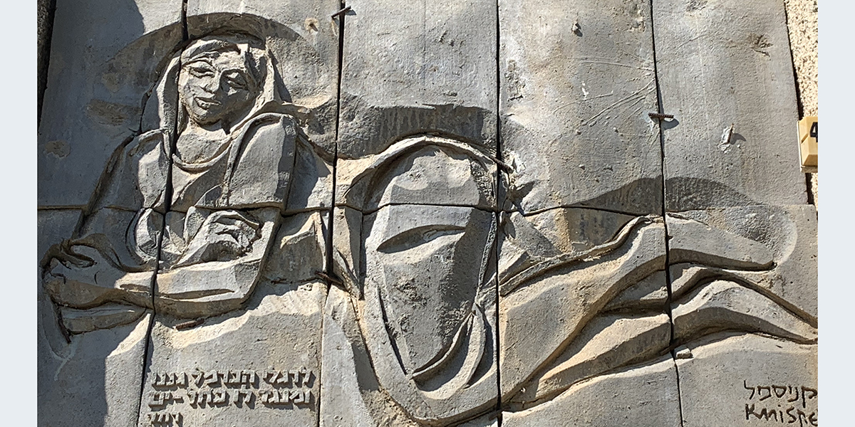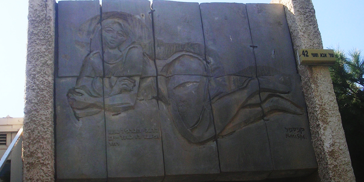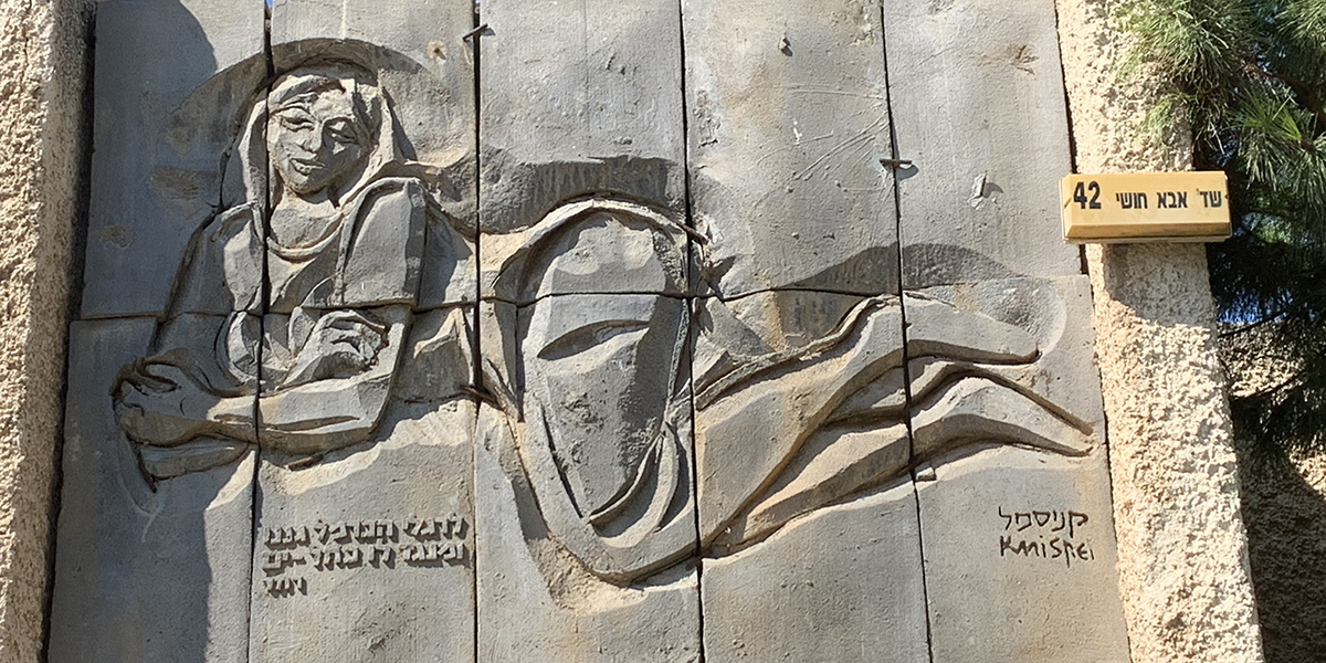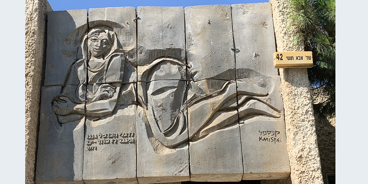 דמות אישה ולידה שורה מן השיר "גננו" של רחל: "לרגלַי הכרמל – גננו ומנגד לו – כחול הים".