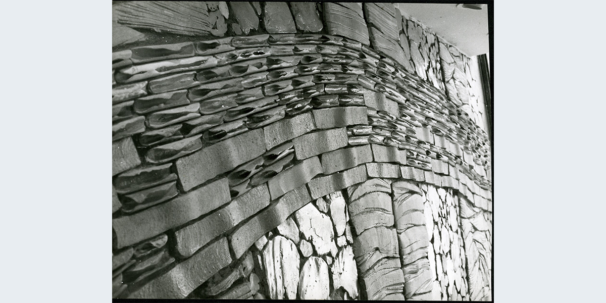 התבליט עשוי מיחידות קרמיקה מזוגגות, ומבטא מארג של זרימה אופקית וצמיחה אנכית.