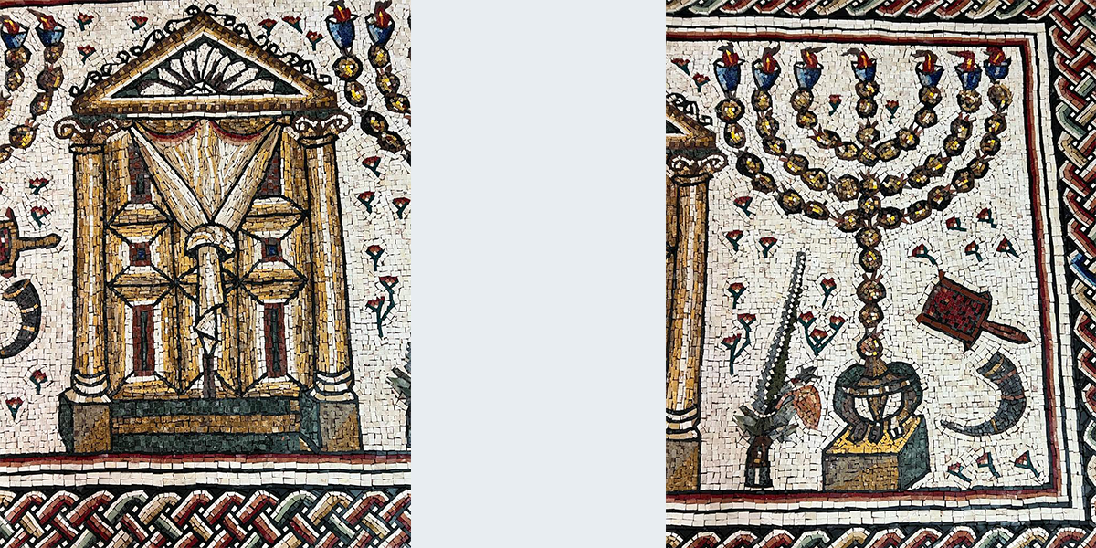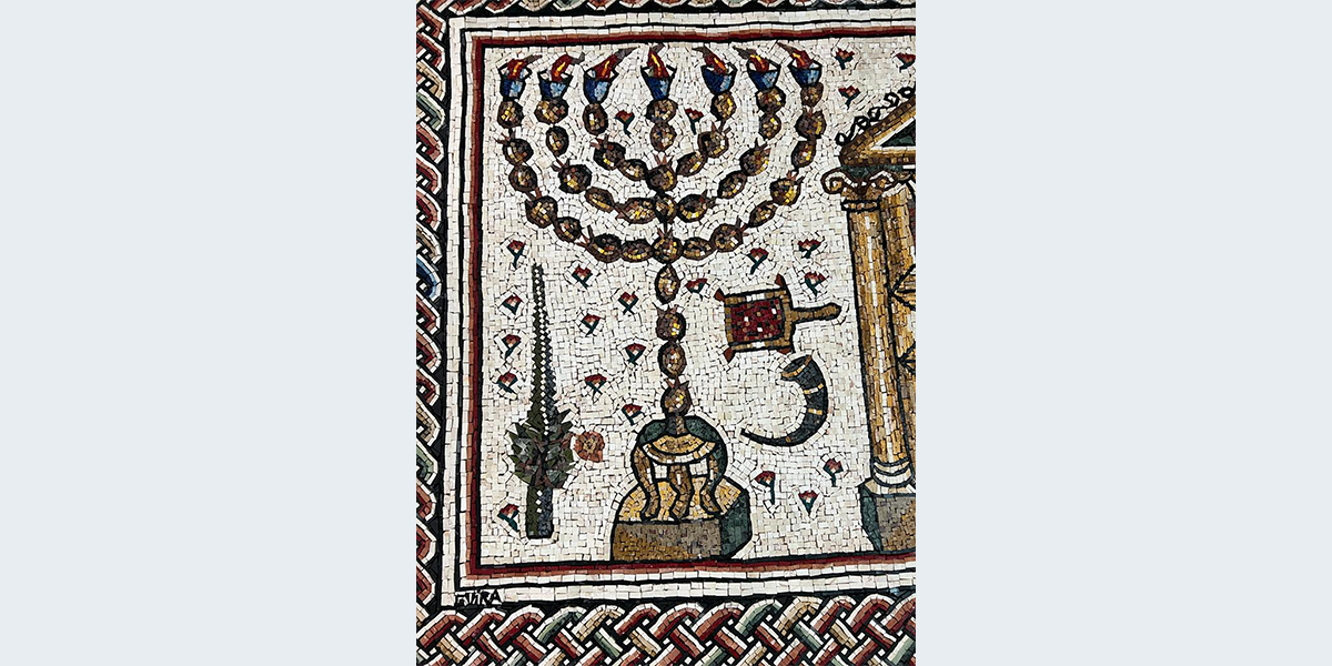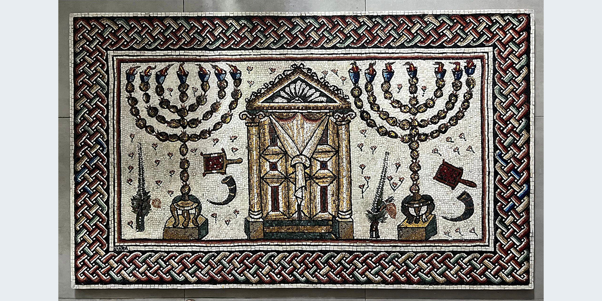 העתק הפסיפס "בית הכנסת של סוורוס" (המאות ה־3 וה־4 לספירה), שנמצא בגן הלאומי חמת טבריה בחפירה הארכאולוגית בשנים 1961–1963. הפסיפס הוצב במשרדו של עוה"ד צבי פשדצקי.