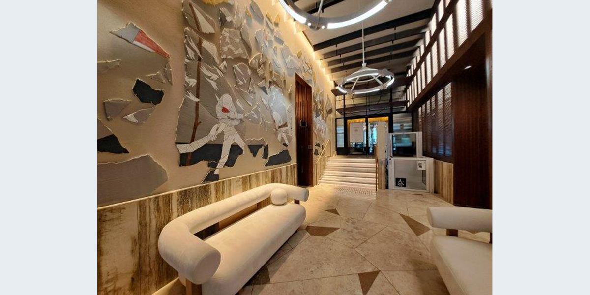 המעבר לחדר ההמתנה למעליות ולמסעדה, מלון The George, ישראל טל 5, תל אביב־יפו //