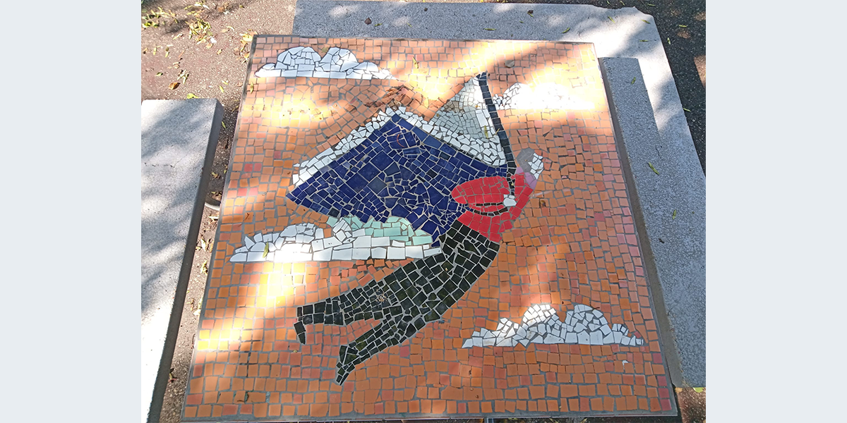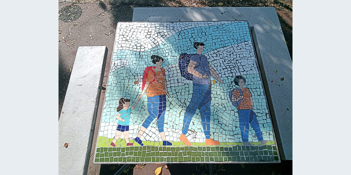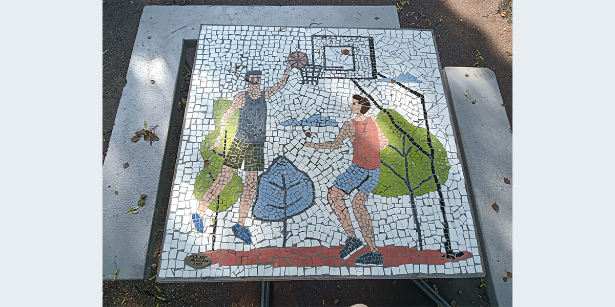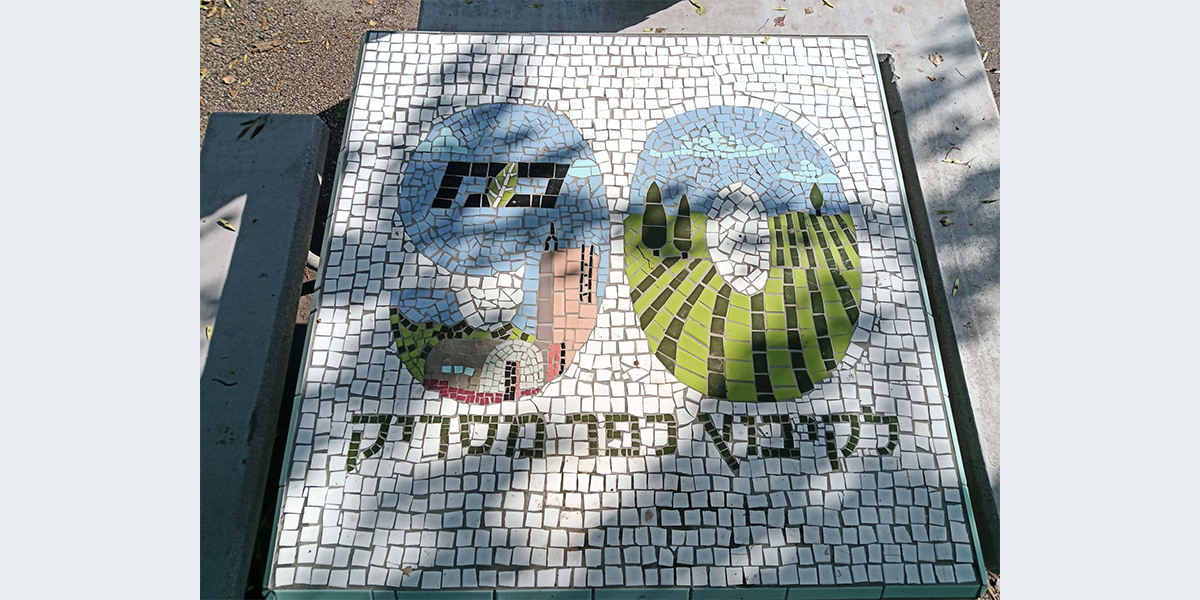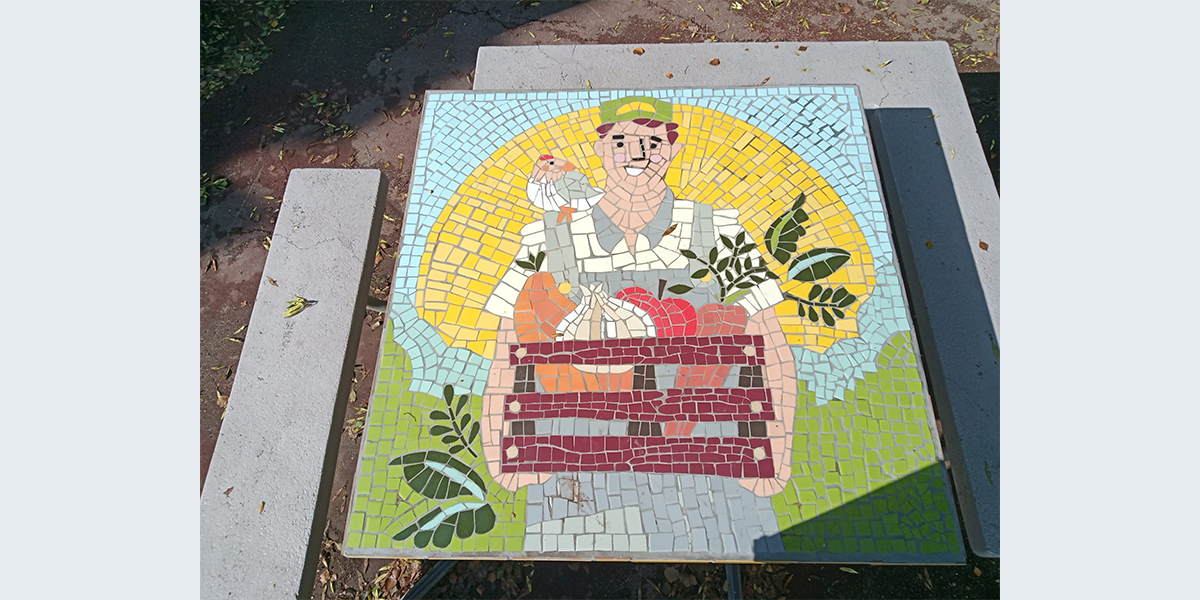 חברי כפר מסריק יצרו את הפסיפסים על שולחנות הבטון בכניסה למועדון בהנחיית האמנית דלית בן־שלום. בתמונות רואים את החקלאי ויבולו, רוקדים ריקודים סלוניים, טיול בשבת בבוקר, ספרים, ציירת, שחקני כדורסל.
